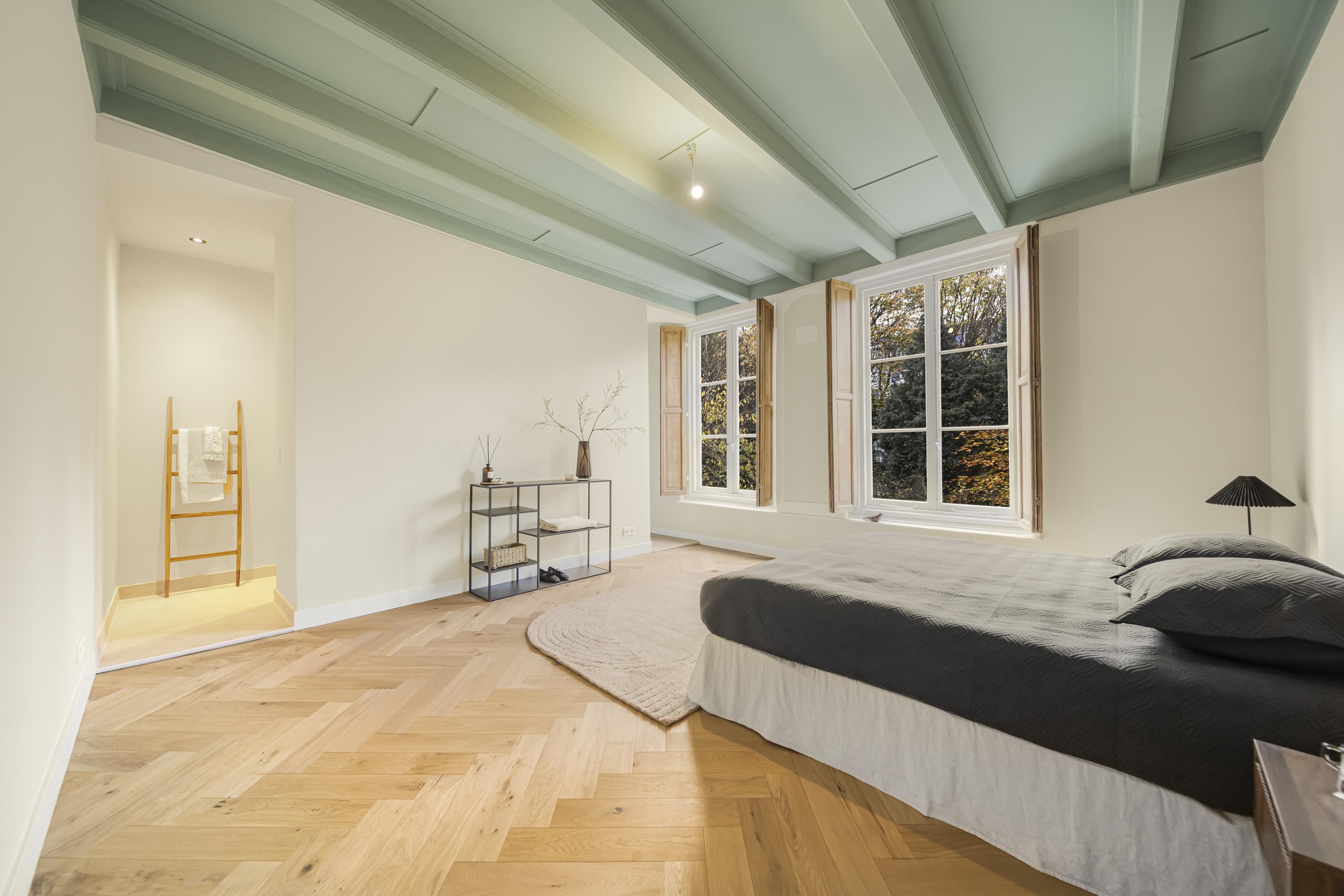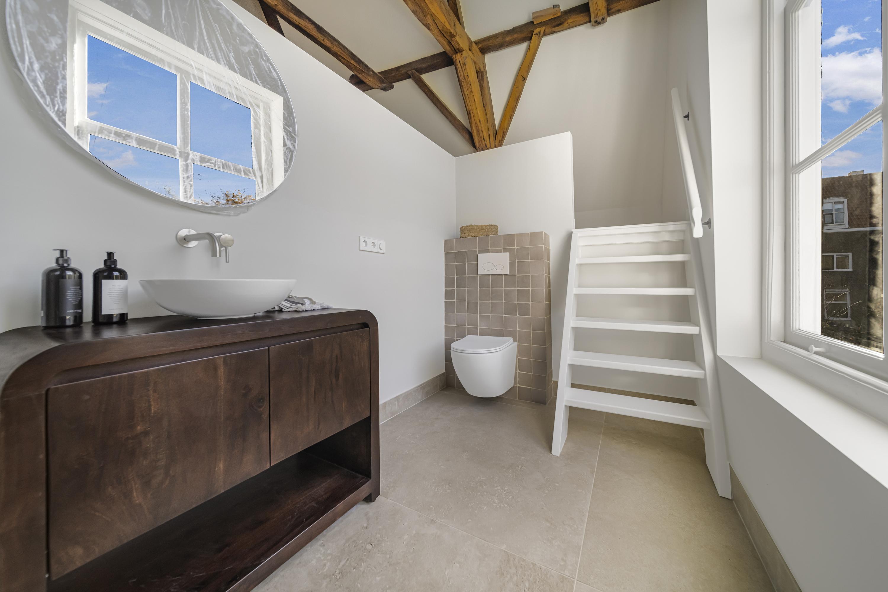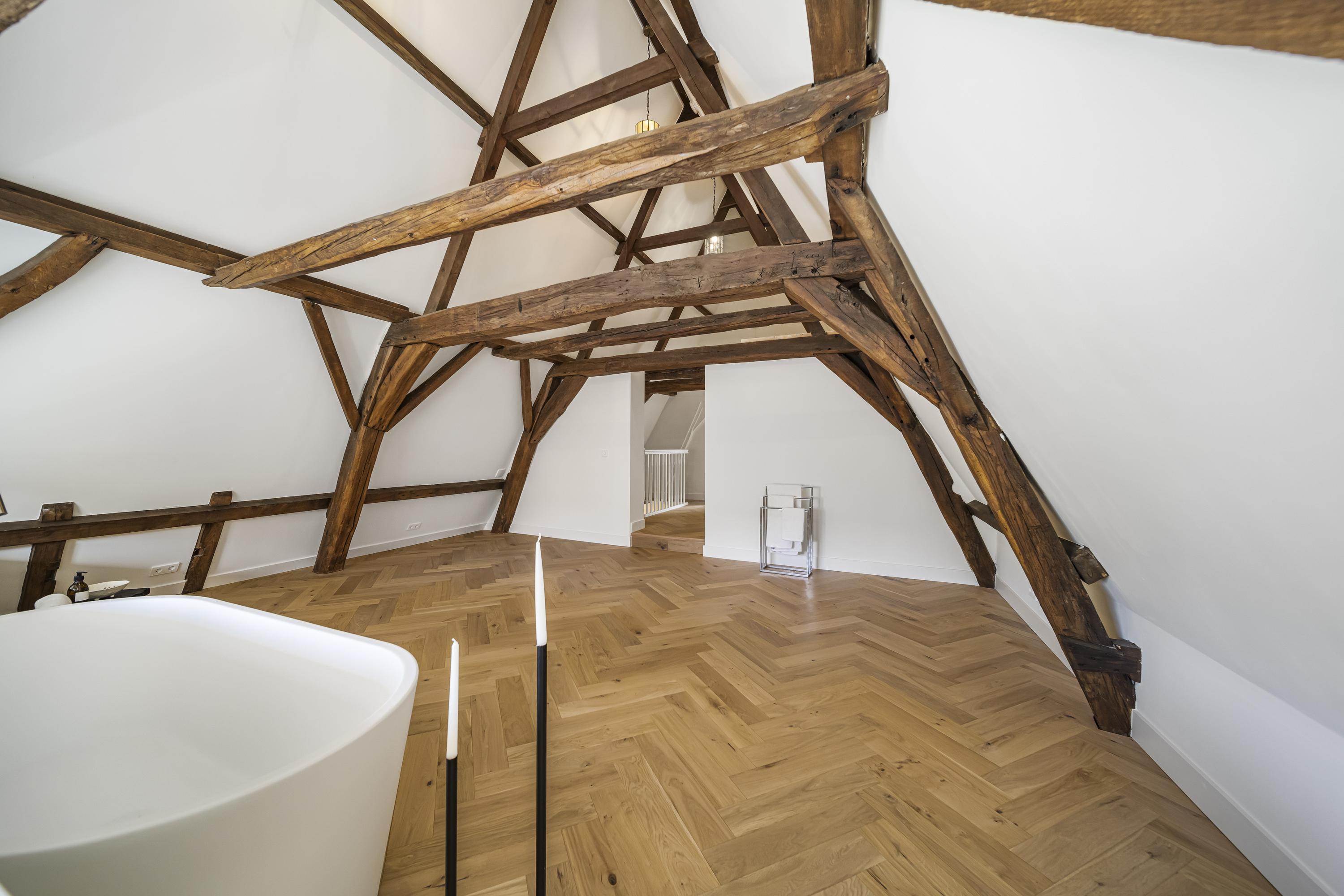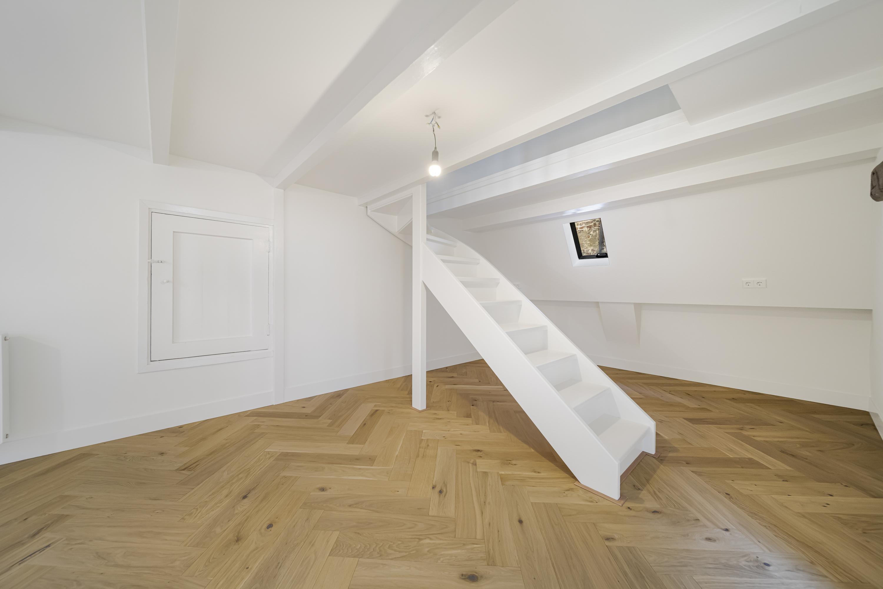 A beautiful floor showcasing the original roof structure. At the front is a bright, multifunctional space. Additionally, there is a large storage room and a toilet. Extra daylight enters through newly installed, high-placed windows above the mezzanine.