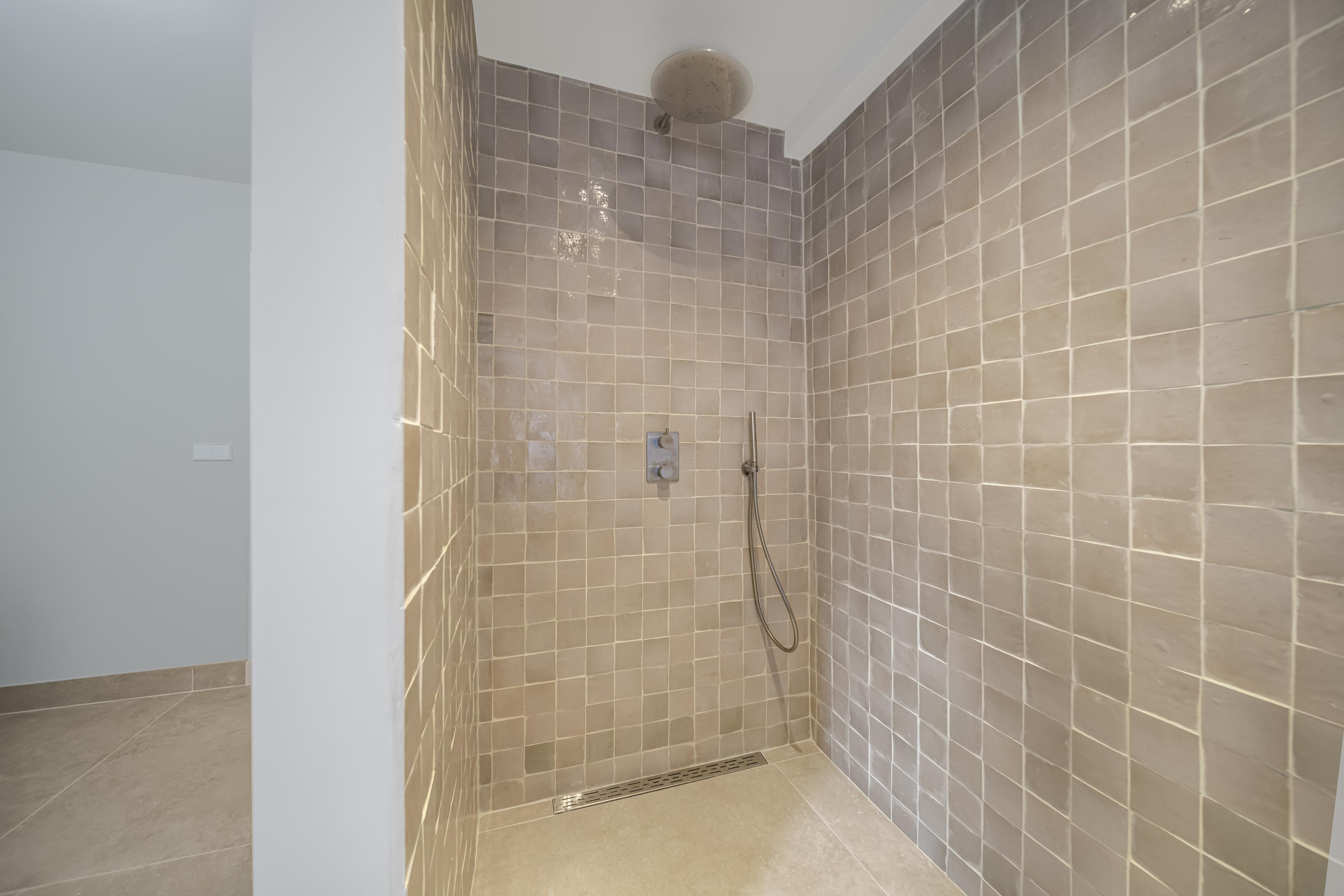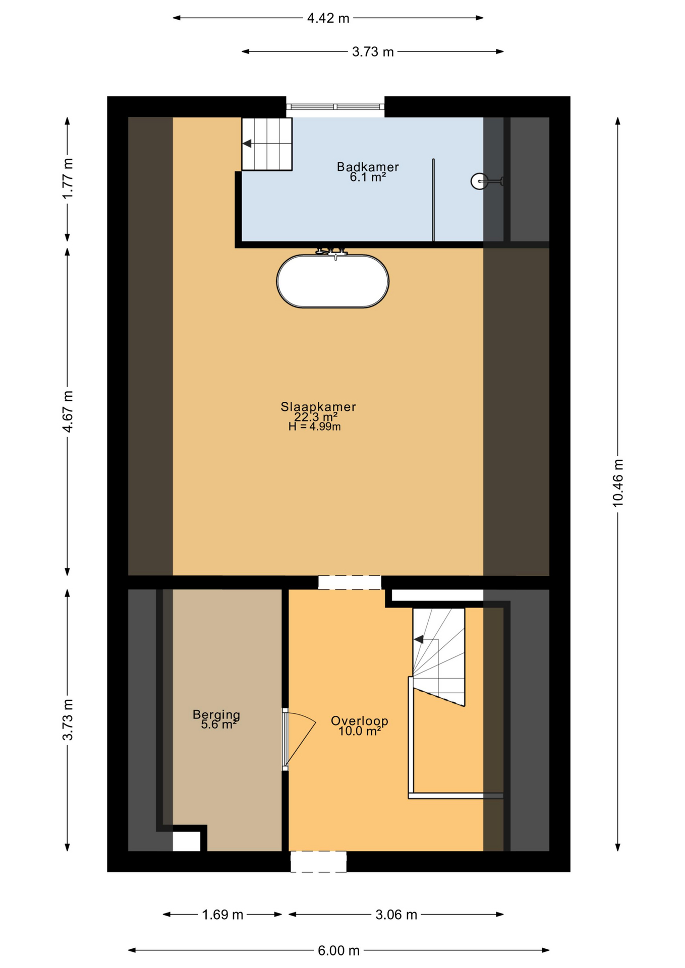 Landing, spacious open area, large bedroom, and access—via a small inner step—to the bathroom with walk-in shower and bathtub.