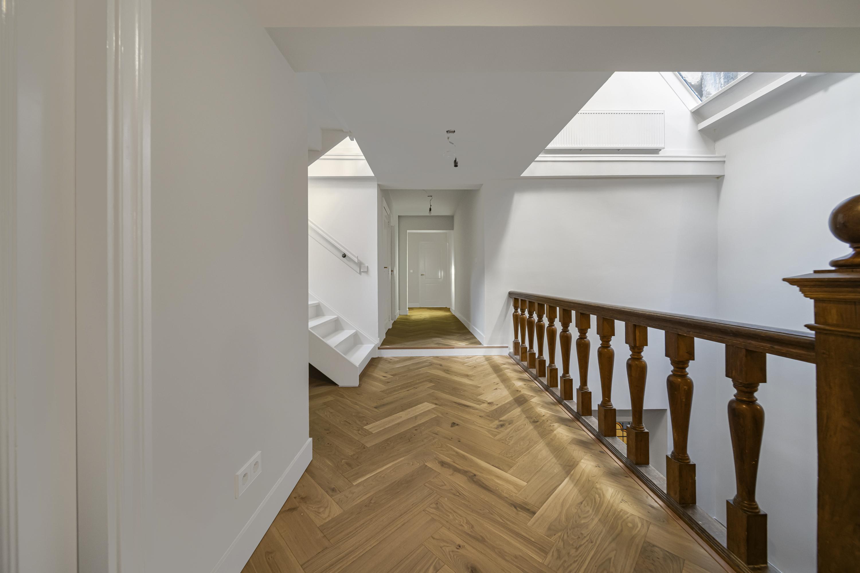 Newly installed herringbone parquet flooring on the ground and upper floors
