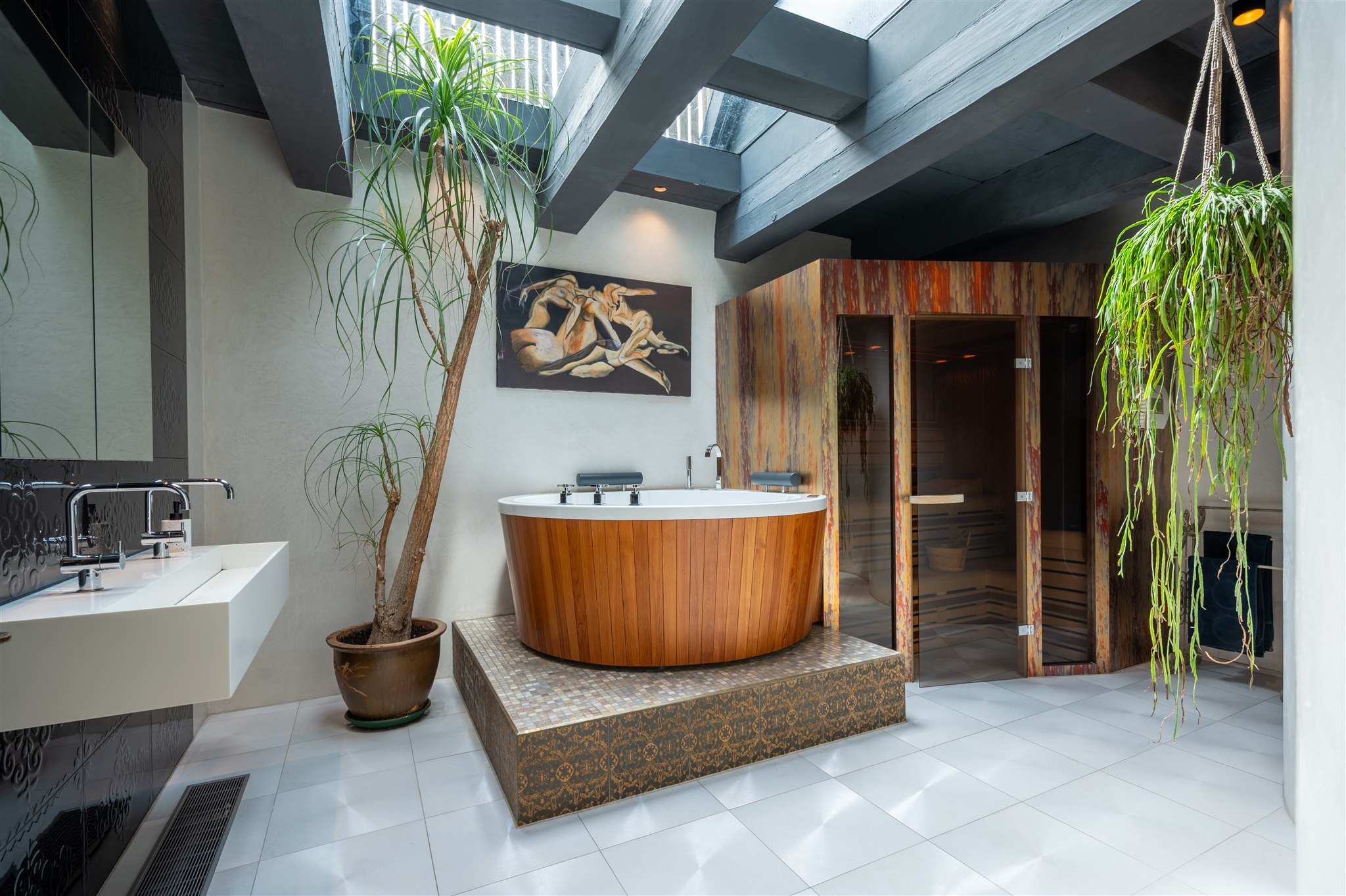 A broad landing opens onto two spacious bedrooms and a spectacular wellness area complete with walk-in shower, double washbasin, round bathtub, and sauna. The architecture is enriched with soft curves and organic shapes that provide a natural flow between the spaces.