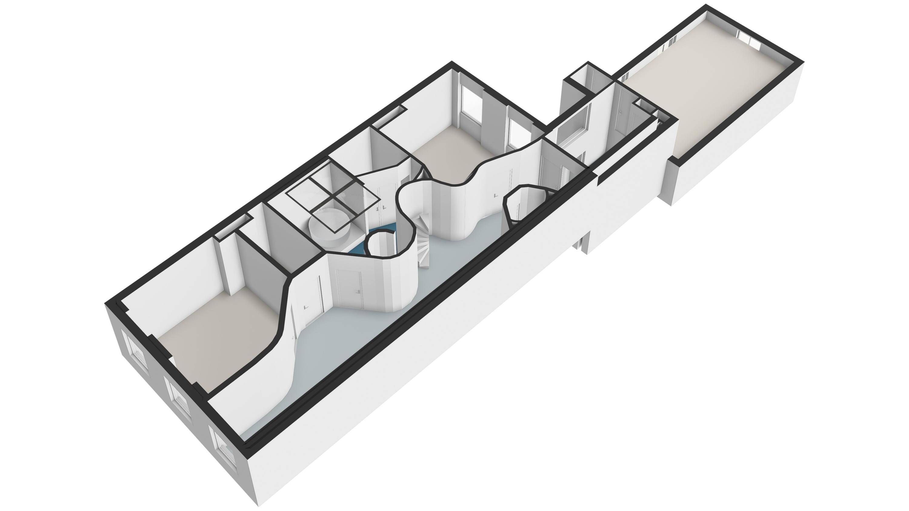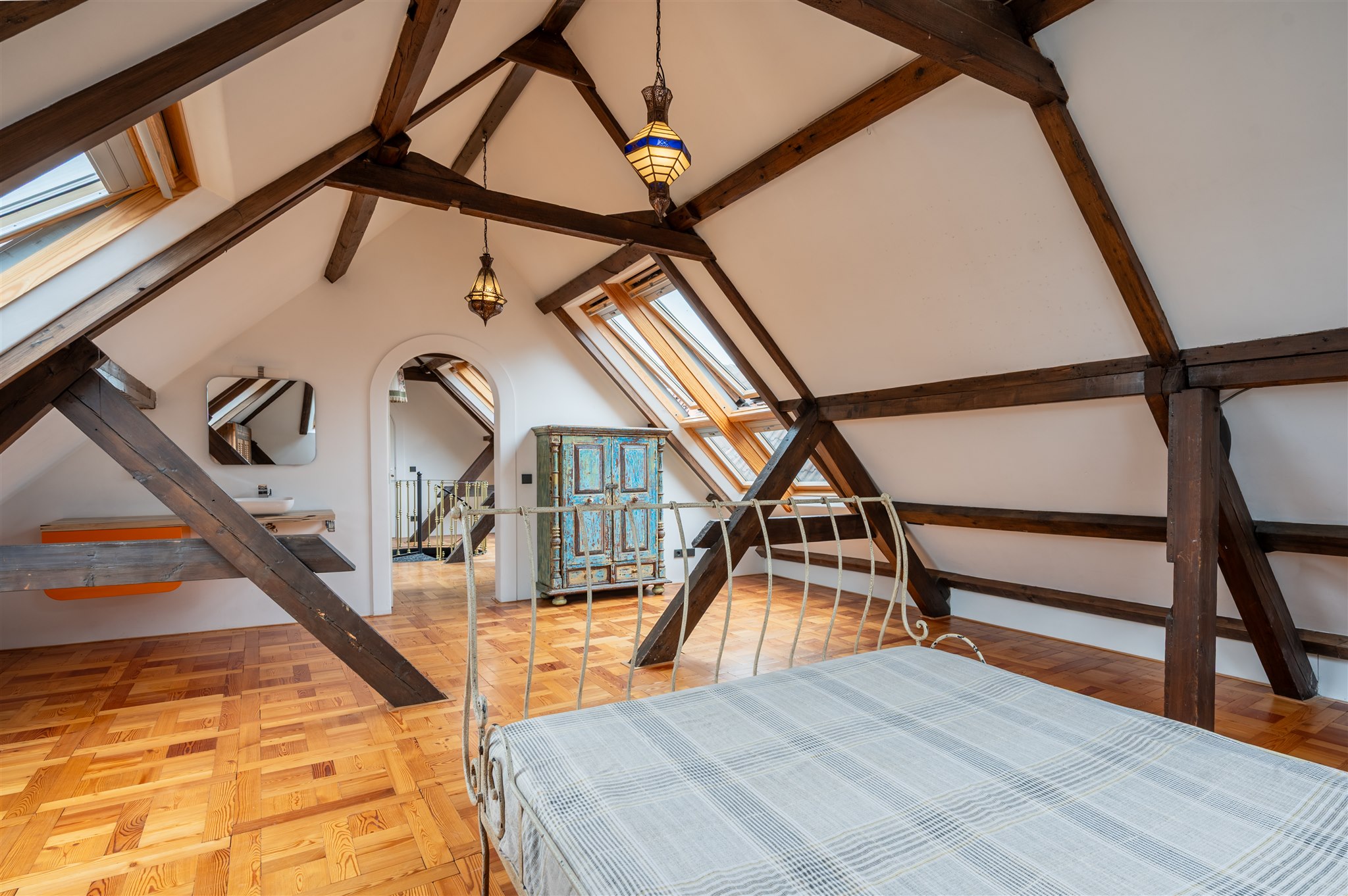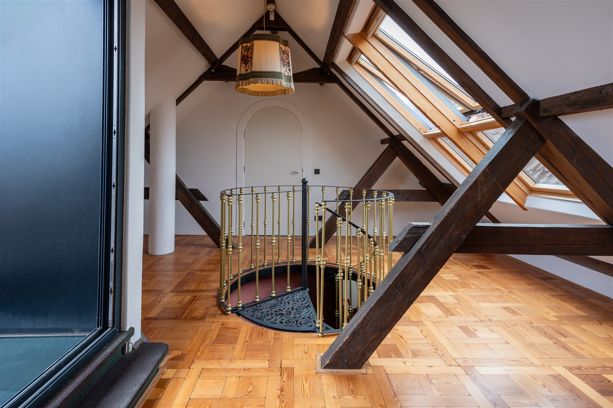 An inviting attic floor with roof windows and ample light, offering a versatile space for work, play, or relaxation. This floor also includes a bedroom with a half-recessed balcony facing south, as well as a technical room housing the heat pumps and solar panel inverters.