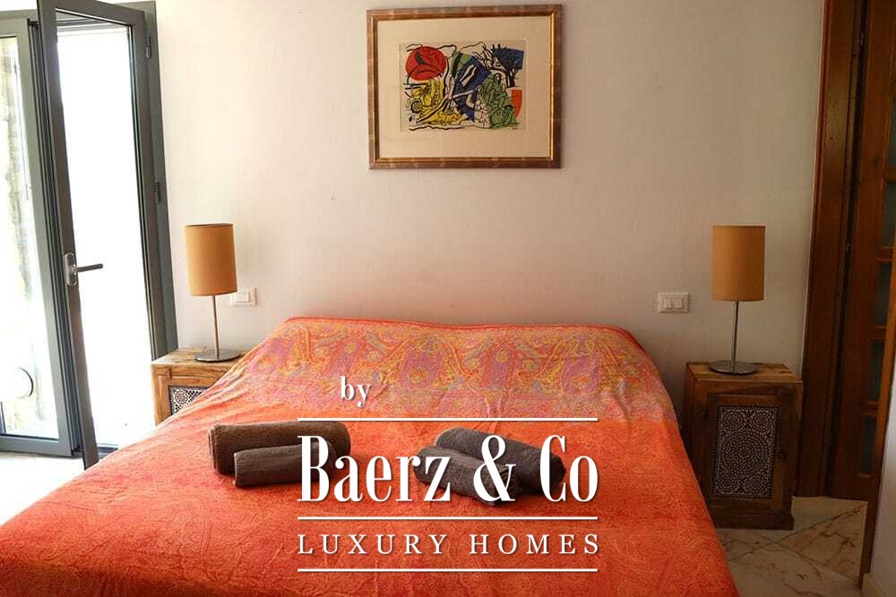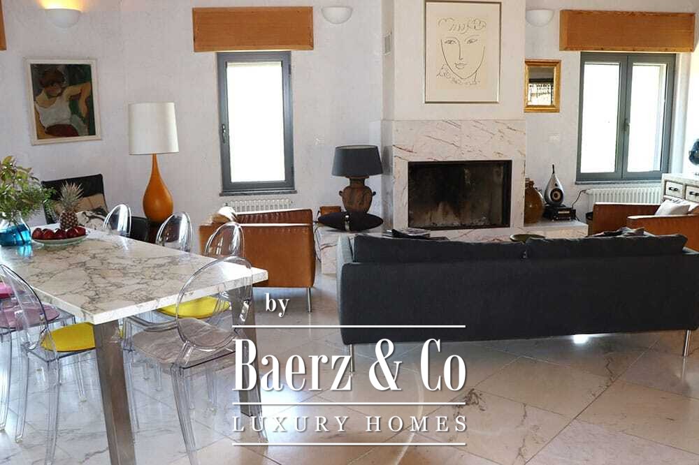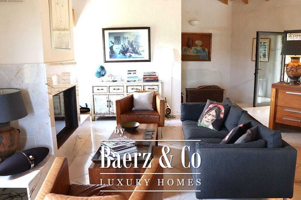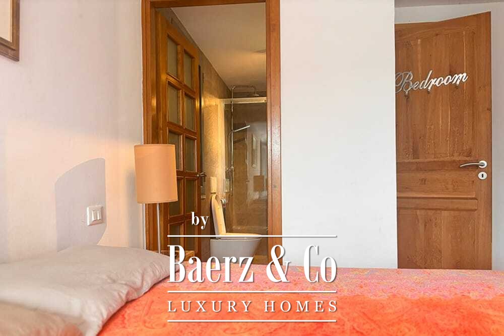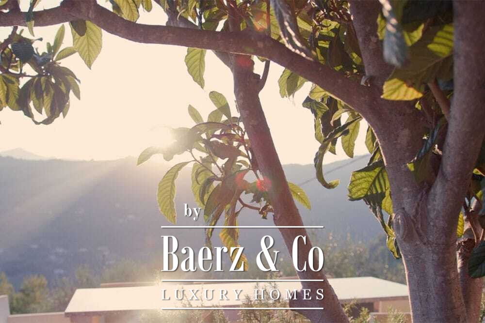 Within its two floors, the villa offers four bedrooms and four bathrooms. Three ground floor bedrooms, each with French doors, open to a lower terrace and mountain vistas. The master suite features a large bath, separate shower, twin marble basins, and designer fittings, defining a sense of sanctuary. The studio bedroom, with private entrance, enhances flexibility for guests or work. Upstairs, a beamed living room with fireplace adjoins a walnut and stainless steel kitchen equipped with premium Miele appliances. High glass doors lead to a lounge with a second fireplace and access to terraces finished with granite tables and Philippe Starck chairs.