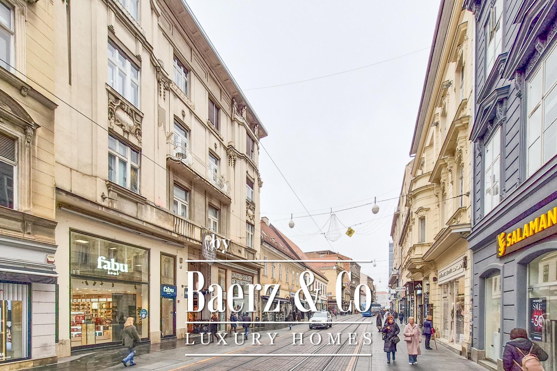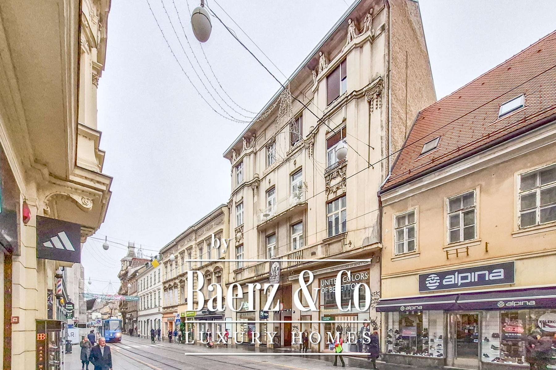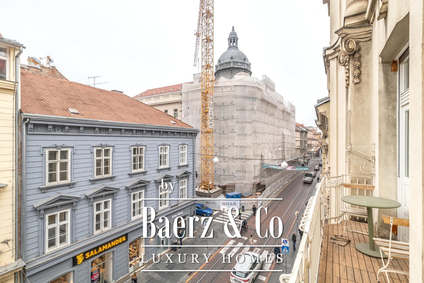Commercial residential property Donji Grad presents 227.32 m² of renovated space set in the heart of Zagreb’s pedestrian zone, only moments from Ban Jelačić Square. This second-floor property sits within an impeccably maintained building, accessible through a representative entrance, with secure courtyard parking for two cars—a rarity in such a central address.