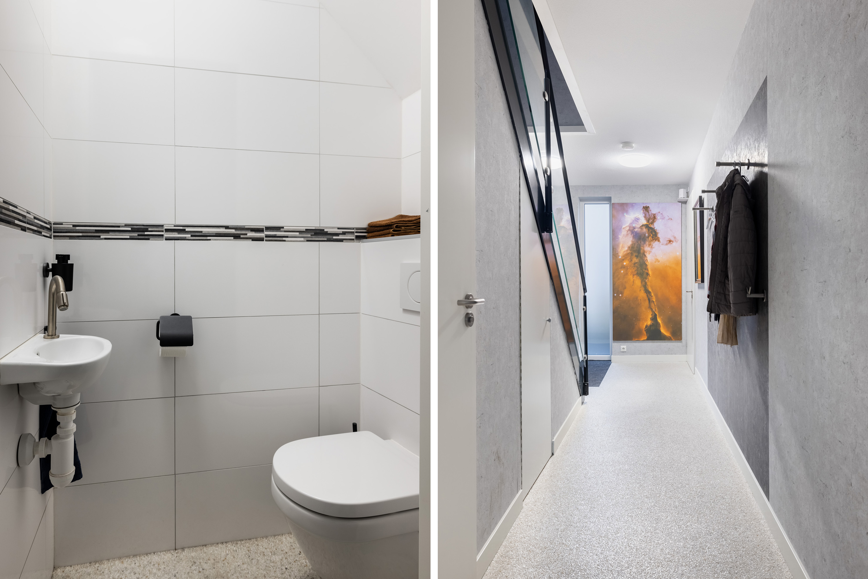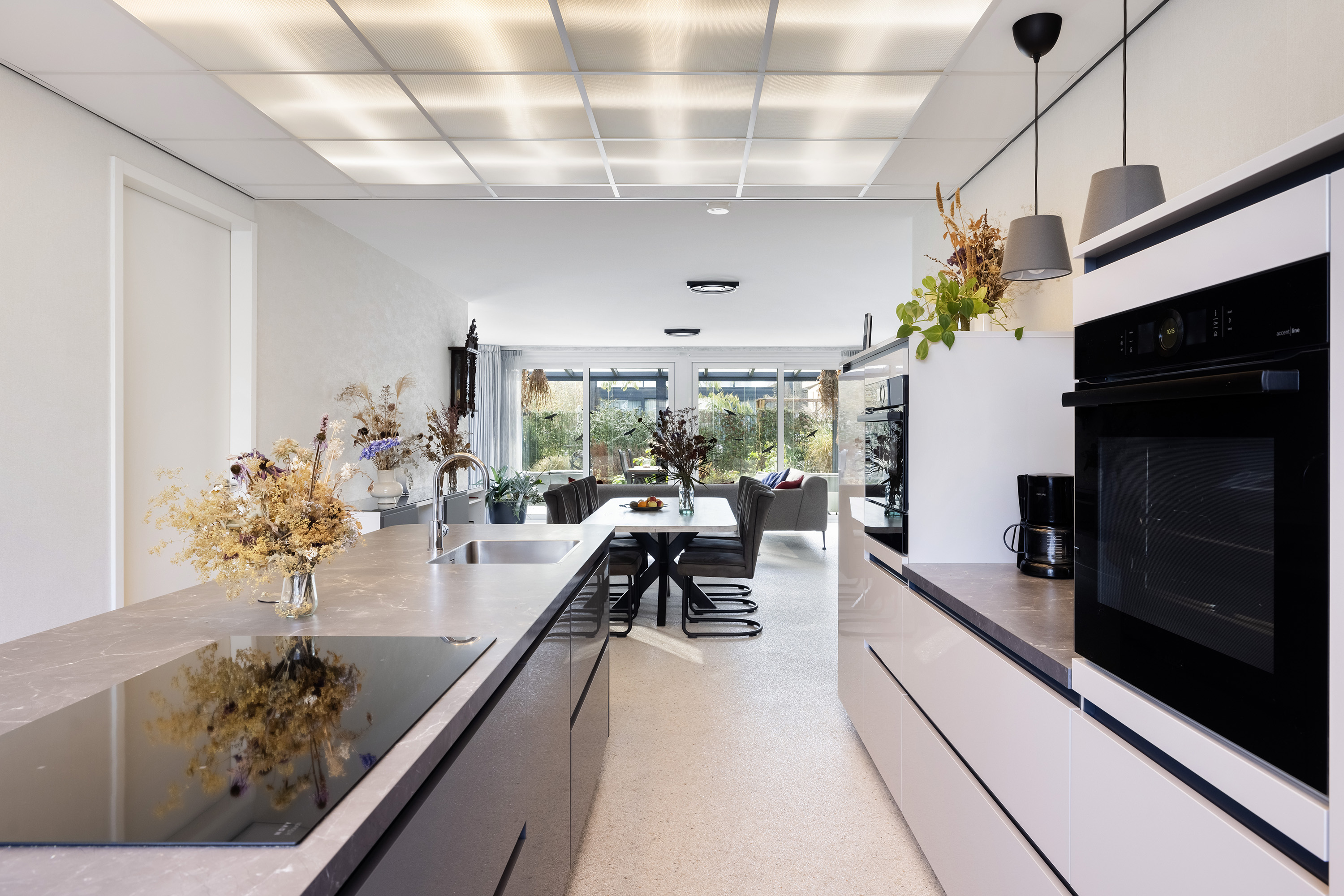 The ground floor is anchored by a spacious living room of 45 m², its large windows welcoming natural light and garden views. The open kitchen is fitted with high-end appliances and a central island, while adjacent spaces include a utility room and a guest bedroom with direct garden access. A Carrara Italian marble-gravel floor adds subtle texture to the main living area, seamlessly leading out to a fully enclosed conservatory—a year-round connection to the outdoors.