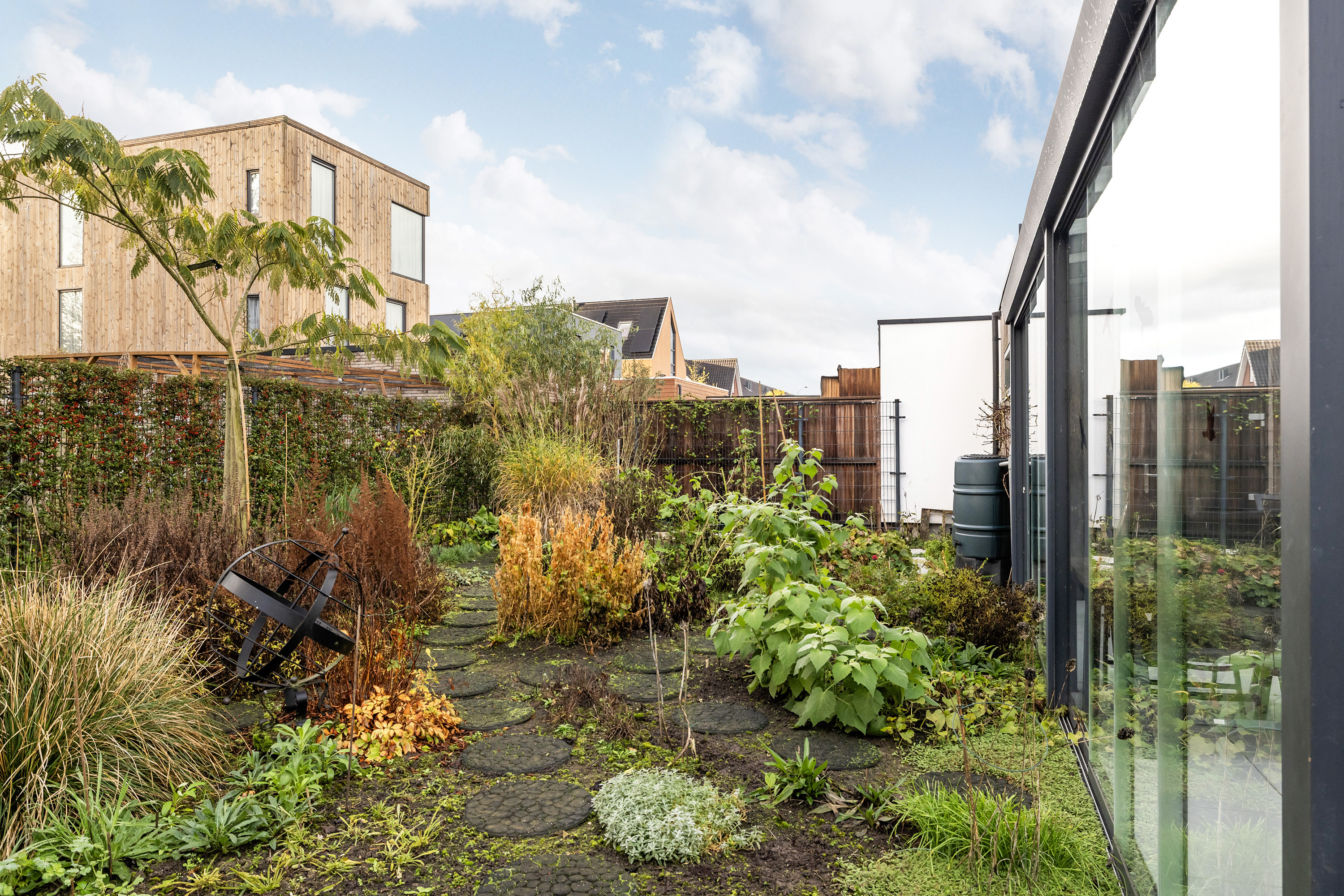 Upstairs, three capacious bedrooms and a second bathroom balance privacy with family functionality. Every detail supports residential ease, from insect-screened windows and integrated sunscreens to the garage with a high clearance, ideal for versatile storage or a home office. The rear south-facing garden spans approximately 145 m², landscaped for seclusion and outdoor living, with terraces, rainwater collection, and a pavilion inviting quiet retreat.