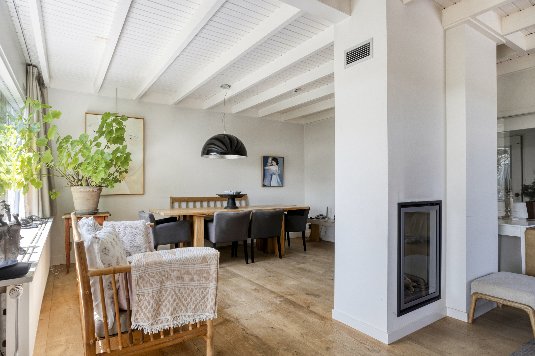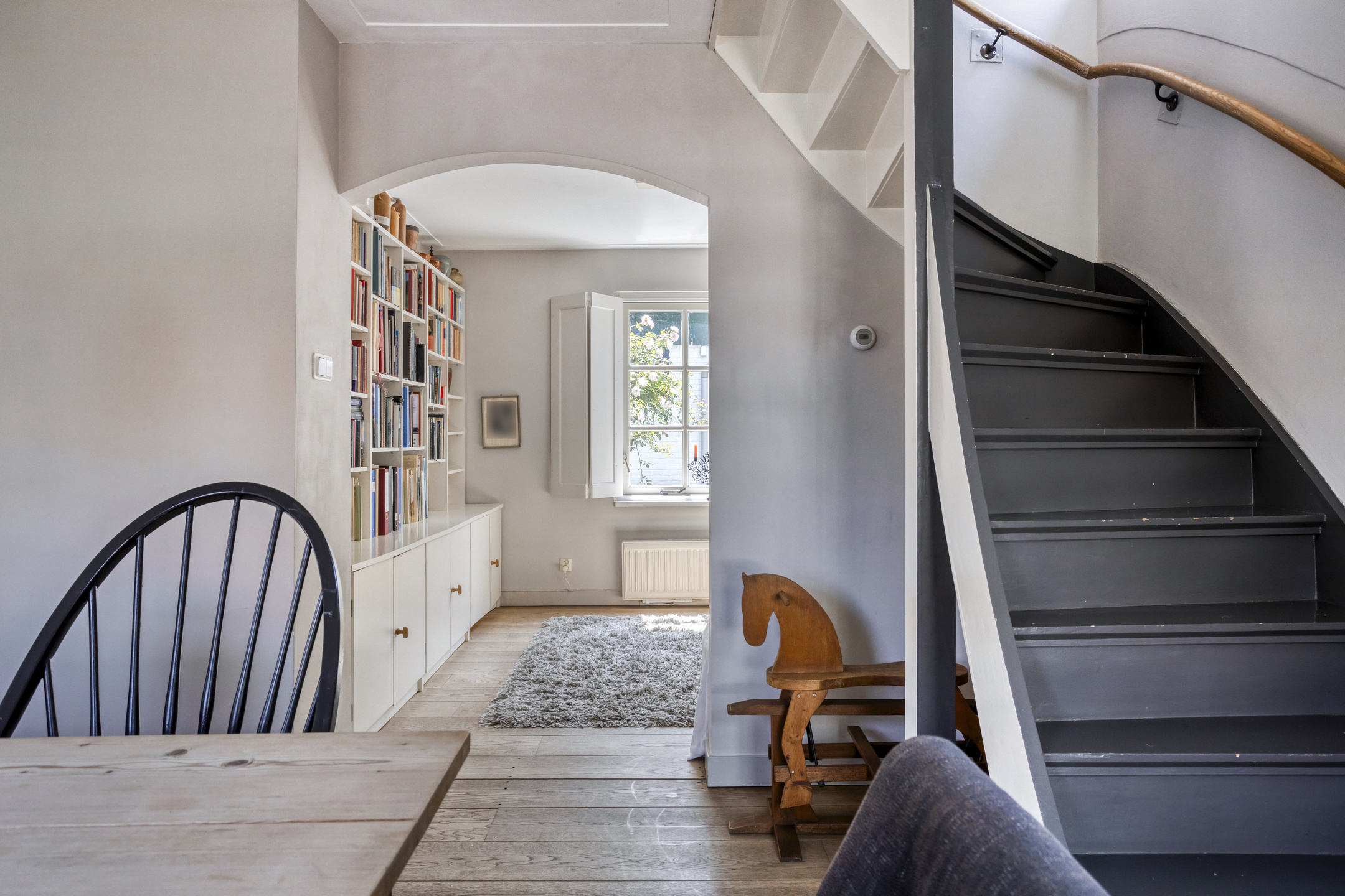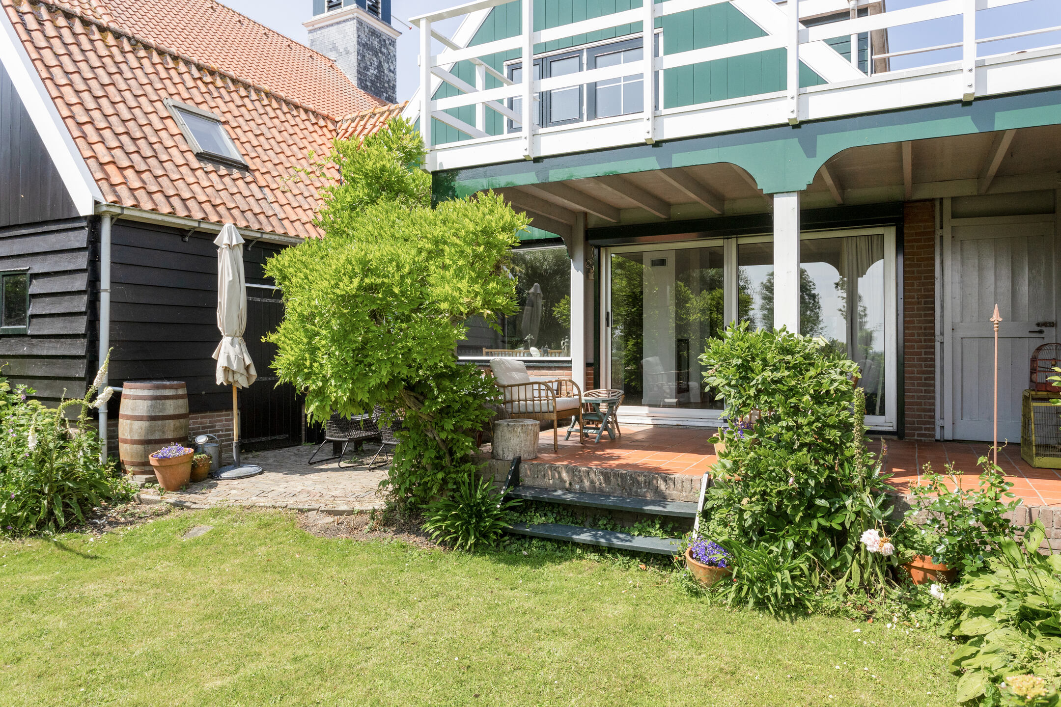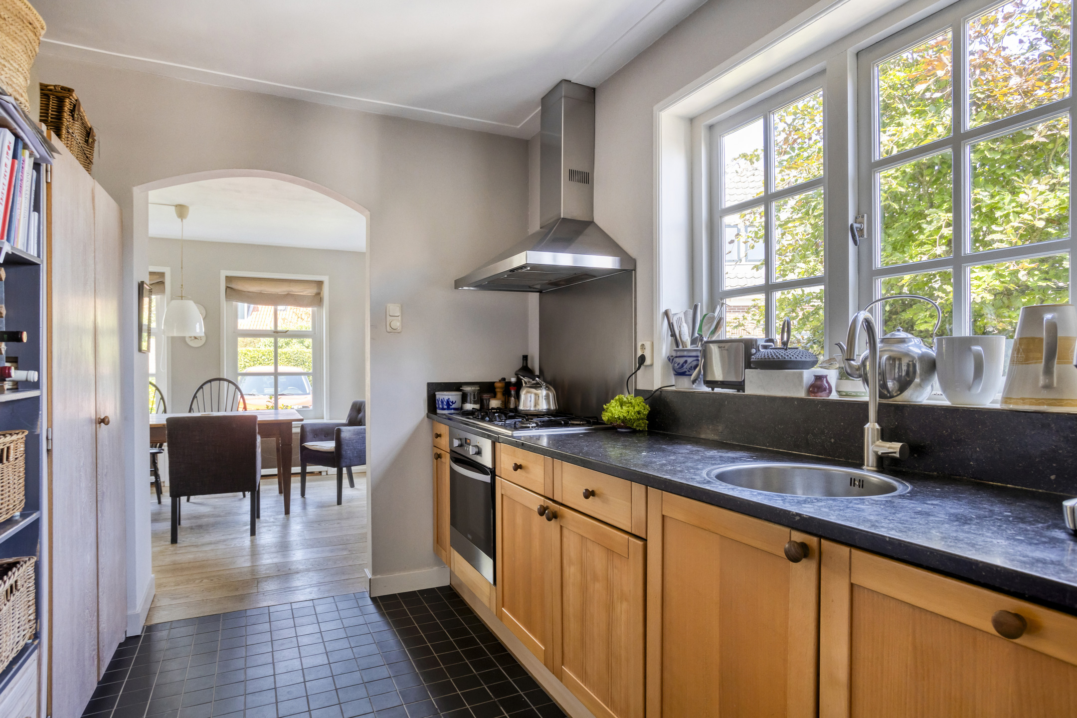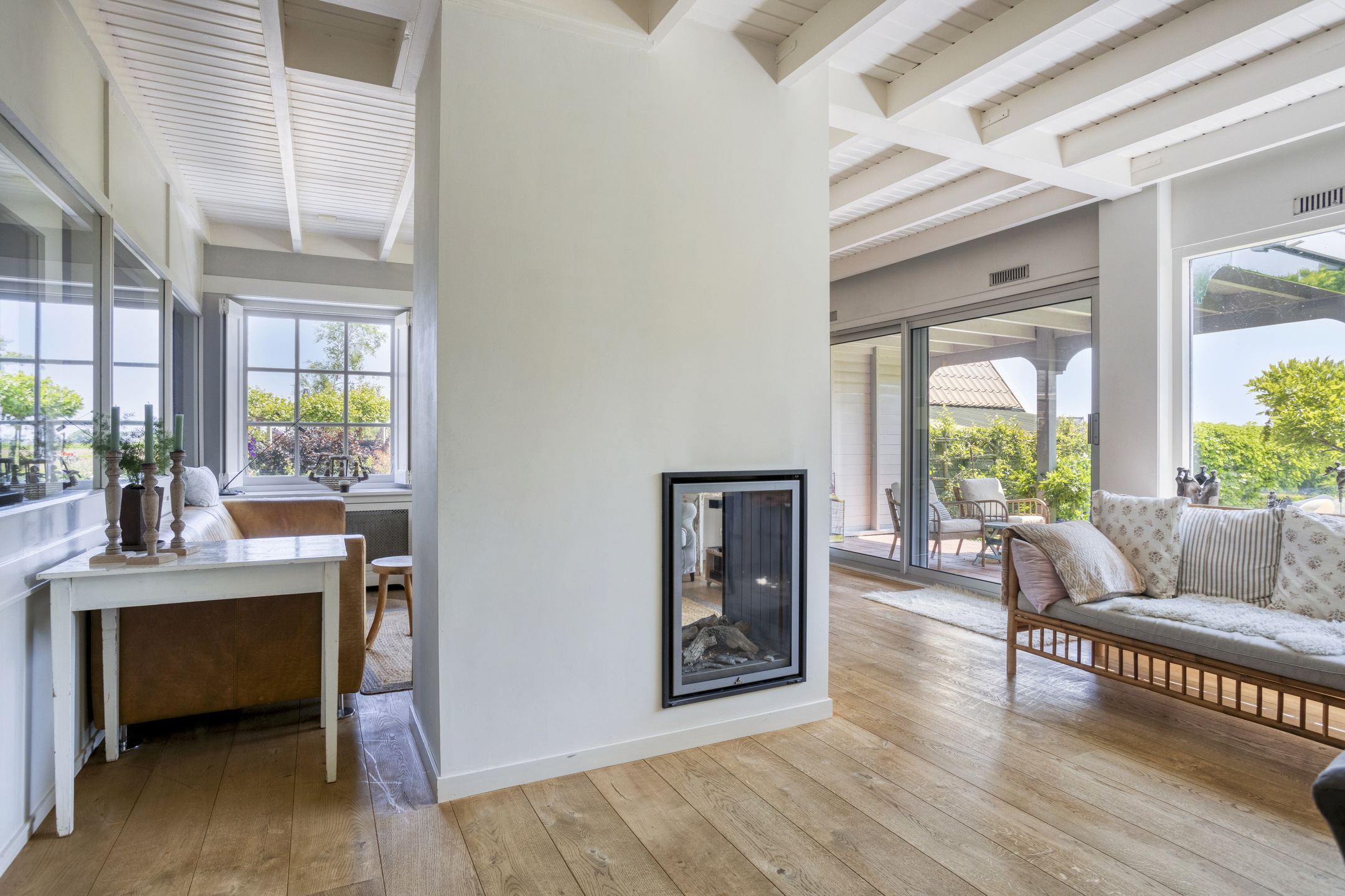 Through the front door, you enter a hallway that leads to the front house. At the front is the semi-open kitchen, equipped with a 5-burner gas hob, oven, dishwasher, and a freestanding fridge-freezer. Adjacent to the kitchen is the cozy dining room with beautiful light from the large windows, forming the warm heart of the home. Next to the dining room is a comfortable living room, which can easily switch functions with the dining room if desired. From the dining room, a staircase also leads to the first floor of the front part of the house.