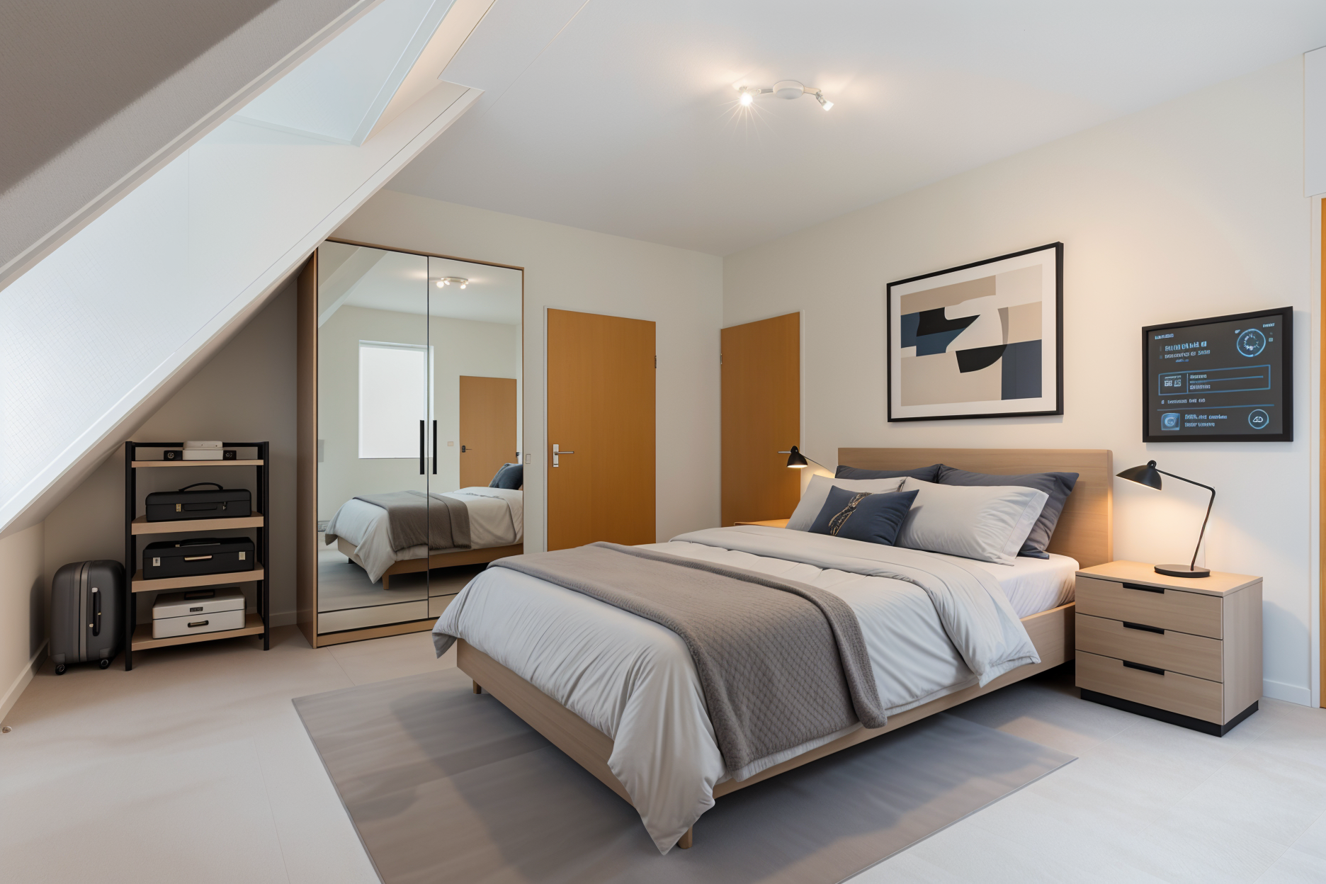 The open-plan kitchen is sleek and modern, featuring handleless high-gloss white cabinetry and a black granite worktop. The U-shaped design offers plenty of workspace and comes fully equipped with built-in appliances: a fridge-freezer, dishwasher, combi-oven, ceramic hob and extractor unit. A skylight in the ceiling provides additional daylight.
