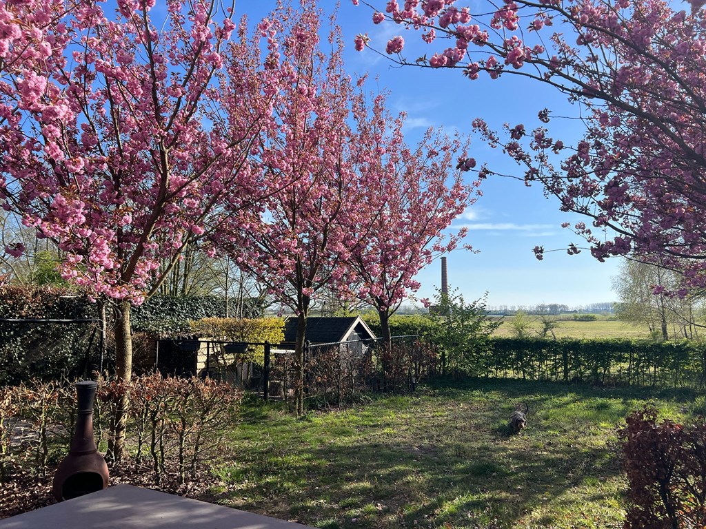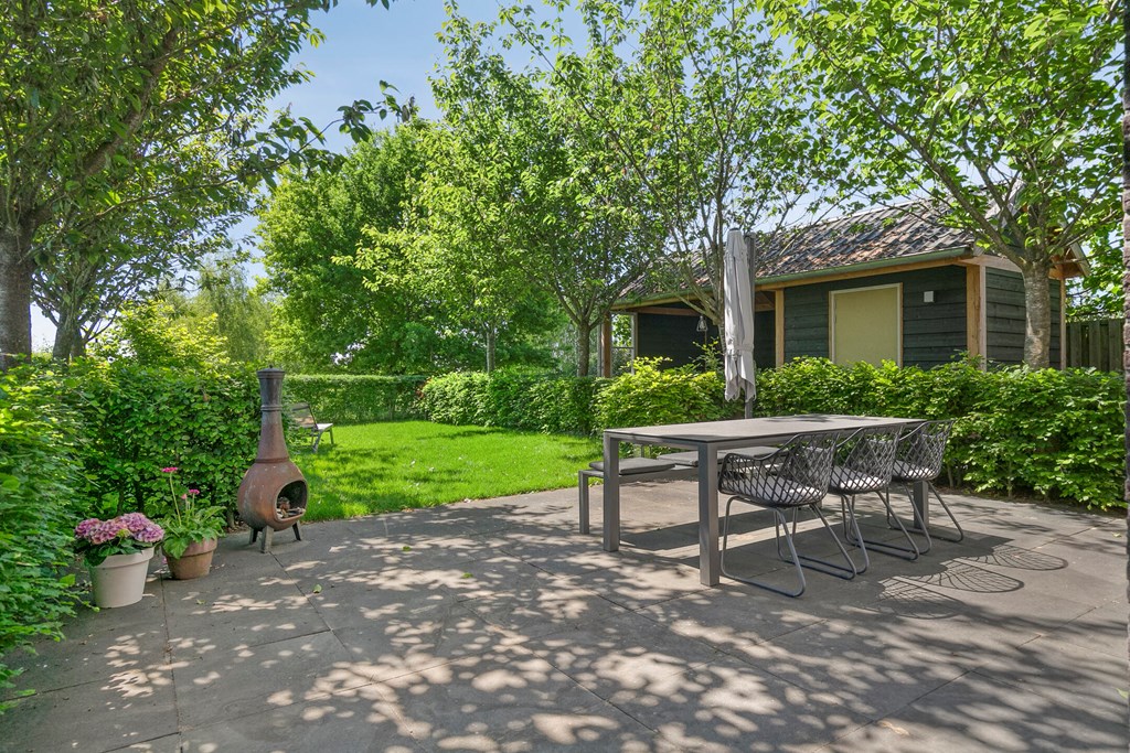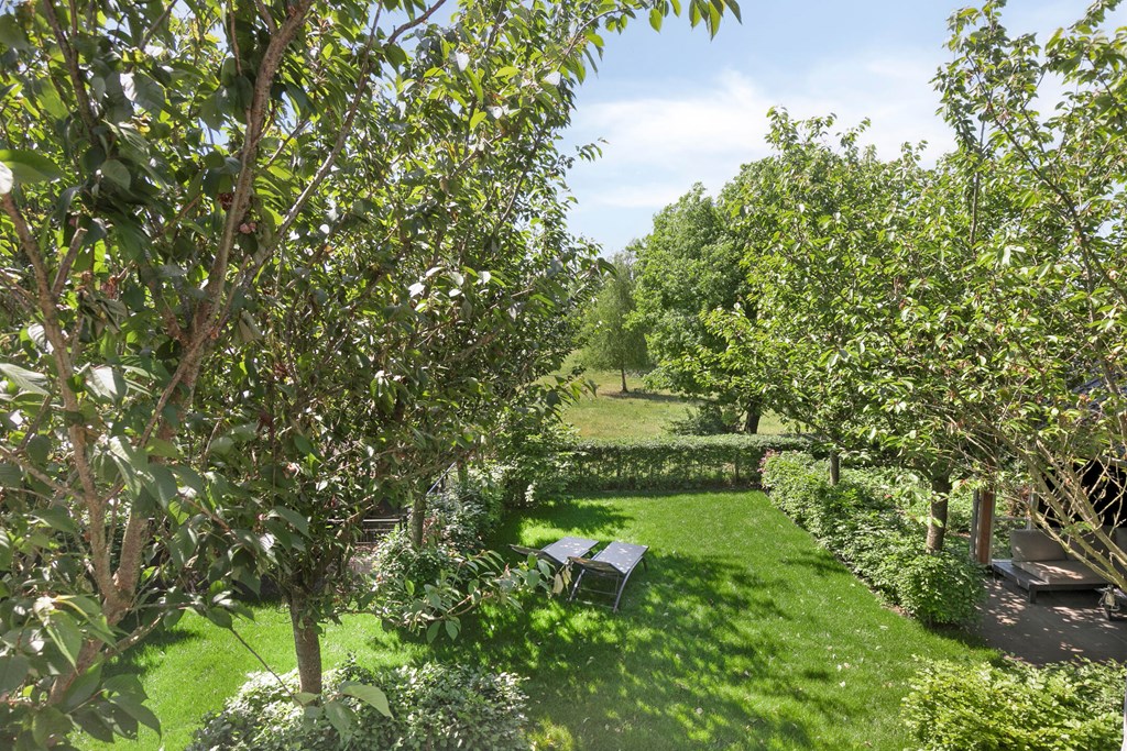 French doors from the living room open to the deep, green back garden that borders the floodplains—the true highlight of this property. The garden is beautifully laid out with a mix of paving and greenery and offers plenty of room for a lounge set or outdoor dining table. Its orientation allows you to make the most of the sun throughout the day. At the back of the garden is a charming covered terrace (with internet connection), perfect for sitting and/or working outdoors even on less sunny days. The garden offers excellent privacy and forms a true oasis of calm.