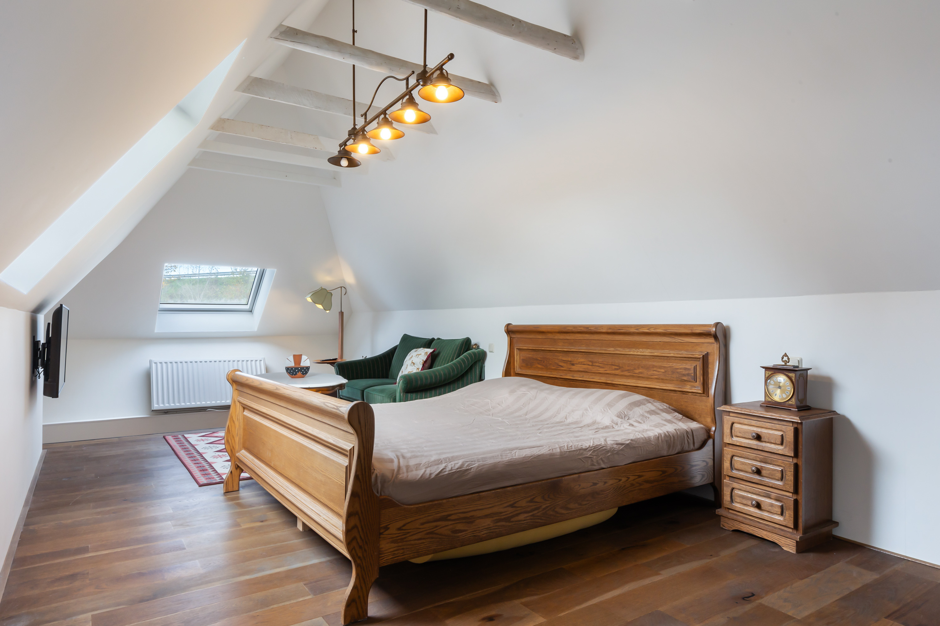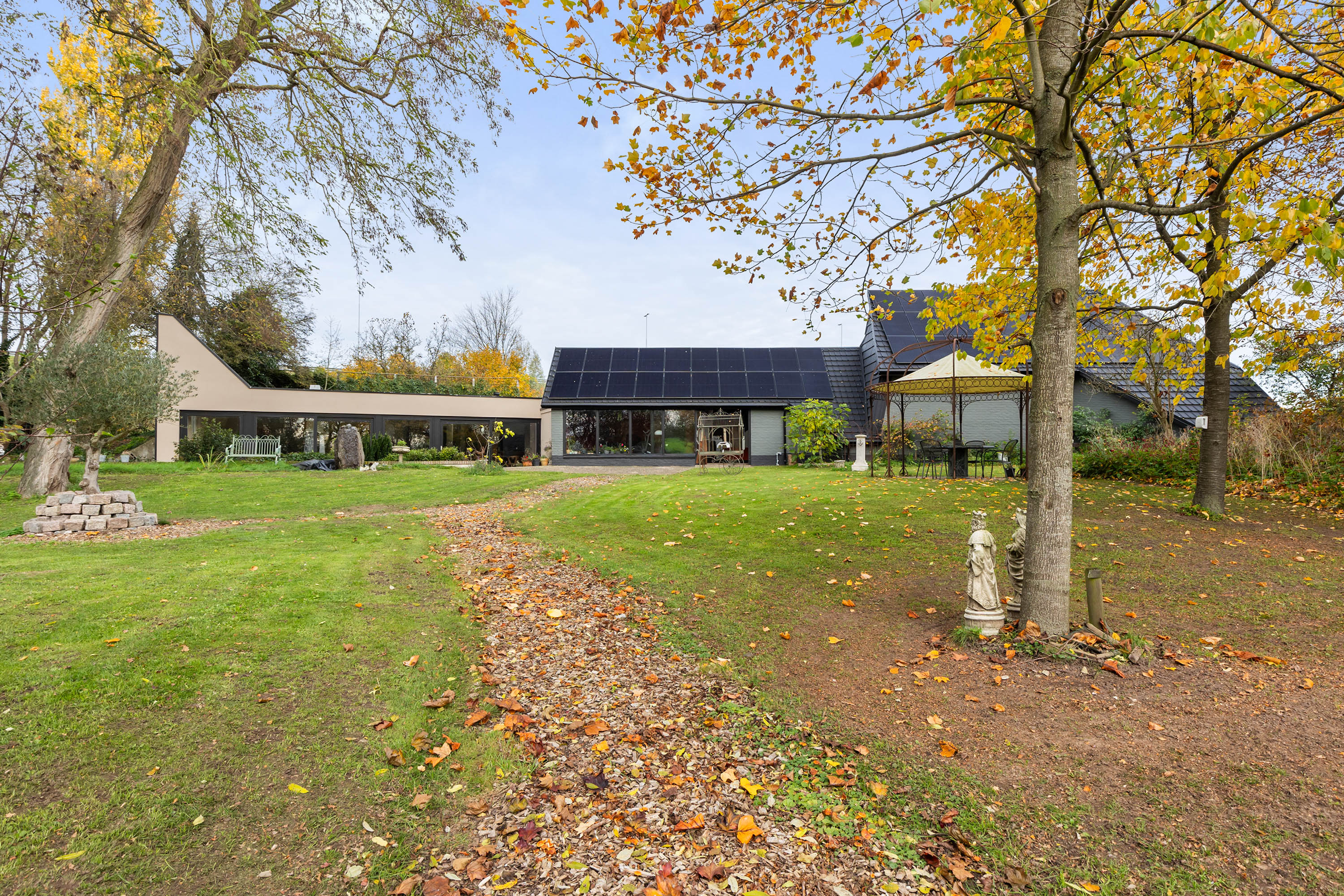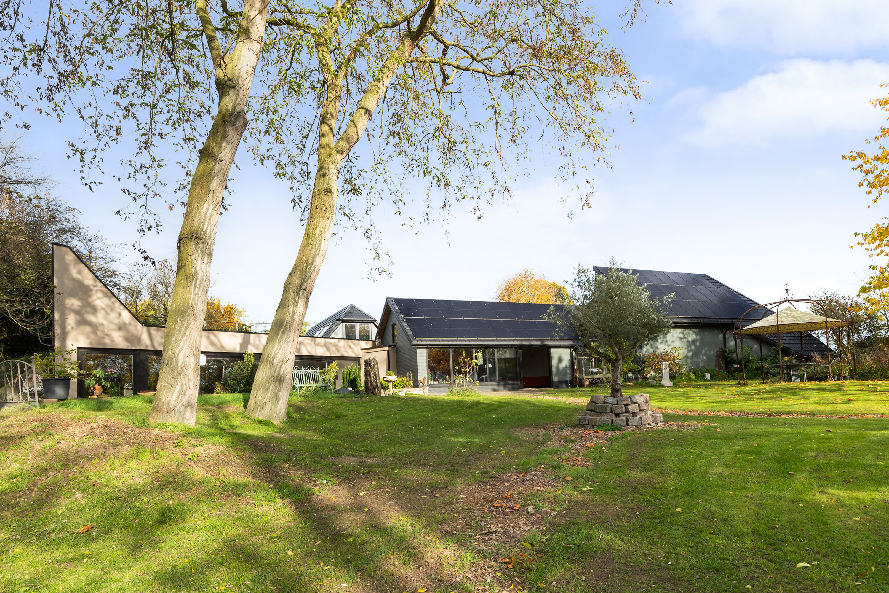 The property is entirely gas-free and exceptionally energy-efficient. A sophisticated Thermia ground-source heat pump with boiler works in tandem with 46 solar panels on the renewed roof. Underfloor heating provides comfortable warmth throughout the living spaces and, in summer, delightful cooling. With a battery upgrade, the system can even form the basis of a net-zero energy concept. In addition, a 76-metre-deep well with its own purification system supplies independent drinking water, offering a fully self-sufficient and sustainable way of living.