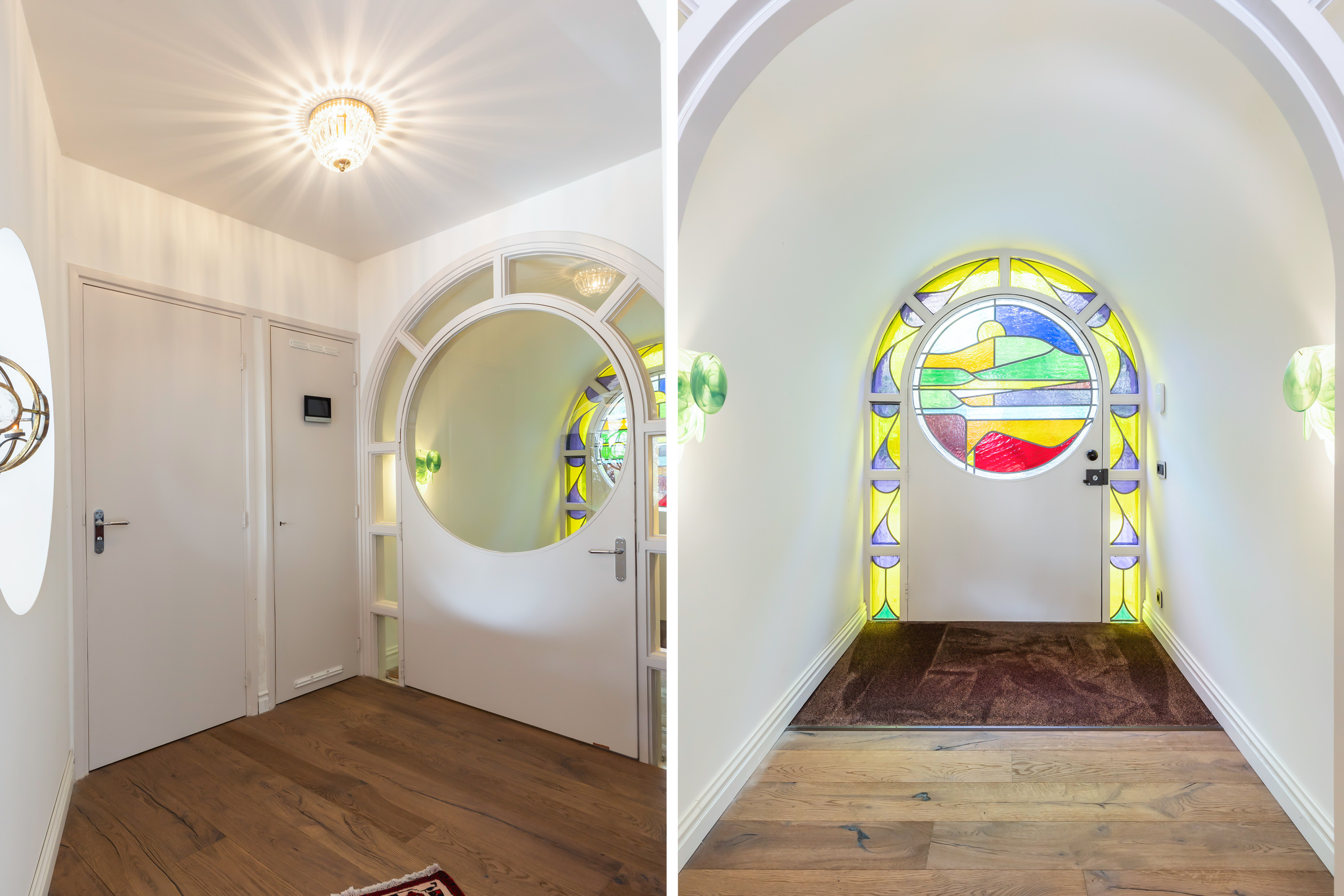 The main residence, measuring approximately 175 m², features a distinctive half-round front door with stained glass and an inviting entrance hallway.