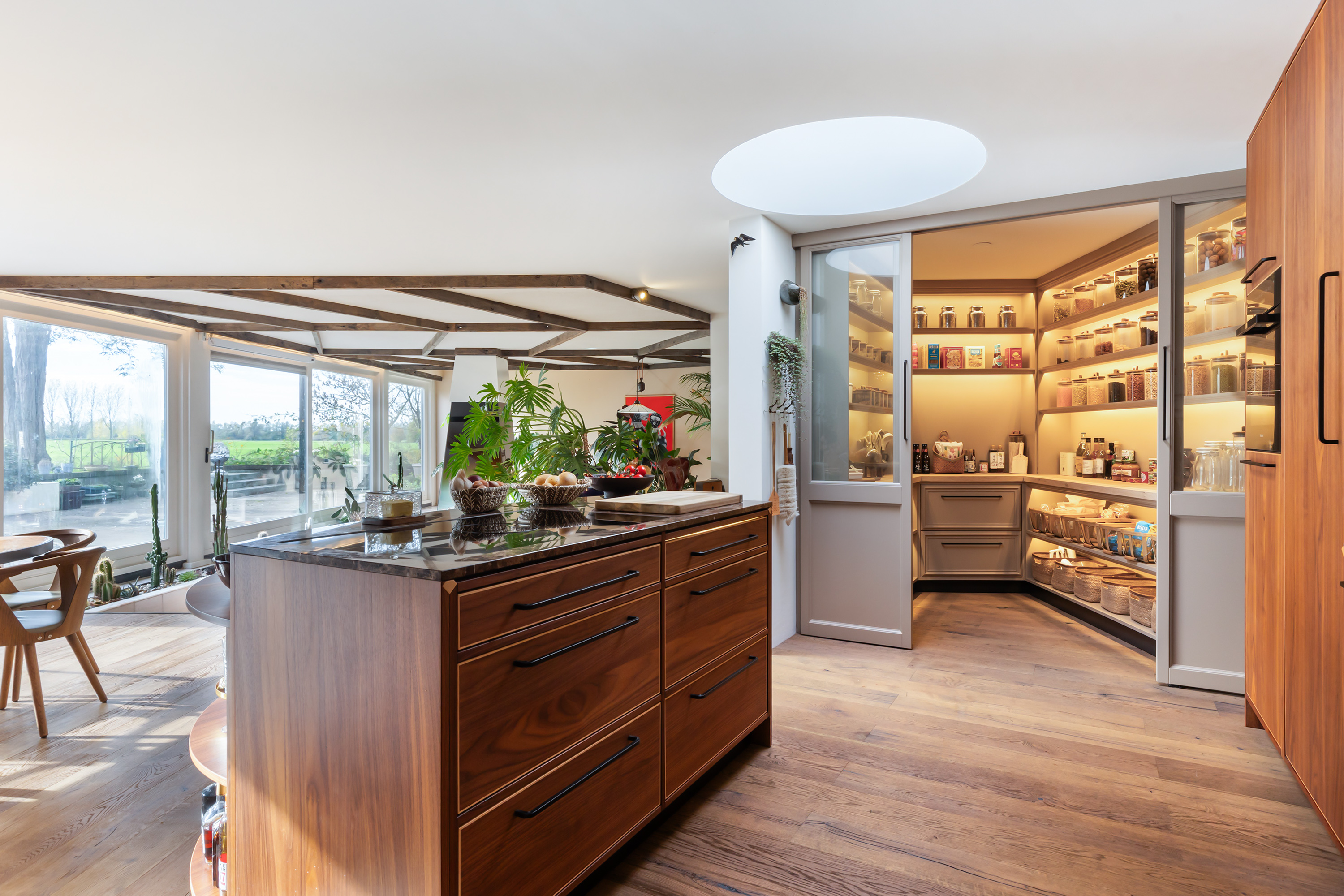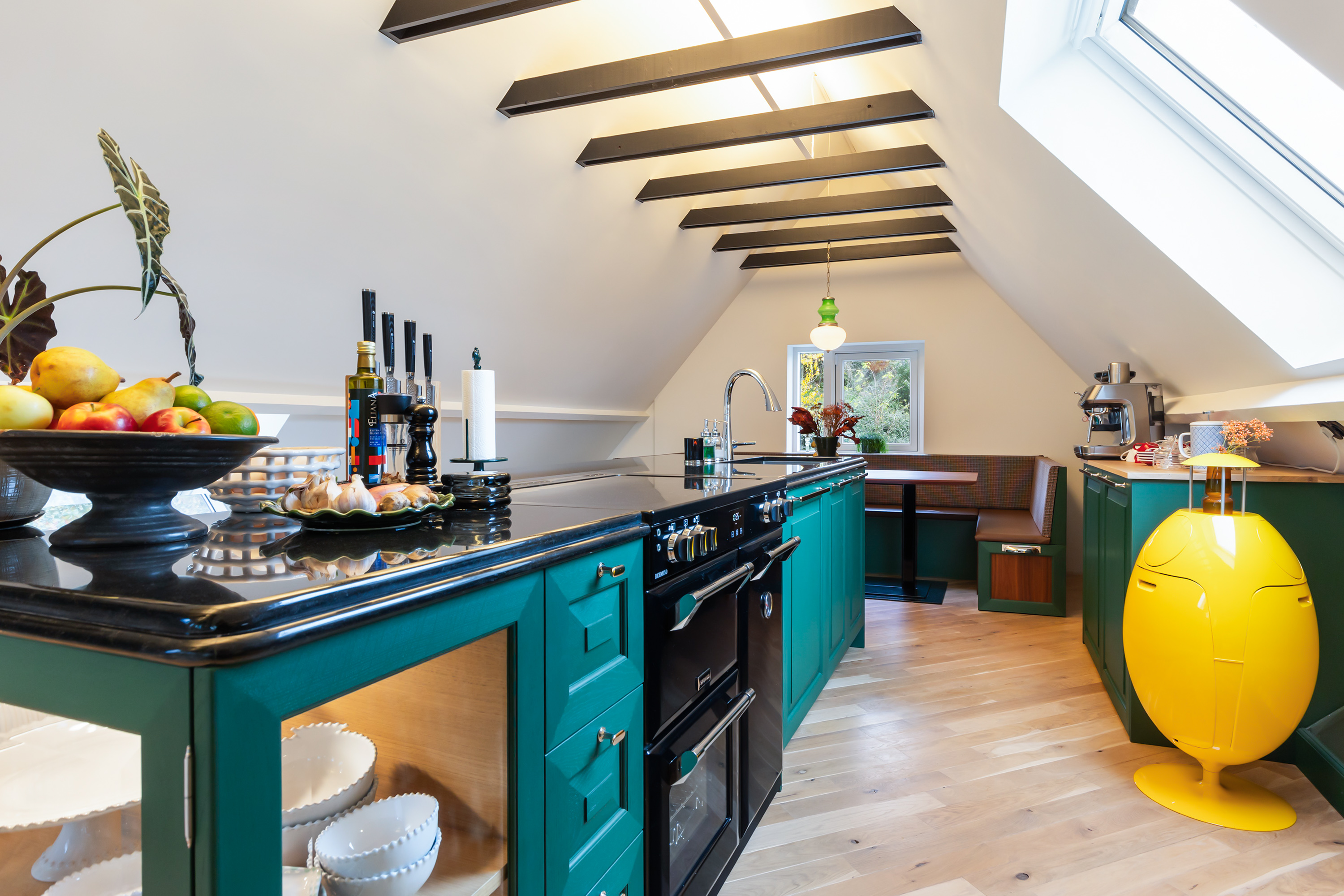On the mezzanine level is an atmospheric kitchen-diner featuring oak cabinetry in a woodland green tone, granite worksurfaces and Miele appliances. At the front is a bright dining area, while the rear offers a cosy TV room with French doors opening onto the spacious roof terrace. Here, you can enjoy panoramic views across the garden and fields – an ideal spot to unwind or dine in the evening sun.
