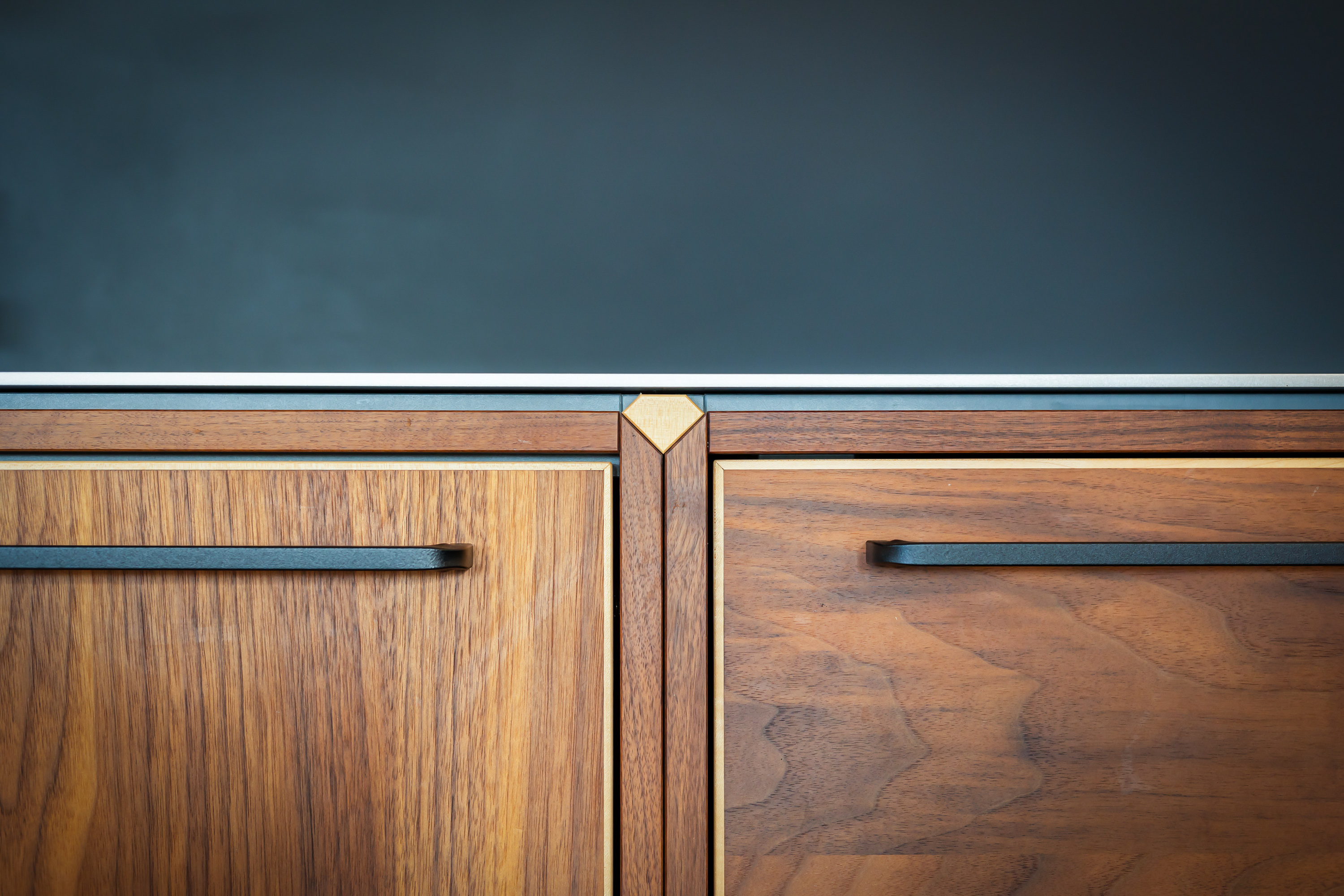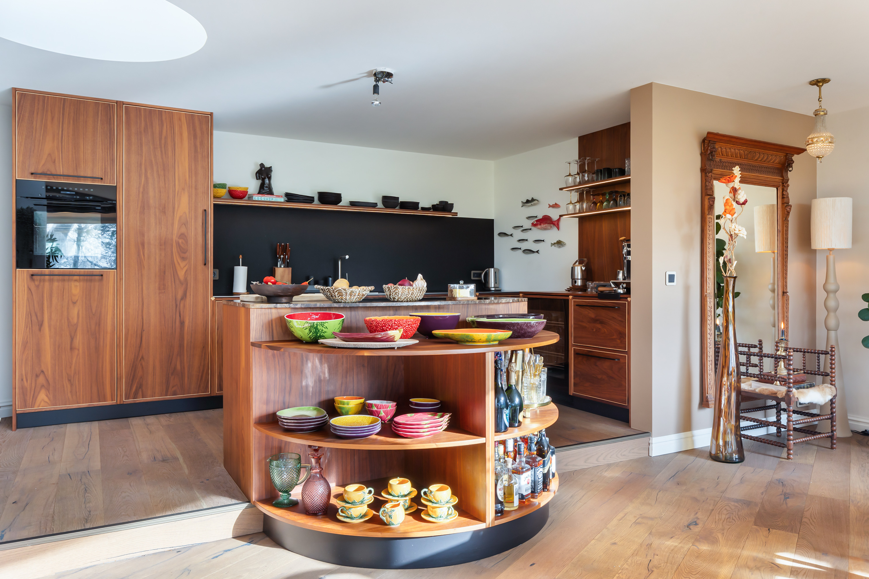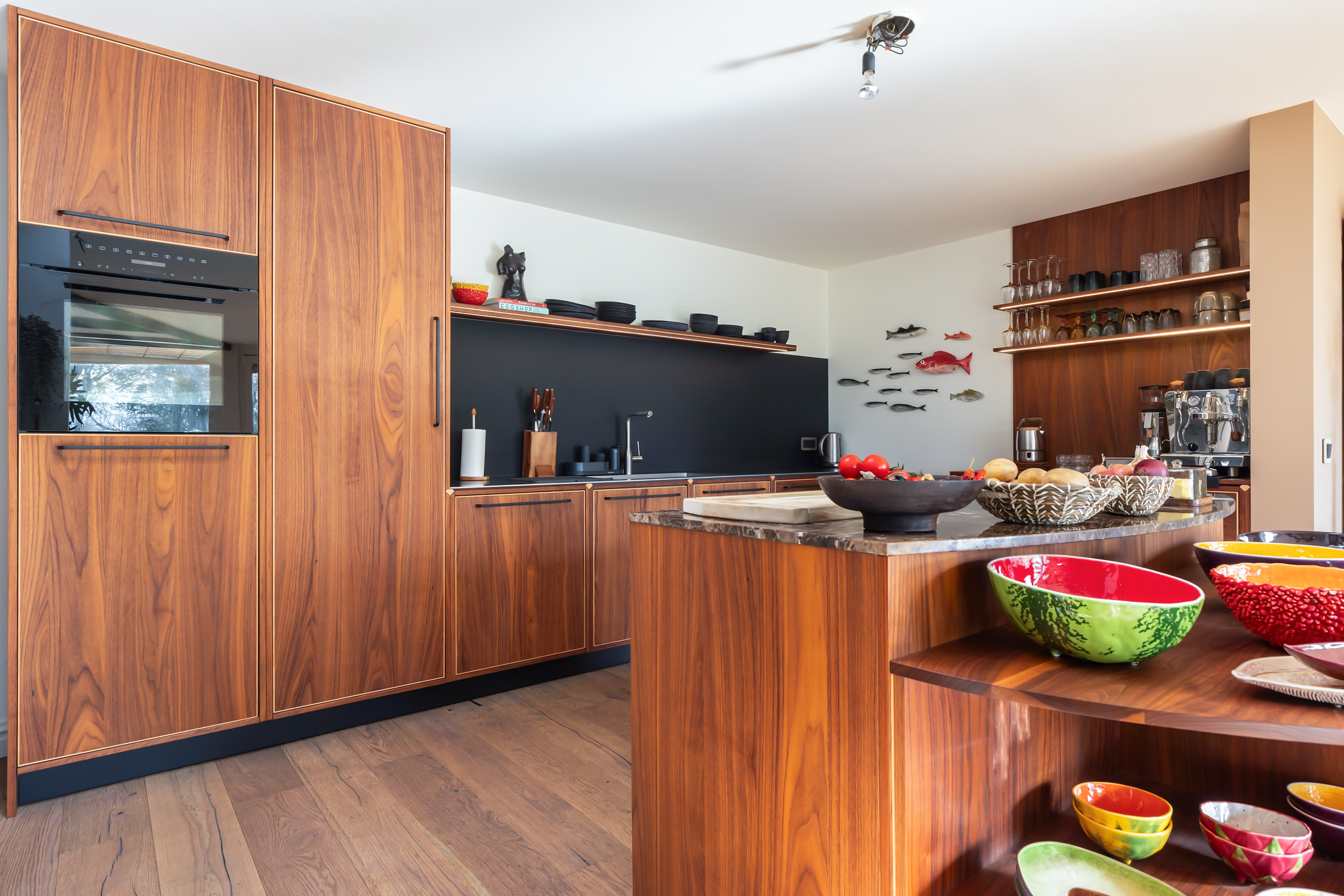 The living room, with oak flooring and open fireplace, is bright and spacious thanks to the glazed rear façade overlooking the terrace and garden. The bespoke kitchen, crafted in walnut with stainless steel worktops and Miele appliances, forms the heart of the home.