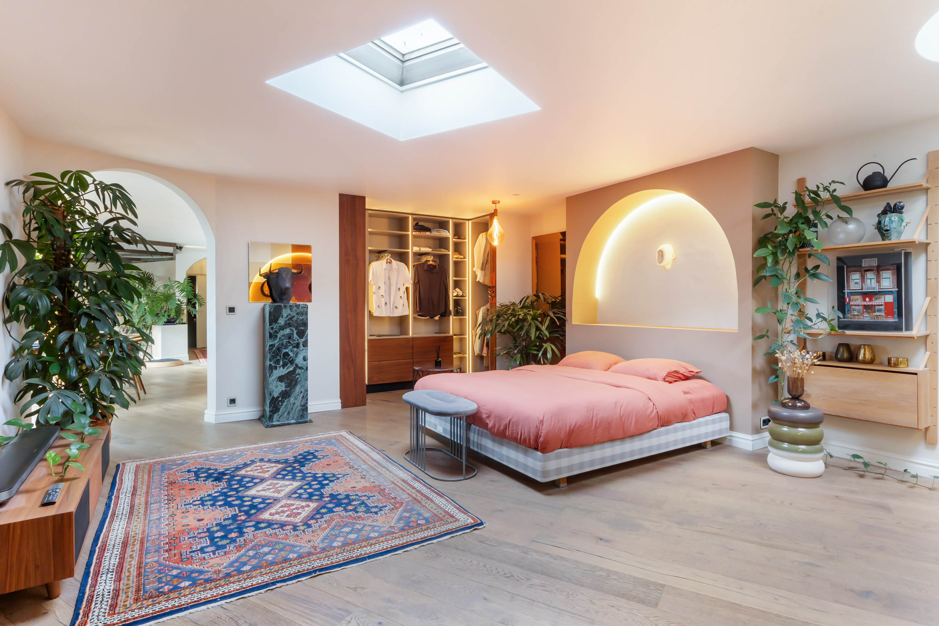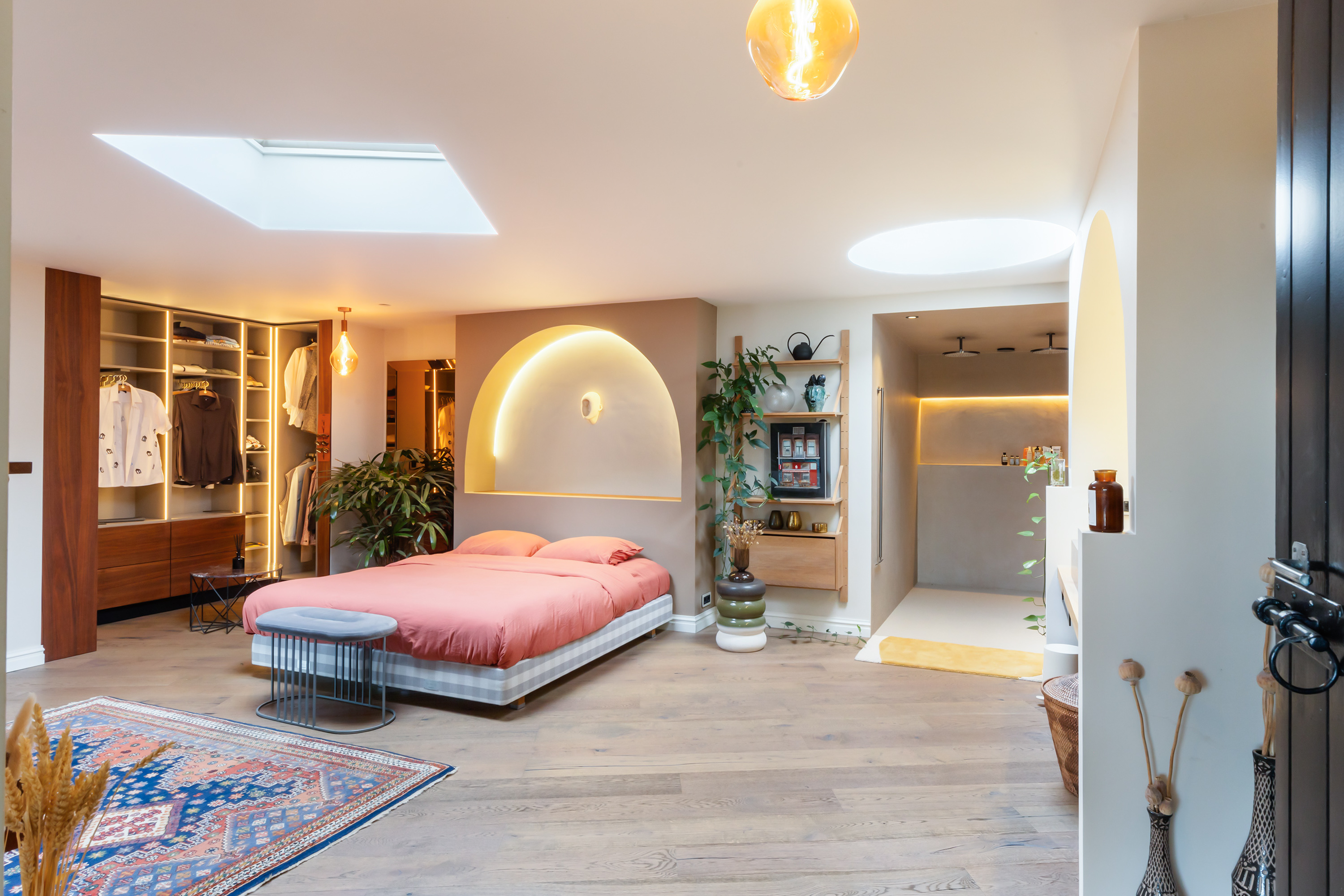 Additional rooms include a utility room, guest WC and a generous bedroom with walk-in wardrobe and luxury hotel-style bathroom. This bathroom features a double walk-in shower, granite basins, bespoke cabinetry and softly illuminated arched recesses that lend the space a warm, exclusive ambience.