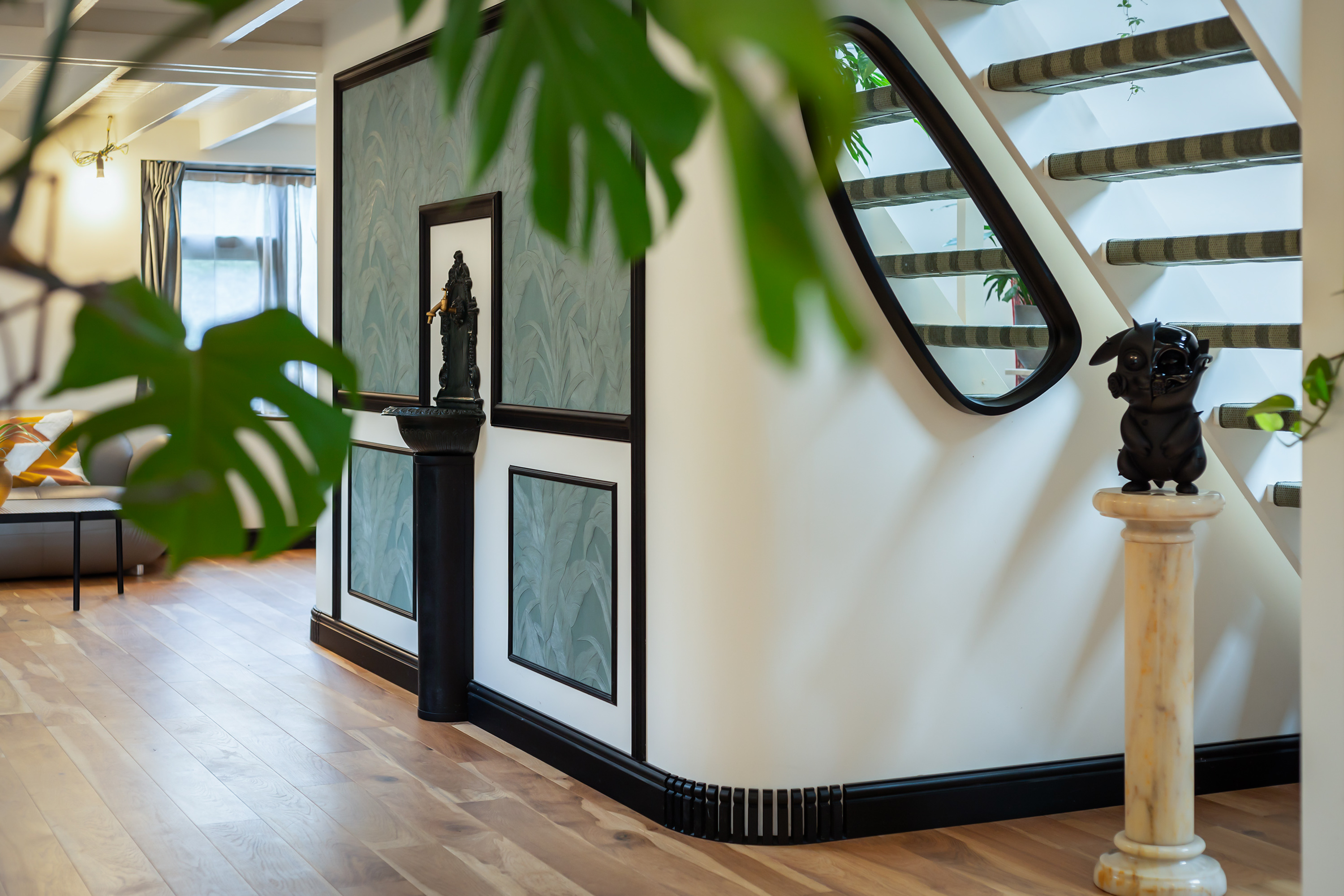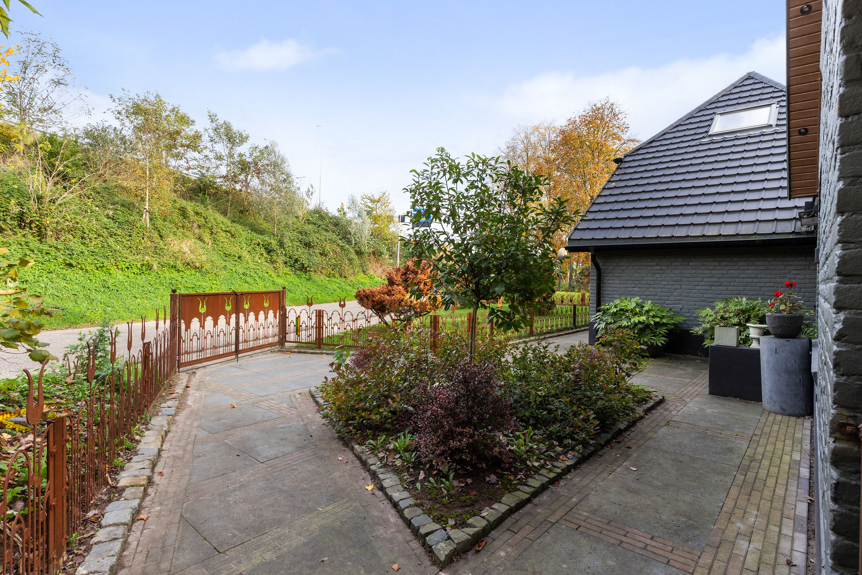 The exterior has been fully repainted, fitted with new roofing, and enclosed by a bespoke corten steel boundary with glass panels referencing the striking tulip artwork in the front garden. All windows have been upgraded with insulating glazing, and the interior has been redesigned into a hotel-chic living environment with warm tones, high-quality bespoke joinery and atmospheric lighting. The property is equipped with a comprehensive camera system and alarm installation both in and around the buildings.