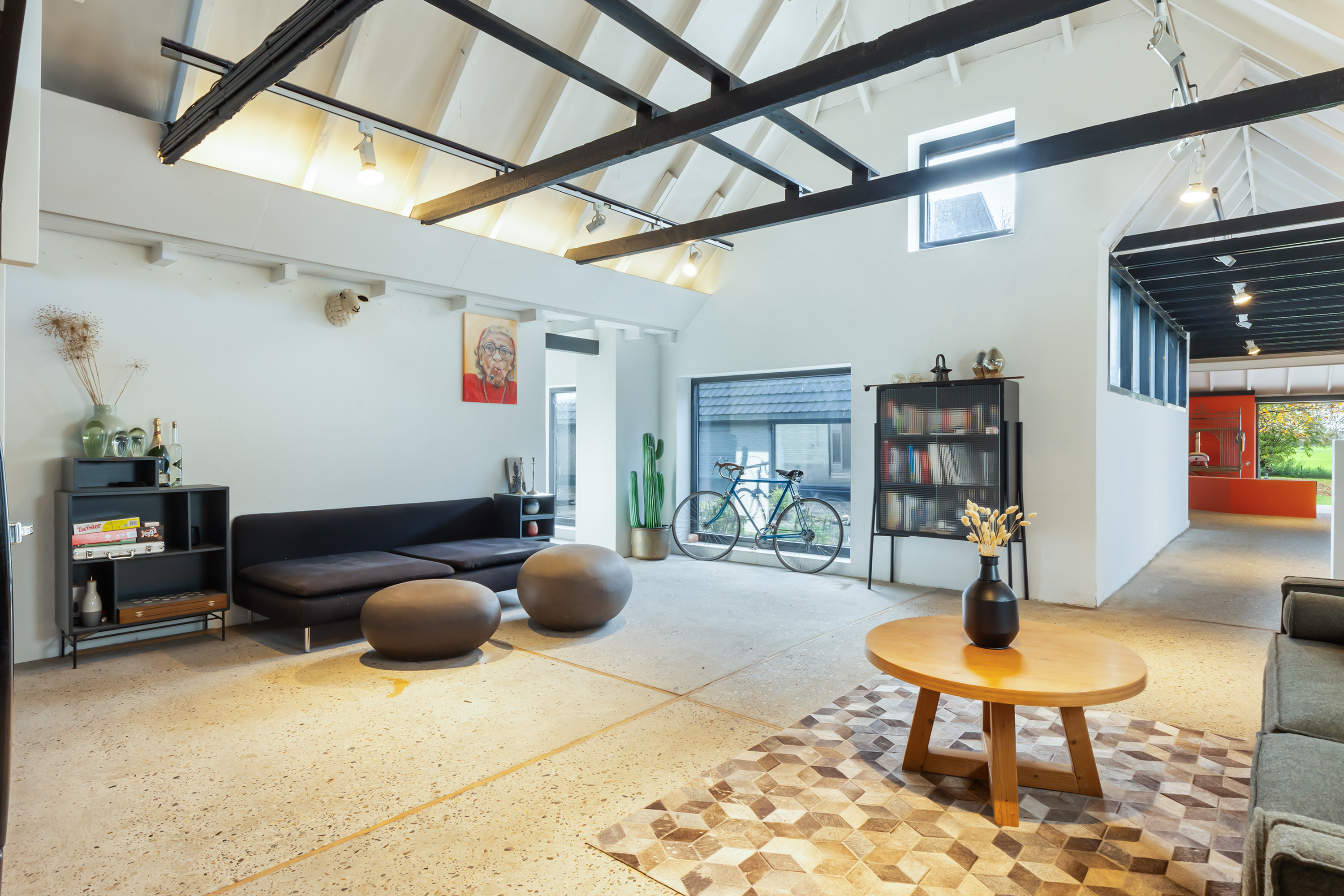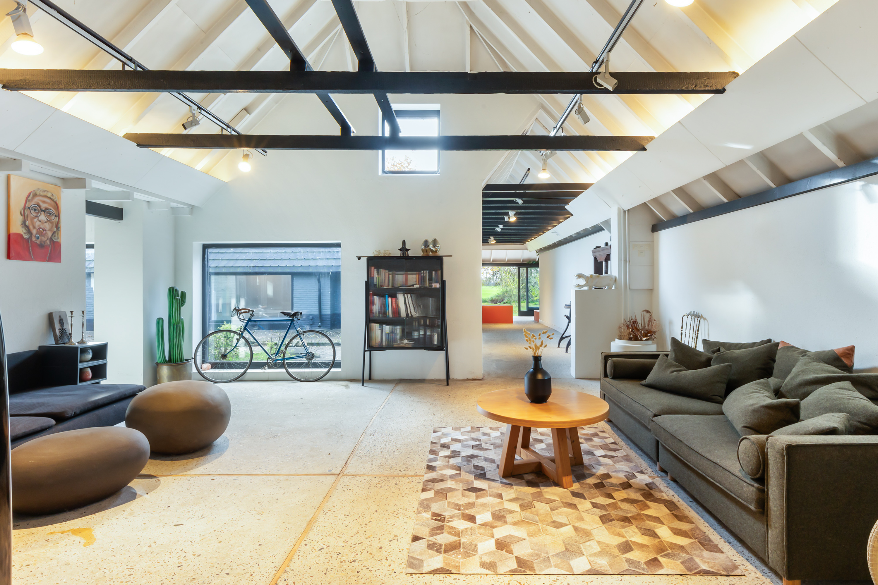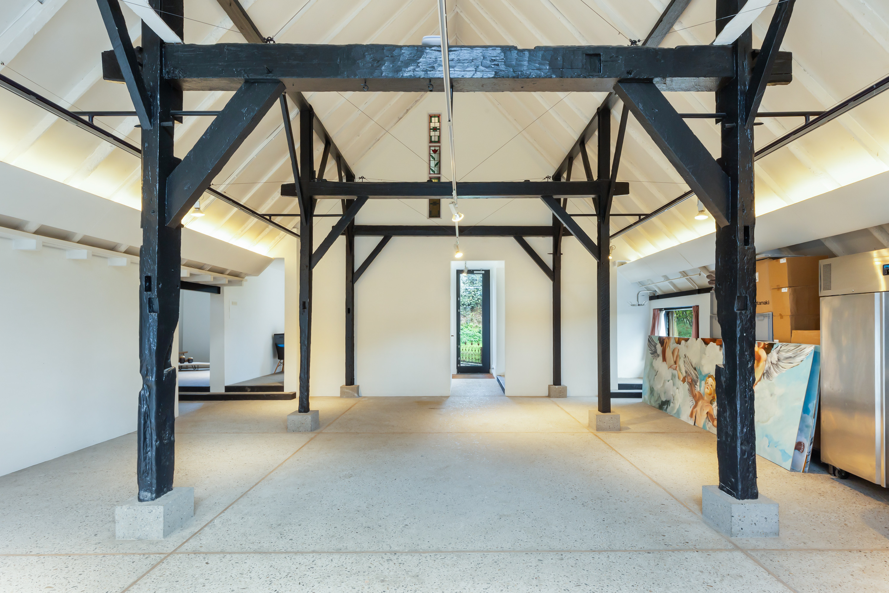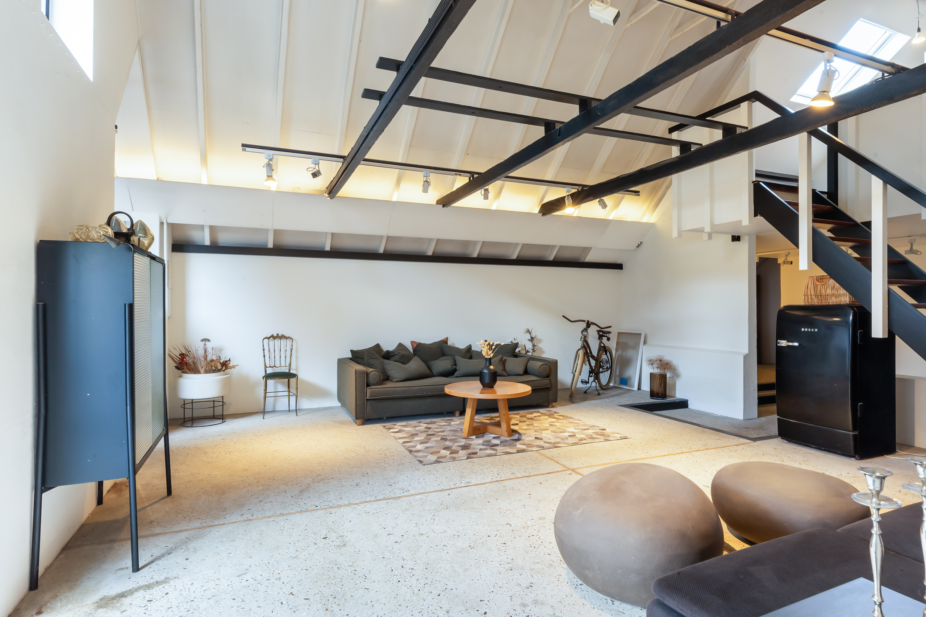 The adjoining 445 m² commercial building offers countless possibilities: an atelier, gallery, showroom, office or workshop. Its soaring ridge height with black timber trusses, generous proportions and large windows create a striking atmosphere of craftsmanship and character. The building includes its own entrance, office, pantry and WC. The mezzanine floor offers further space for guest accommodation, an atelier or workspace.