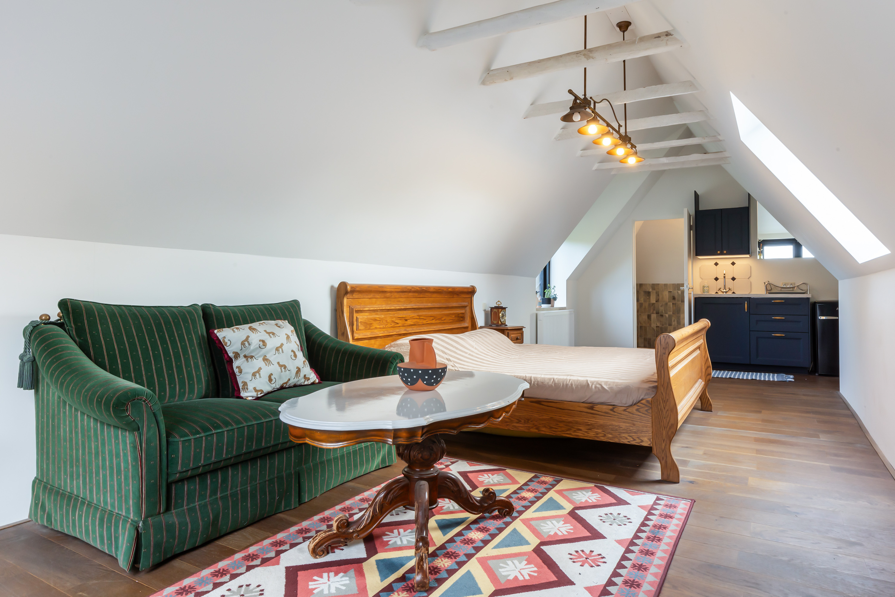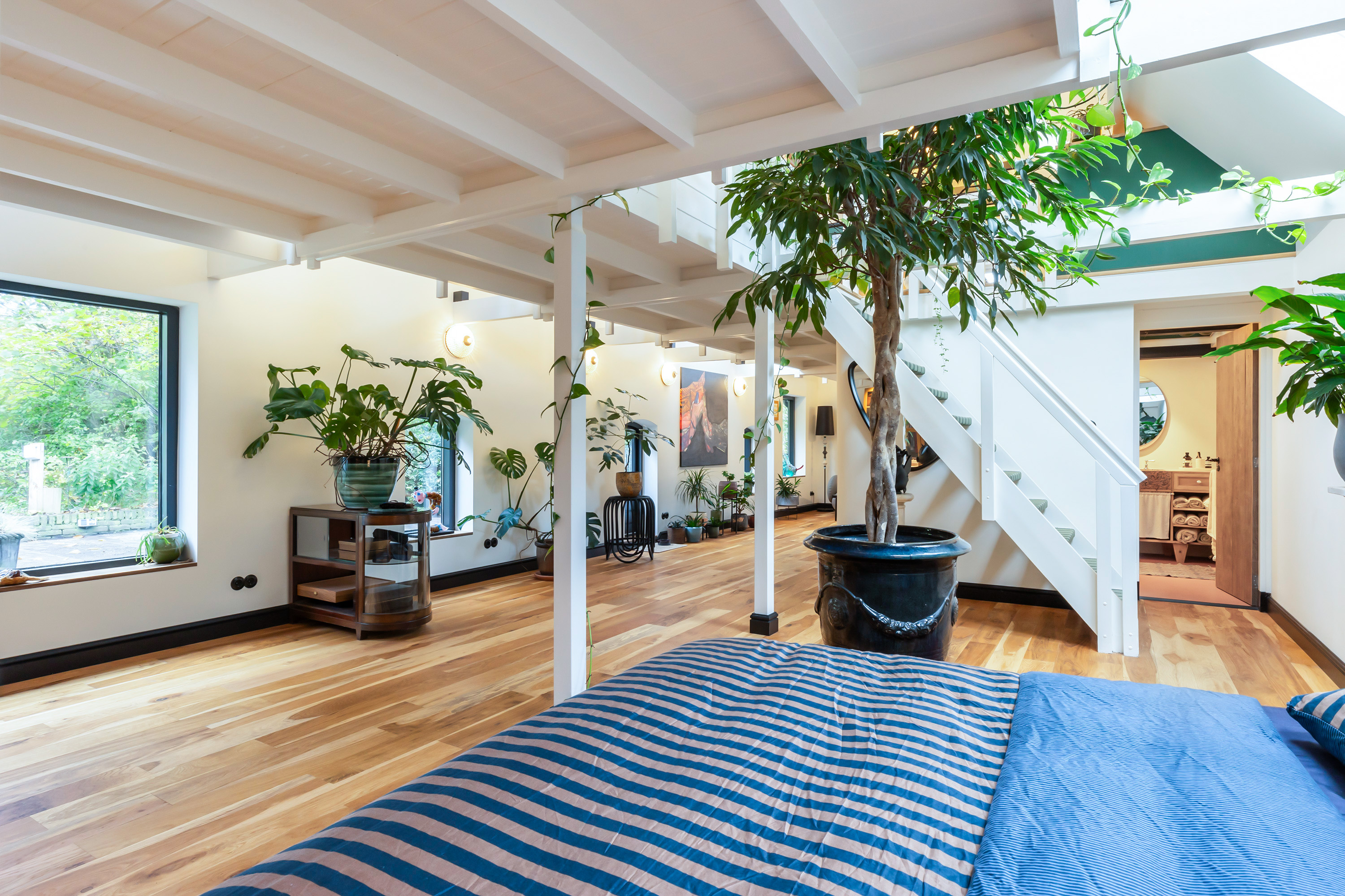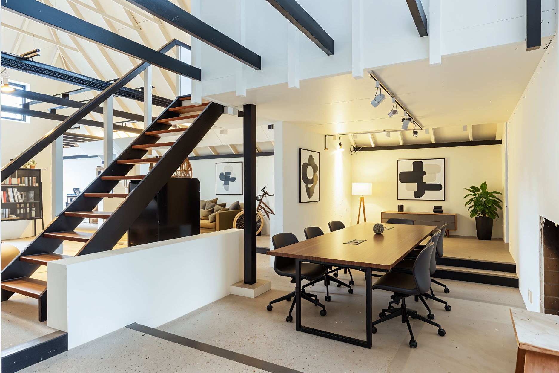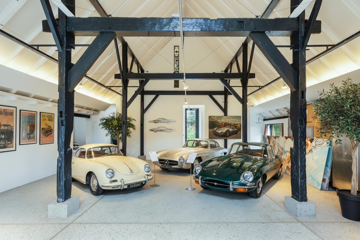 The adjoining 445 m² commercial building offers countless possibilities: an atelier, gallery, showroom, office or workshop. Its soaring ridge height with black timber trusses, generous proportions and large windows create a striking atmosphere of craftsmanship and character. The building includes its own entrance, office, pantry and WC. The mezzanine floor offers further space for guest accommodation, an atelier or workspace.