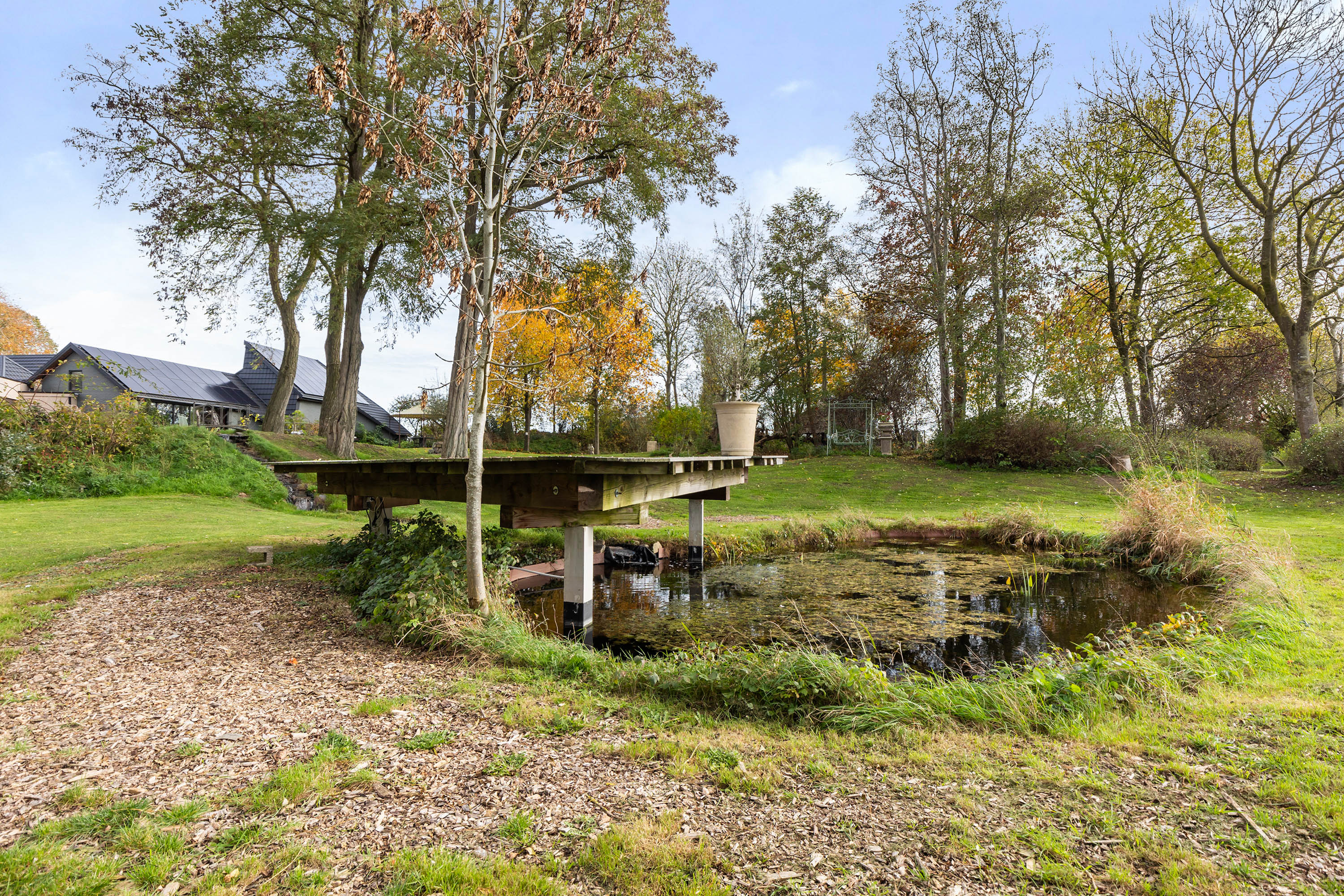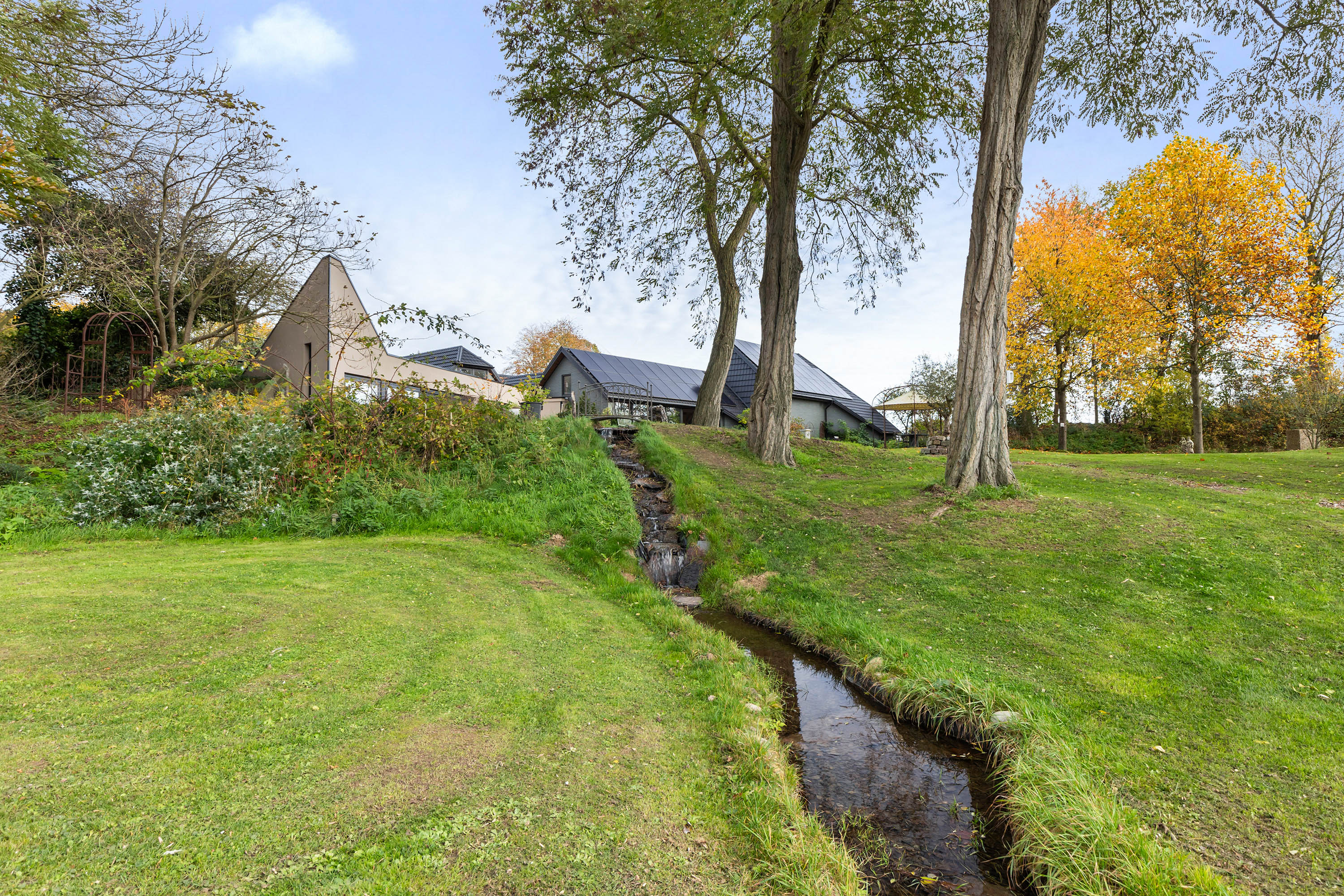 The garden surrounding the property has been landscaped with great care for atmosphere and tranquillity. Facing south, the rear garden blends seamlessly into the surrounding fields, while mature trees and hedges provide privacy. A romantic gazebo, a gently flowing stream with footbridge, and a floating deck with panoramic views together create a place where nature and design meet in harmony. A carport, timber outbuilding and fully enclosed grounds offer comfort and security for both residents and animals.