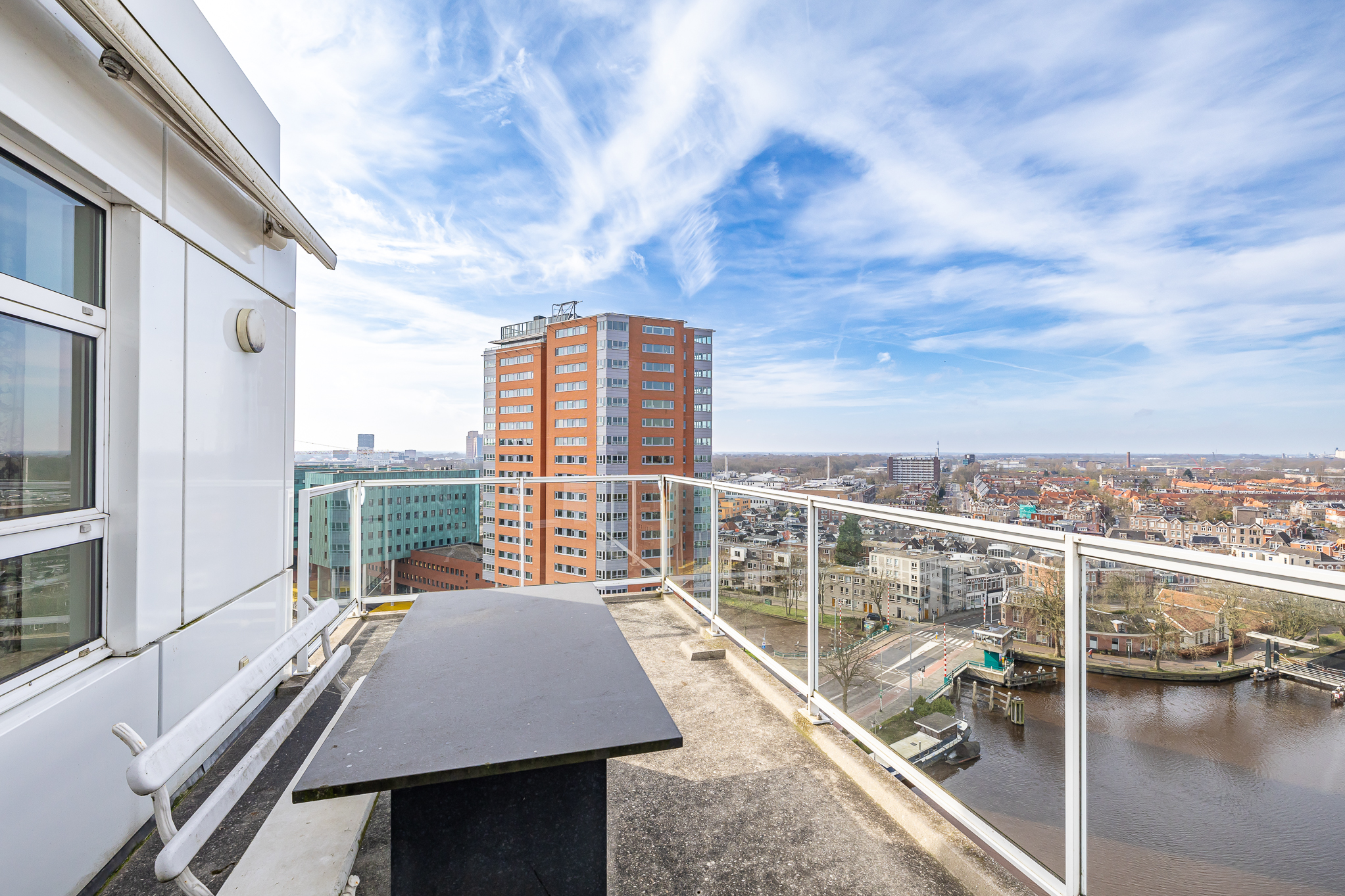 Penthouse Groningen is a rare residence offering refined urban living at the edge of the city’s historic heart. This exclusive penthouse provides 263 m² of living space, where floor-to-ceiling views extend over the Verbindingskanaal, the Zuiderhaven, and the tree-lined Praediniussingel. The property’s distinctive design, achieved by uniting two penthouses, creates a spacious layout with four bedrooms and two bathrooms, including features such as a whirlpool, sauna, and steam cabin.
