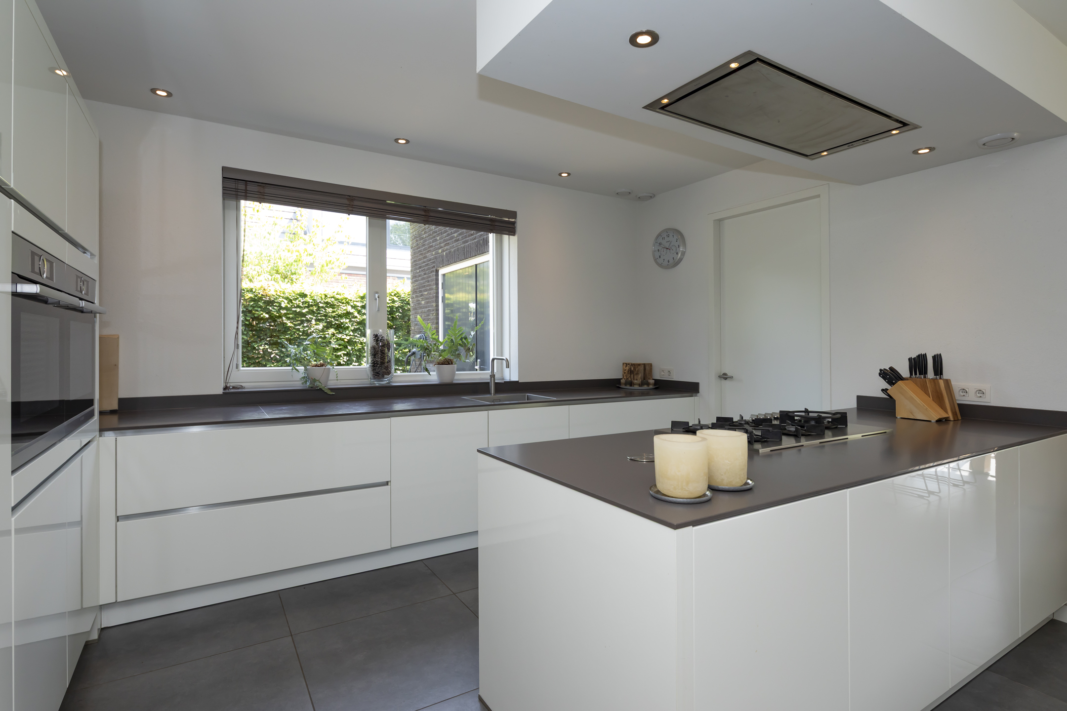 Cooking enthusiasts will be in their element here! This luxurious kitchen is equipped with a convenient Quooker, a steam oven and a convection oven, a refrigerator, and a dishwasher. The island has a 4-burner gas cooktop and a wok burner, and the extractor hood is integrated into the ceiling. The kitchen features a beautiful composite countertop and offers ample work and storage space thanks to the wide drawers and cabinets. It is handleless and finished in high-gloss white, which contrasts beautifully with the floor. While you're cooking, you can still enjoy the company of others at the table and not miss a thing.