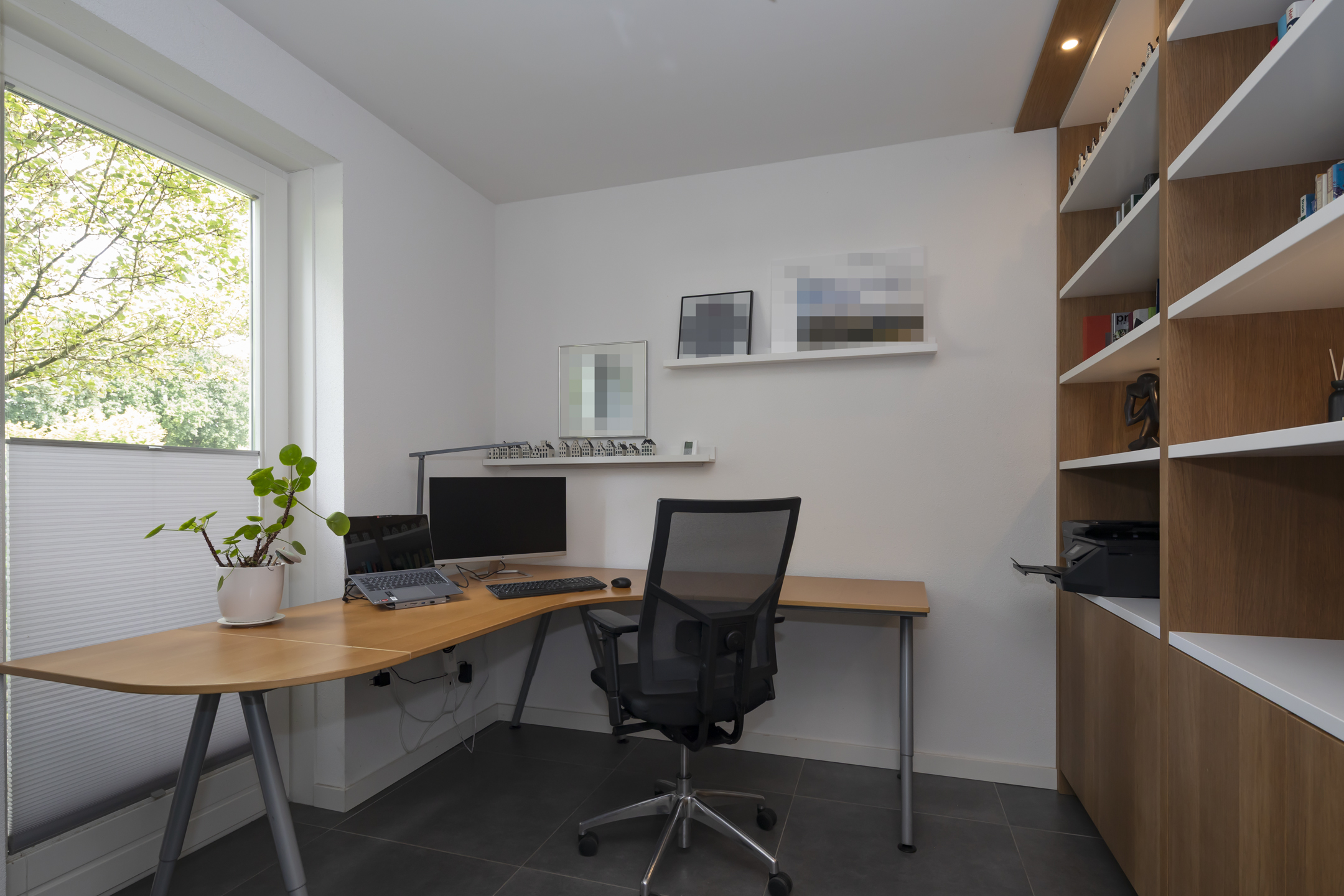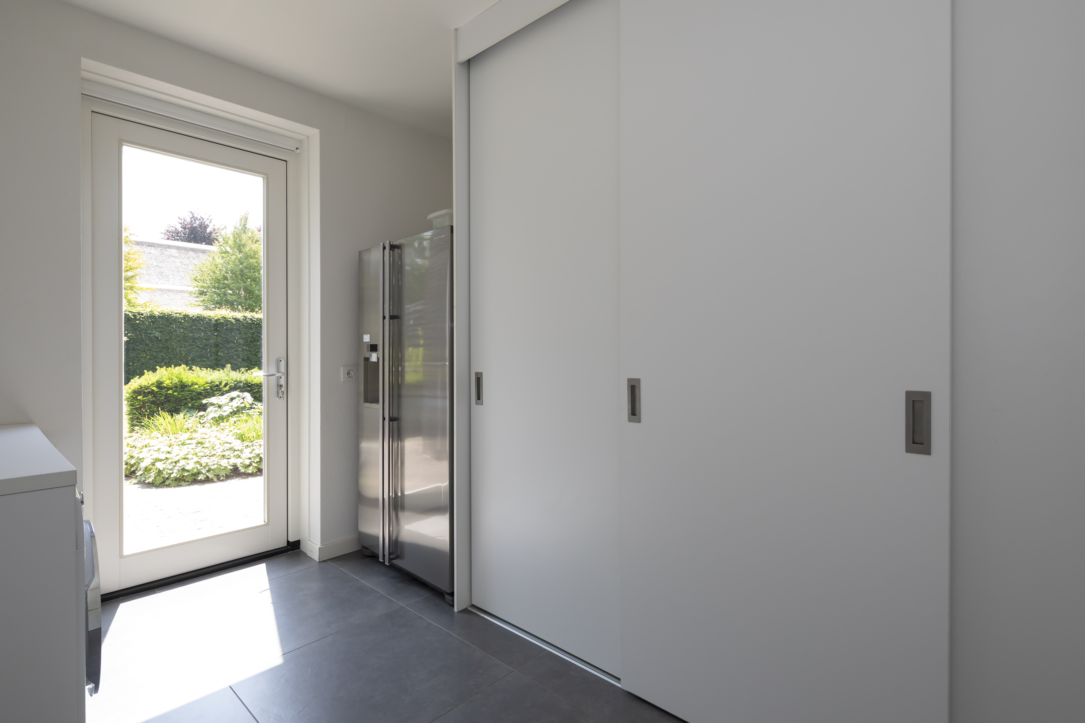 The utility room is a practical, pleasant space with connections for the washing machine and dryer, as well as a water connection for an American-style refrigerator, for example. There is a spacious built-in cupboard with sliding doors. The utility room is accessible from the kitchen. The garage and the back garden are also accessible from the utility room.