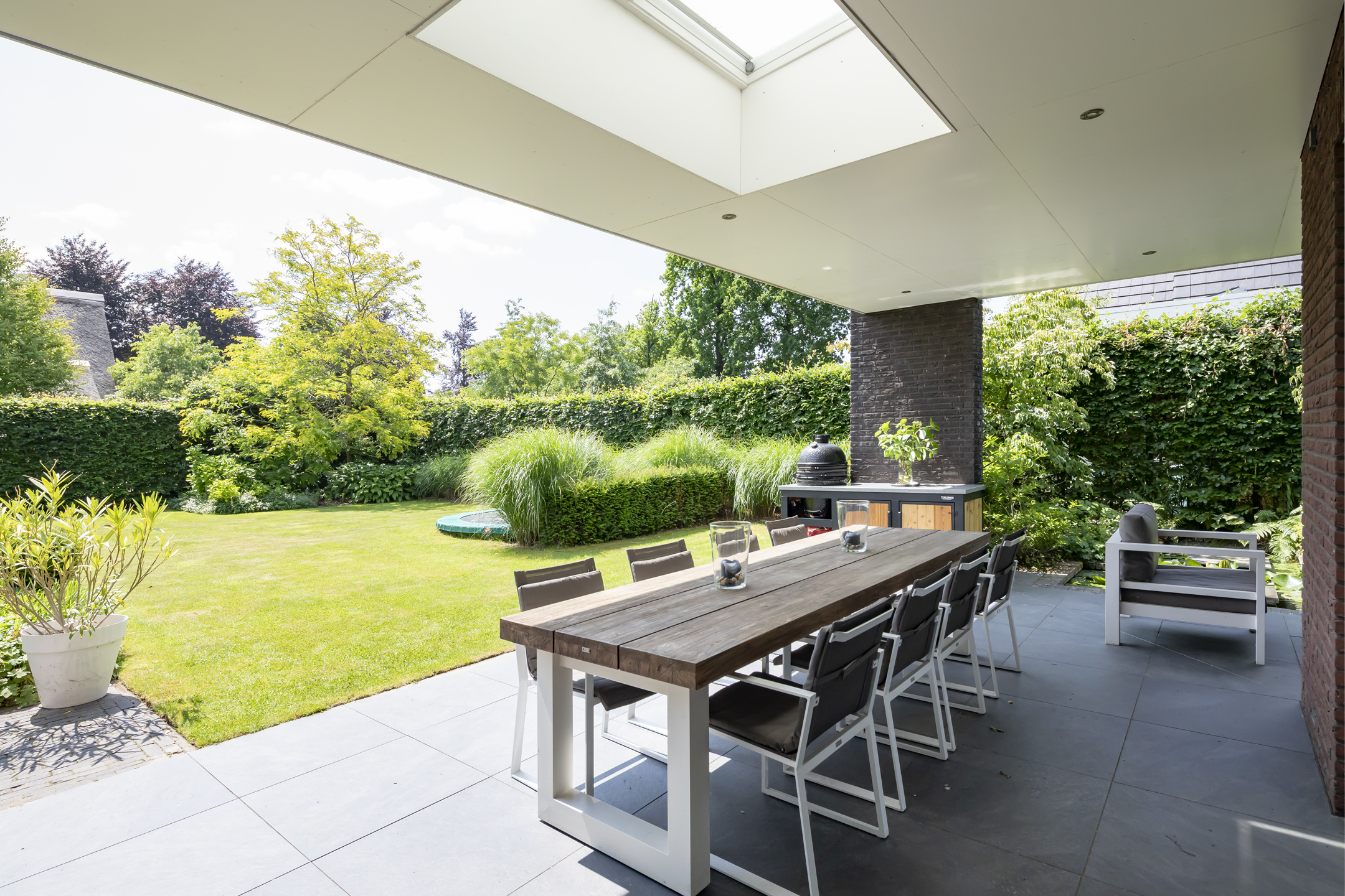 The garden is fantastic, offering wonderful privacy. The beautiful garden is bordered by green hedges, ensuring minimal views. A lovely lawn with a spacious sun terrace provides ample space for playing. In addition to the sun terrace, there is also a beautiful, spacious covered terrace adjacent to the rear of the house. The covered area has a large skylight, ensuring optimal daylight penetration into the living room. And then there's the unique sauna in the garden, where you can relax after a hard day's work. The front garden is also neatly landscaped and has a spacious driveway with space for 4 to 6 cars.