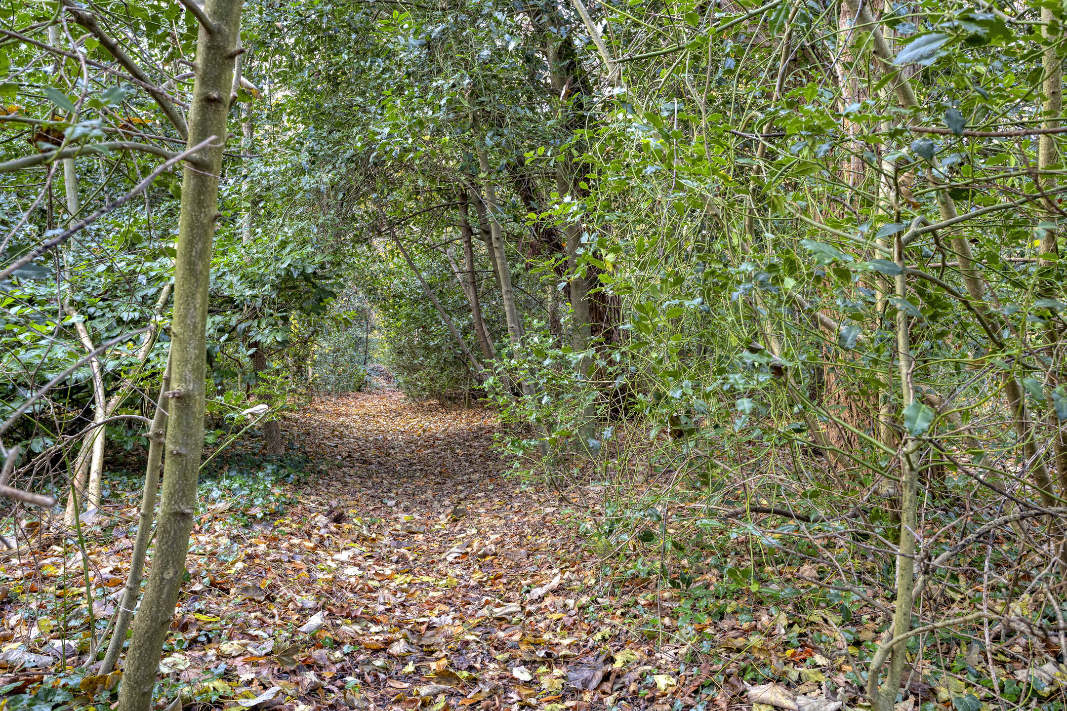 Park-like landscaped garden surrounded by woodland, paved terrace with decorative paving, borders, lawn and two wooden storage sheds;