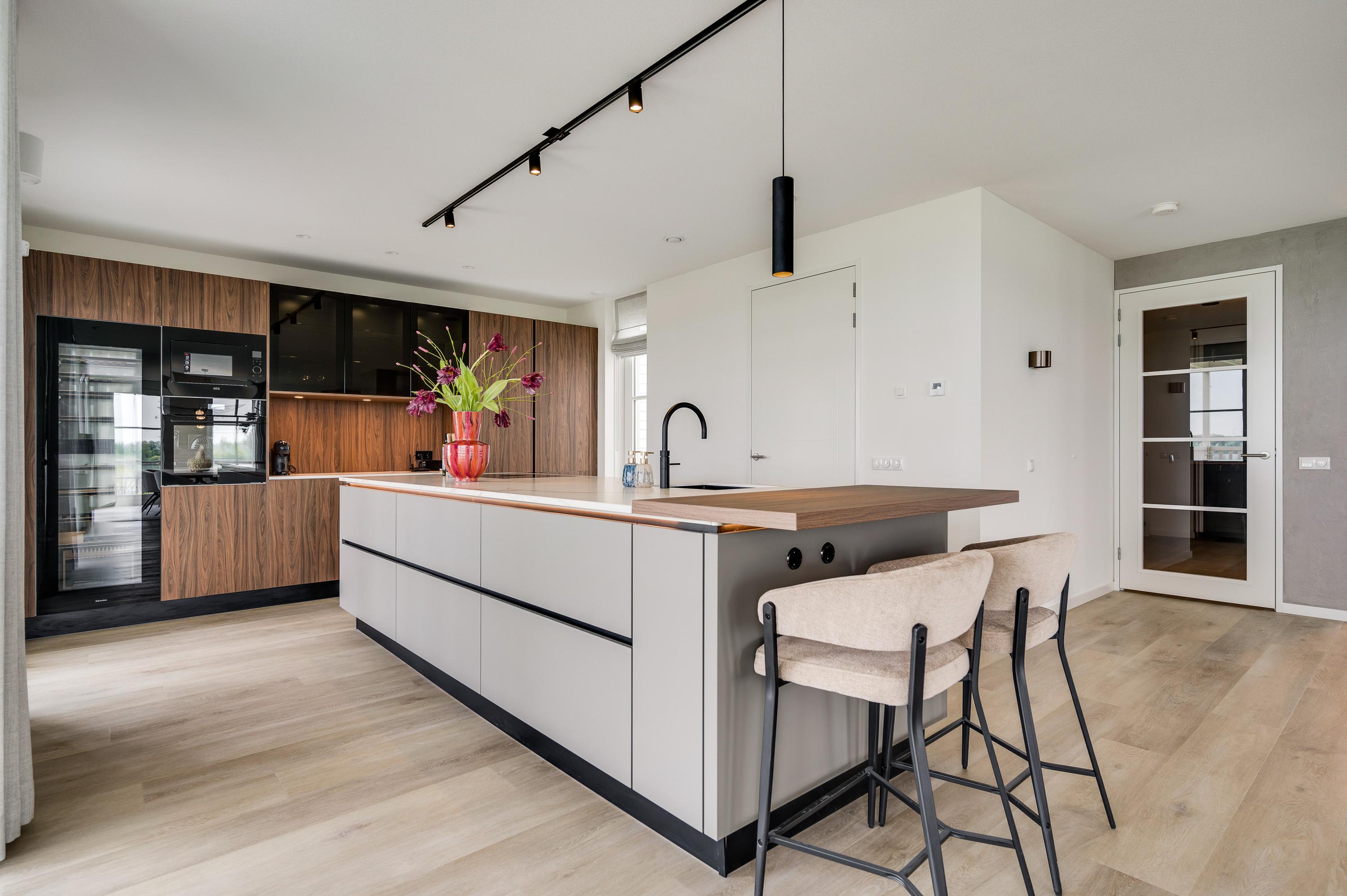 A bar has been created at the end of the island. Here you can enjoy a cup of coffee and the newspaper in the morning or the children can do their homework while you are cooking. All conveniences have been considered, such as a Quooker with hot and cold water, a Bora induction hob, a dishwasher, fridge, freezer and wine climate cabinet from Miele and an oven and microwave from AEG. The utility room is equipped with the white goods connections and has a door to the outside, so you don't have to go through the house with the groceries.