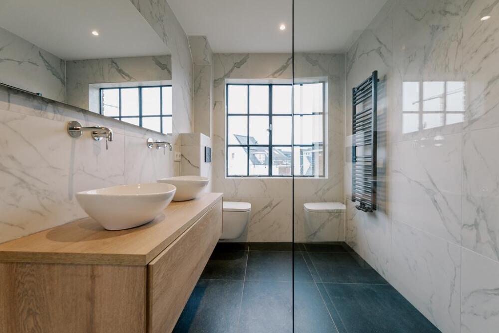 overloop welke toegang geeft tot twee ruime slaapkamers met balkon en de luxe afgewerkte badkamer met inloopdouche, toilet en dubbele wastafel.