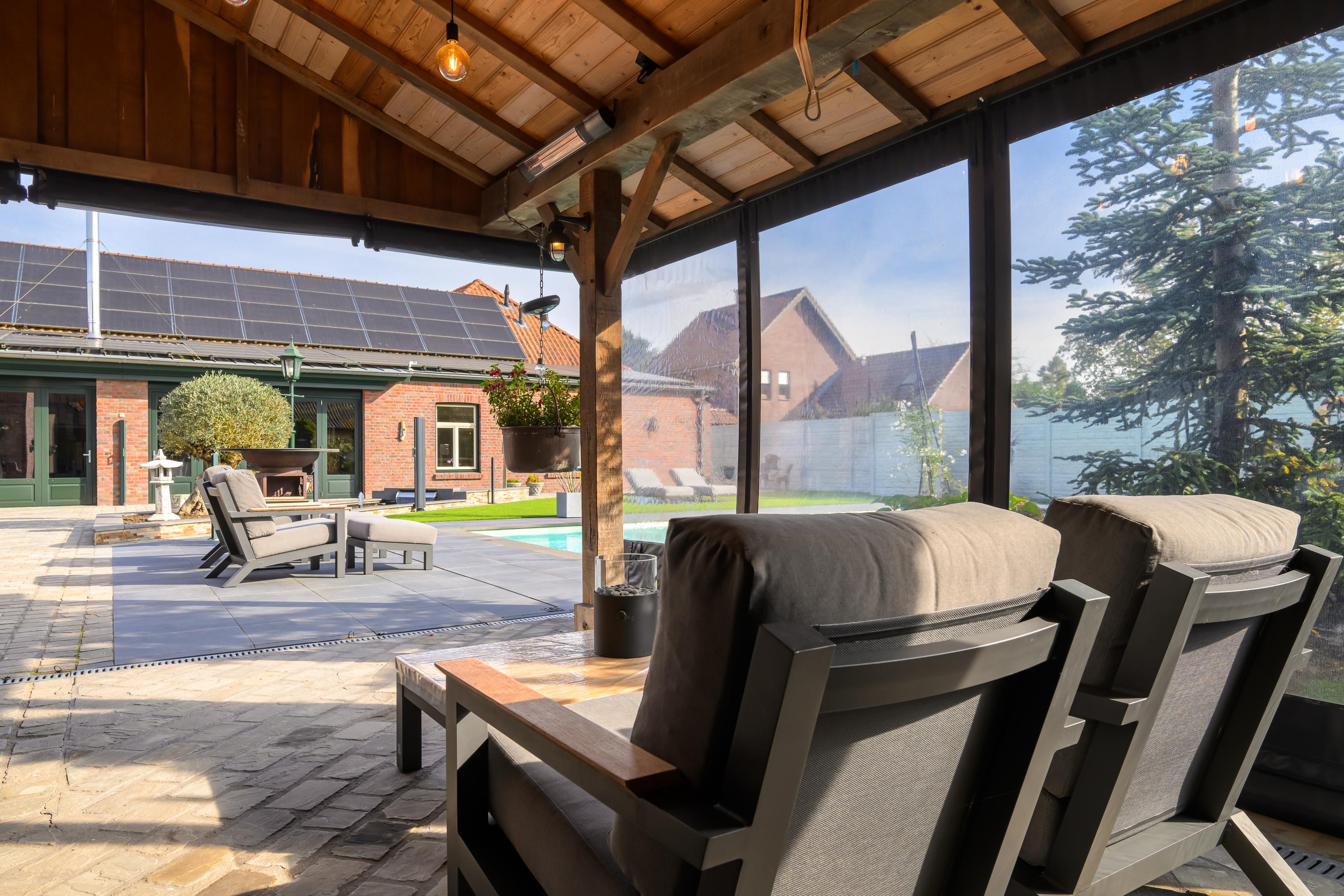De vrijstaande garage is uitgerust met een elektrische poort, heeft een zolderruimte en een toilet. Het aangrenzende terras met overkapping biedt een heerlijke plek om van het buitenleven te genieten.