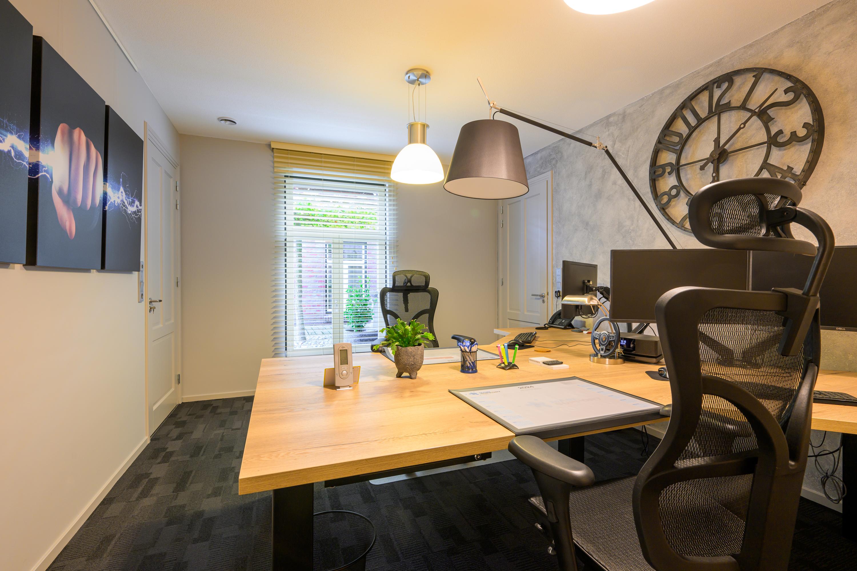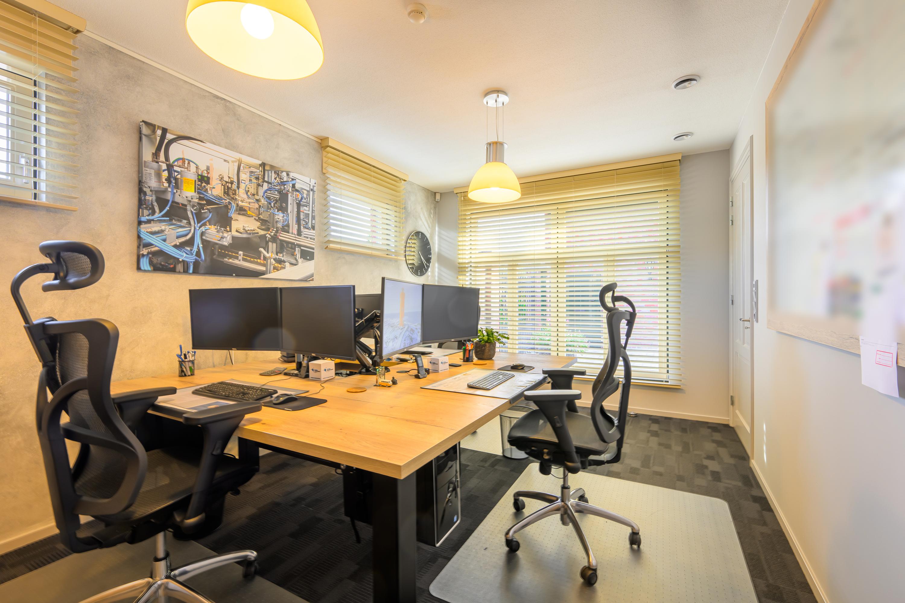 Het kantoorgedeelte bevindt zich aan de andere kant van de woning en is bereikbaar via de woonkamer of een eigen ingang. De hal leidt naar een toilet en meterkast, met drie kantoorkamers voorzien van opbergruimte, een kitchenette en een berging.