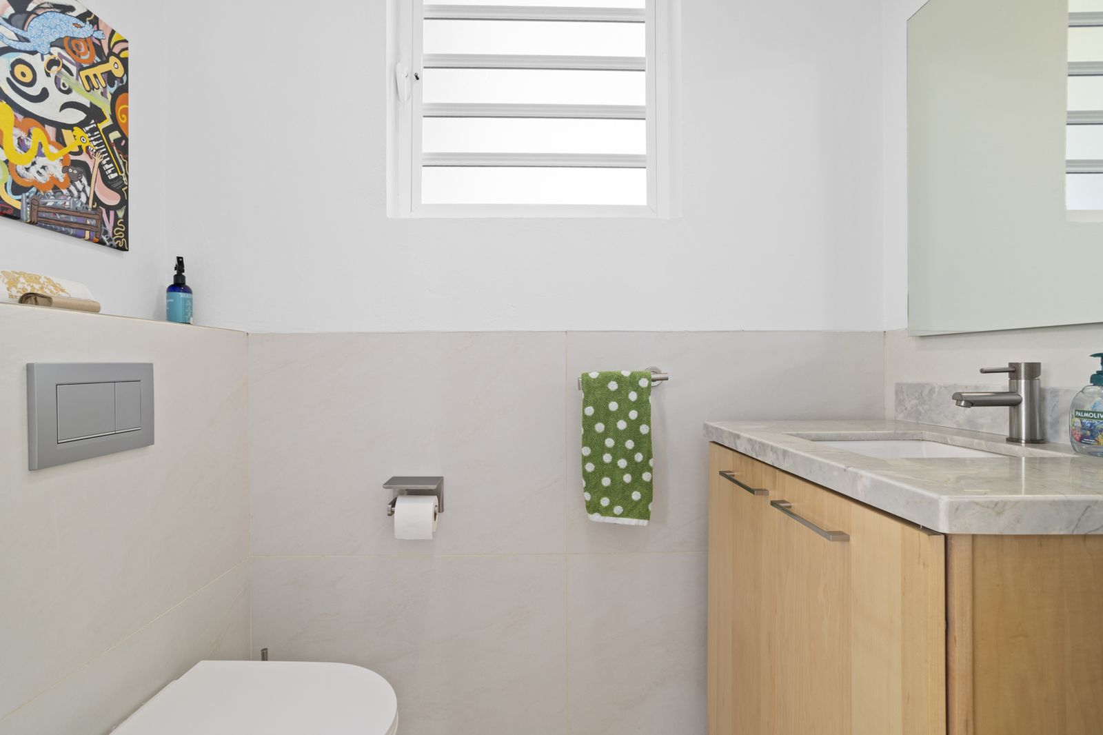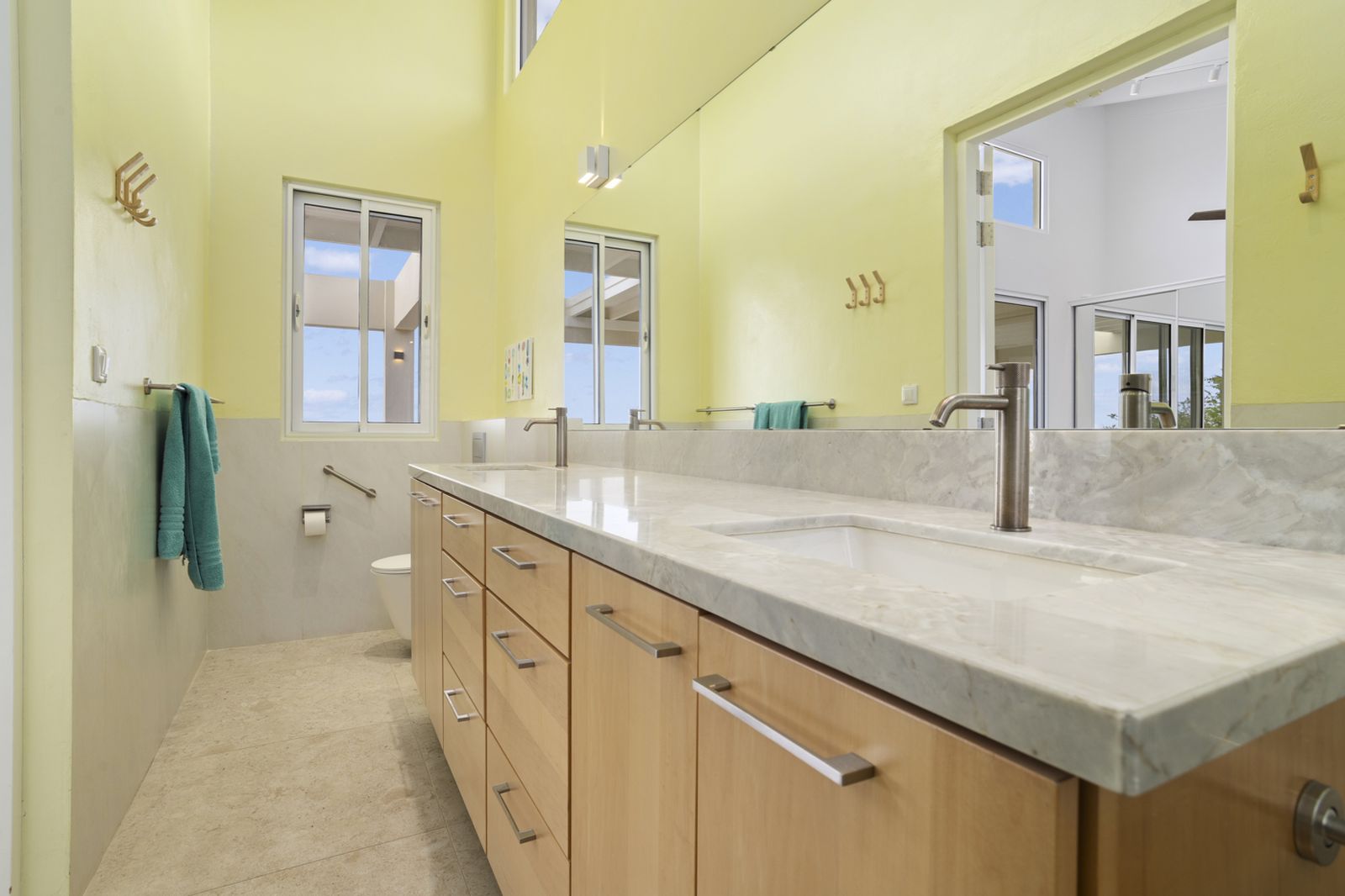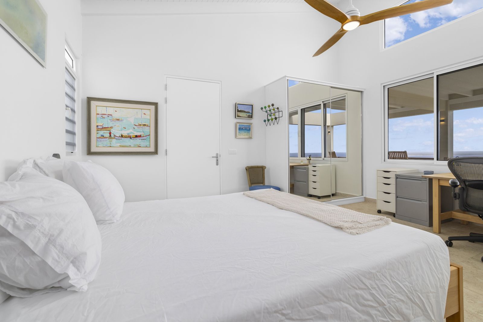The spacious primary bedroom overlooks the Caribbean Sea and includes a refined en-suite bathroom with double sinks and a walk-in shower. The double-island kitchen is ideal for entertaining, offering ample workspace while allowing the chef to stay connected with guests at the bar and outdoor dining area. The layout is perfectly suited for couples seeking comfort, simplicity, and space, and it even includes a large, secure storage room for water sports equipment, a rare feature on Bonaire.