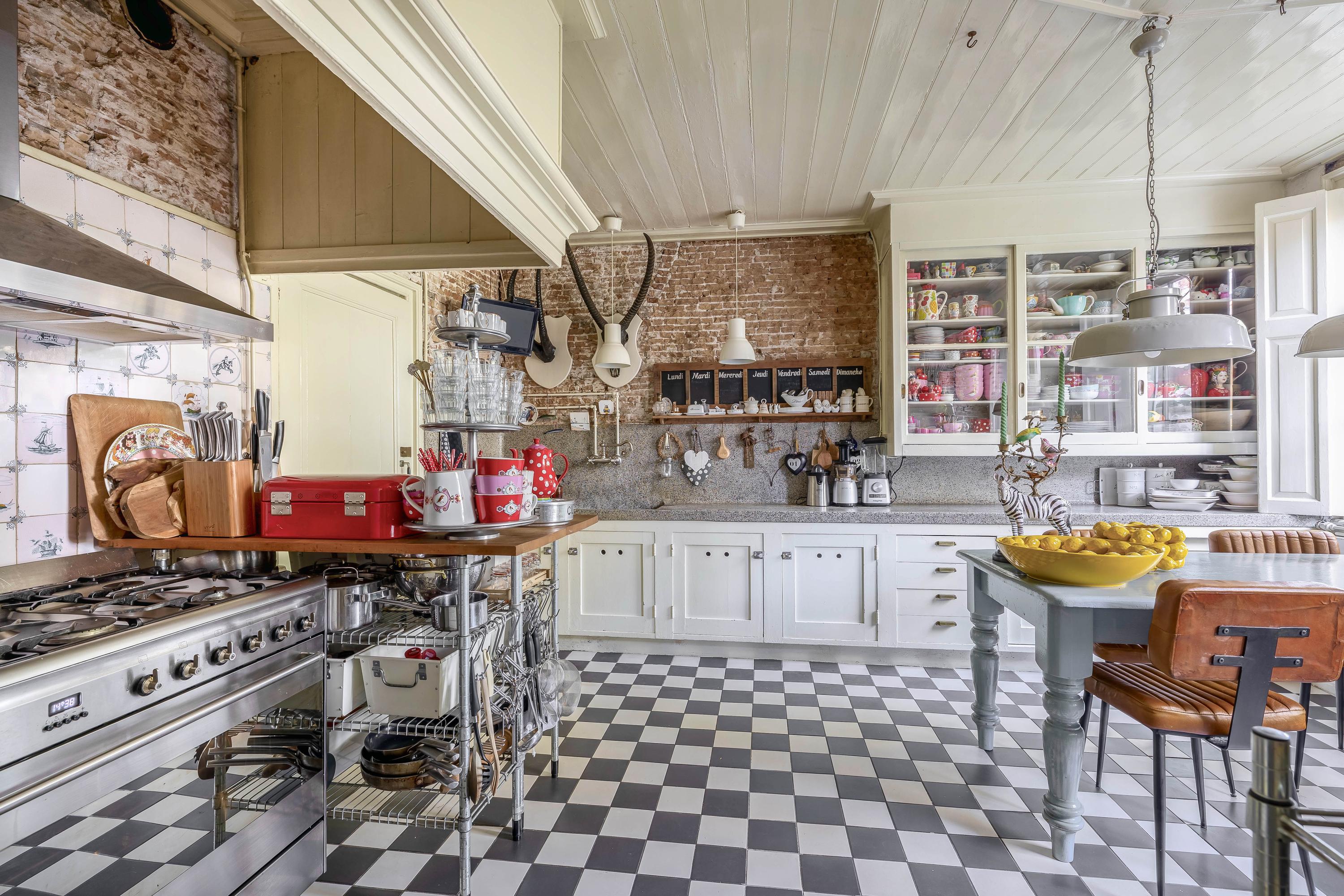 In the basement, there’s a country-style kitchen, a cozy garden room with French doors to the garden, several cellar rooms, and a wine cellar.