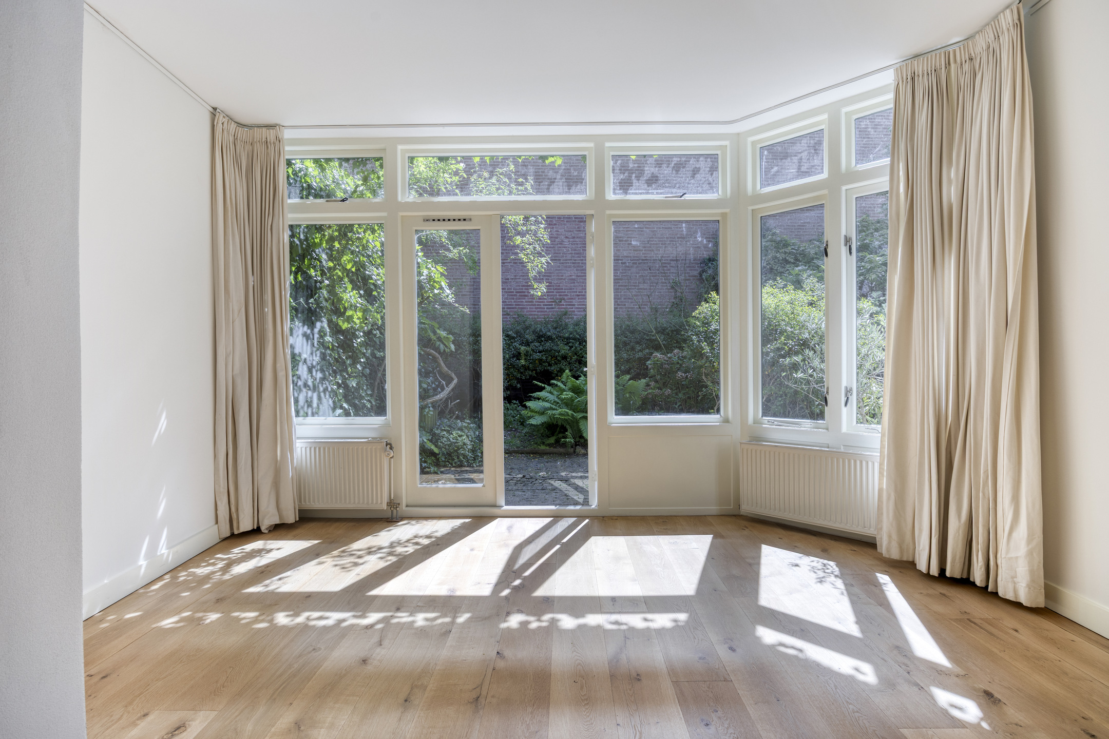 Kamer voorzijde met authentieke details en tuinkamer met openslaande deuren en binnendoor naar nr. 11. Keuken met inbouwapparatuur en badkamer met ligbad. wastafel en wc.