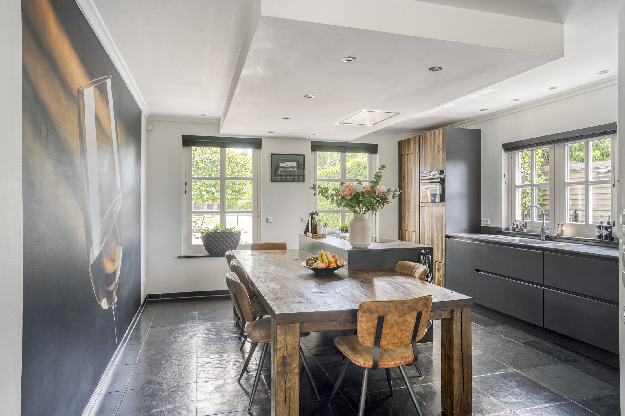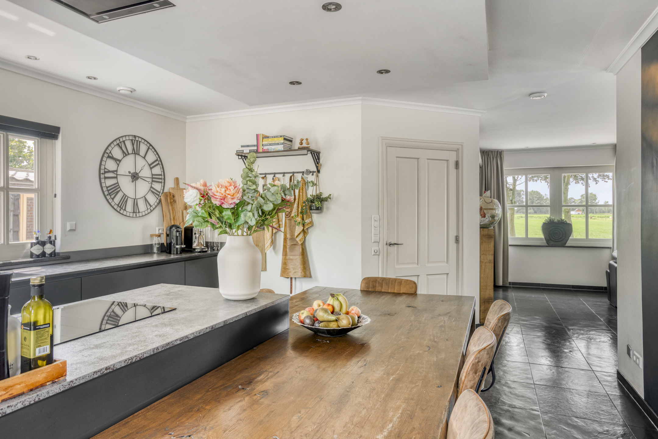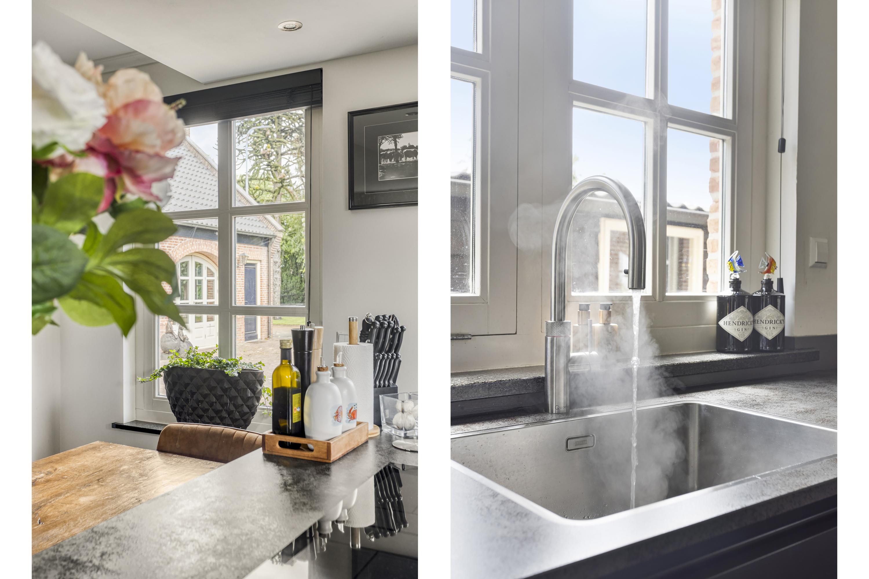 open woonkeuken waarin geplaatst een in de lengte opgestelde inbouwkeuken uit 2019 met kookeiland en vaste keukentafel, voorzien van een composiet aanrechtblad en een spoelbak, inbouw inductiekookplaat, -koeler, -combi oven/magnetron, -vaatwasser, afzuigkap en Quooker, wandafwerking stucwerk, natuurstenen vloer, plafond afgewerkt met stucwerk voorzien van inbouwspots;