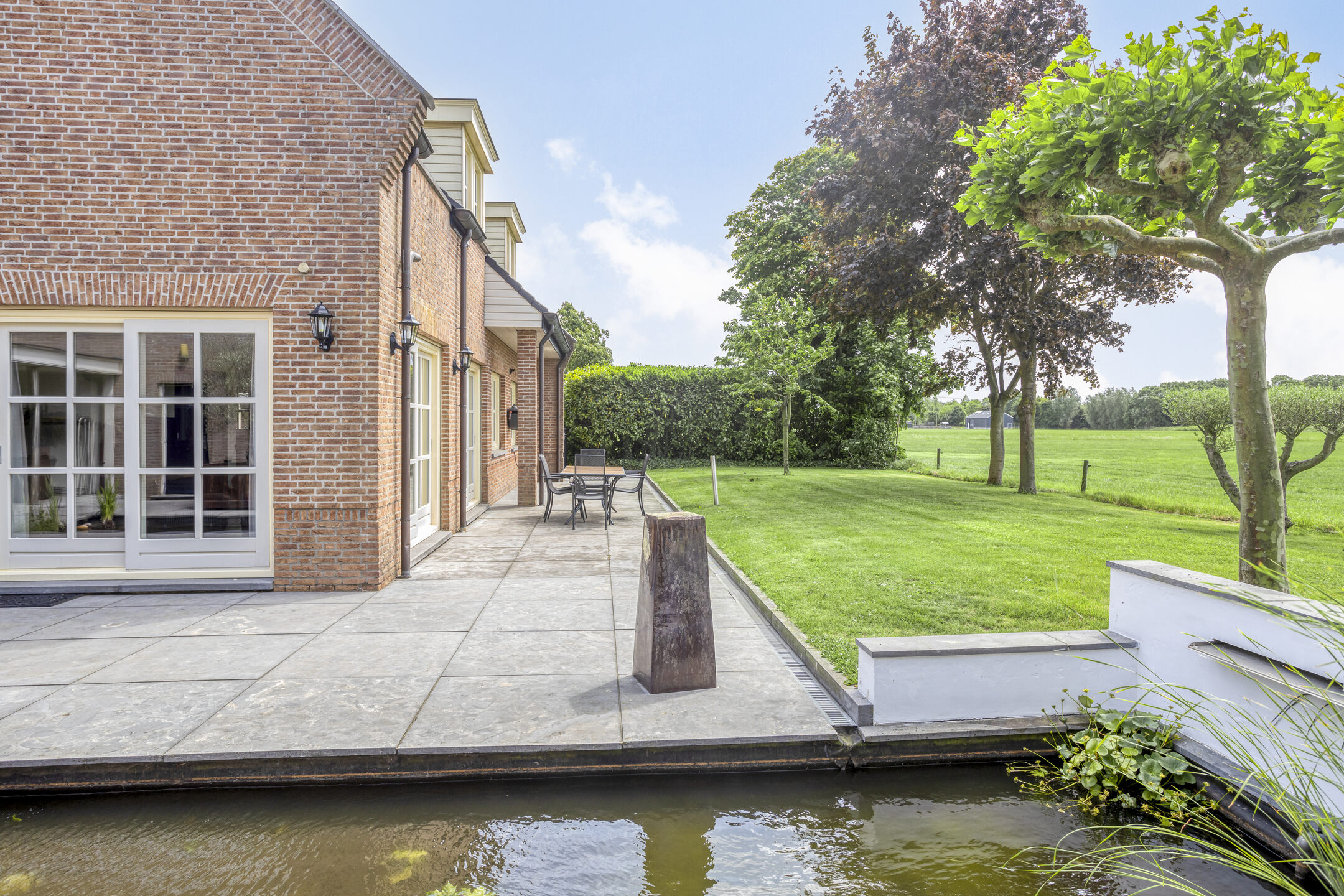 Aangelegde tuin rondom, terras bestraat met natuursteen, voorzien van een veranda tussen woning en loods, borders, gazon, vijverpartij, vrij uitzicht over de landerijen, vrij pad langs de woning t.b.v. achterom, lange oprijlaan overlopend in voorterrein als aangelegd met gebakken klinkers vv. straatkolken, deels betonklinkers en een groen plein, grotendeels omheind vv. elektrische poort met beeldcamera.