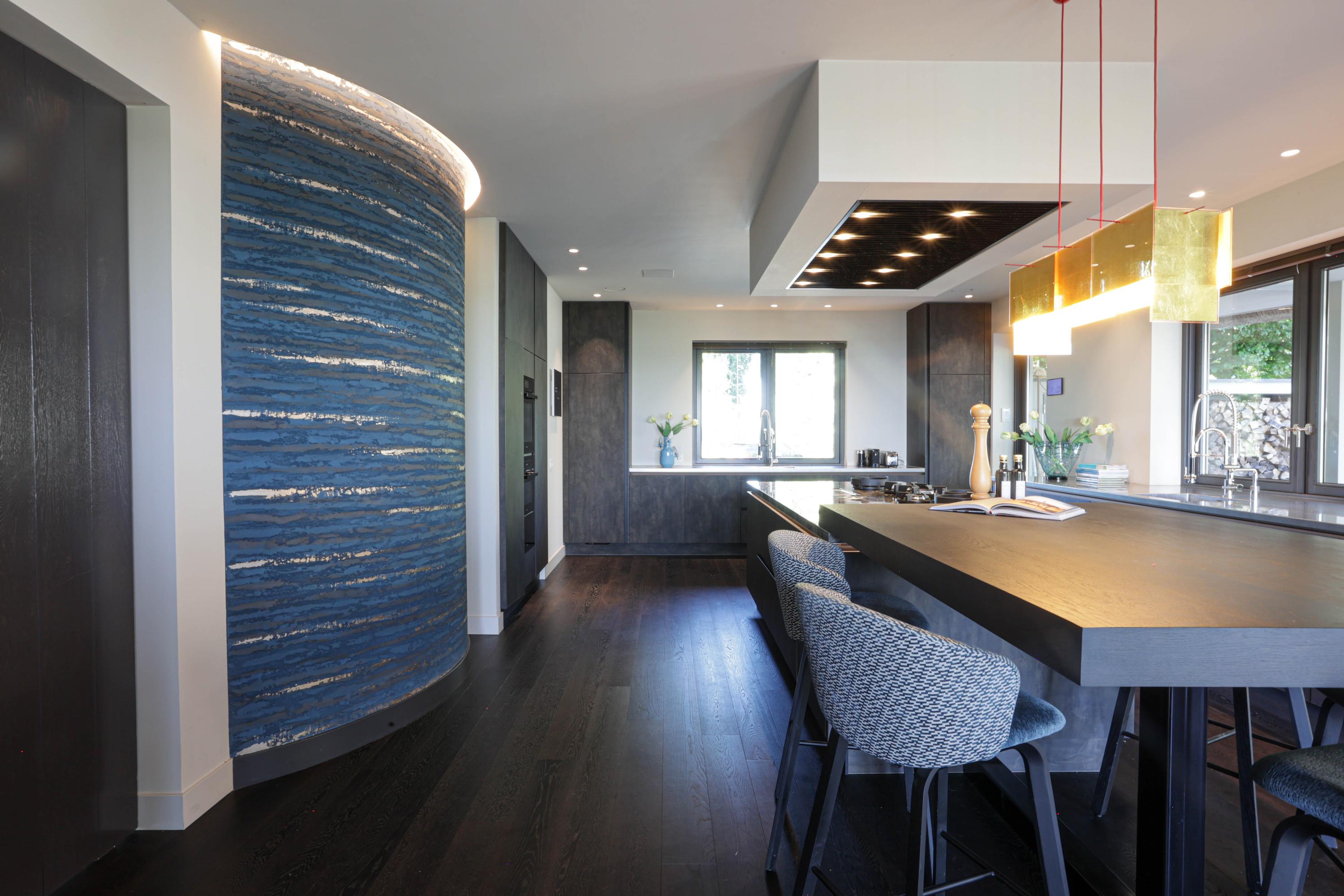 Advancing along the driveway, the experience gently unfolds—a landscape of mature gardens, a full tennis court, and the discreet entry give way to a reception hall shaped by organic lines and understated grandeur. In the main residence, sightlines lead through the dining room to the terraces, the water, and the horizon beyond. The kitchen centers around a marble-topped island with professional Miele appliances, designed to impress yet remain livable.