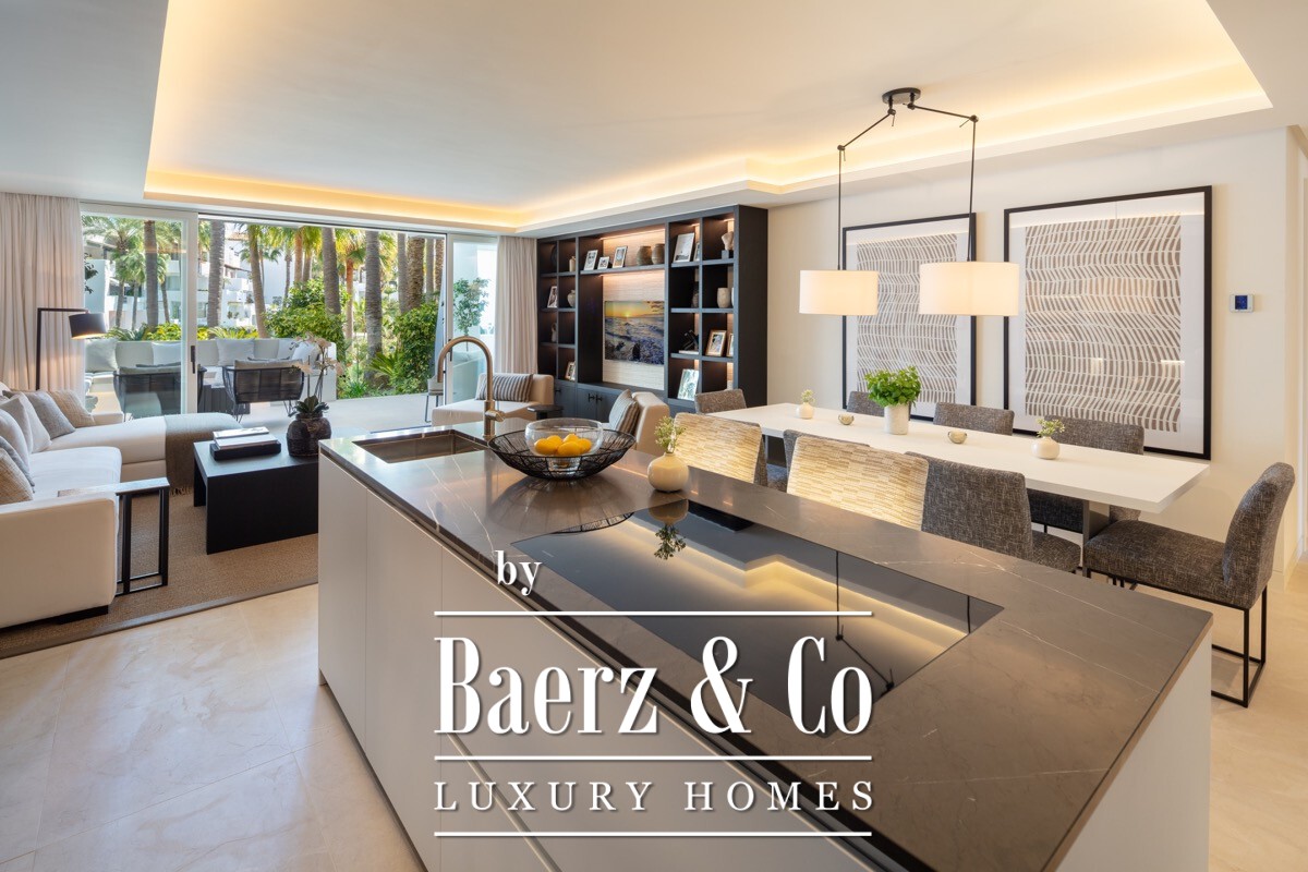 Apartment Marbella is presented at the heart of the five star Puente Romano resort, distinguished by a meticulous renovation that elevates everyday living. The living area spans 138 m², designed with an open plan arrangement that channels natural light throughout the south facing interior. A custom kitchen, crafted with oak cabinetry and Gaggenau appliances, merges seamlessly with the lounge, flowing onto a private terrace set against curated communal gardens.