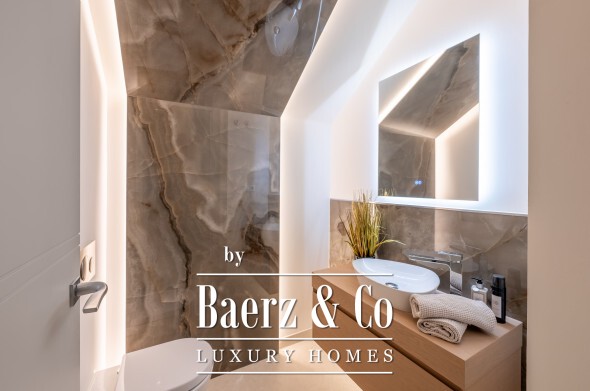 Outdoor living is integral here. Two distinct gardens, a saltwater infinity pool, and a jacuzzi offer seamless transitions between indoor elegance and the lush outdoors. The solarium, designed with a small garden, provides 360º views over the sea, golf course, and mountains. With the possibility of an elevator from basement to solarium, every level is accessible and inviting.