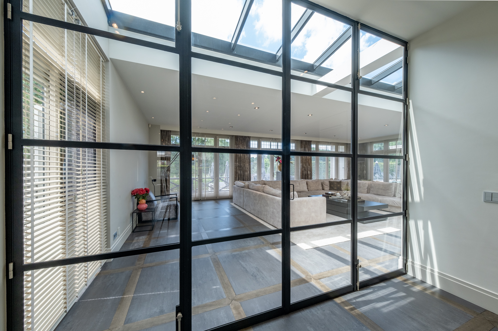 From the moment you enter, the grandeur is evident: a spacious hall with a stately staircase, an inviting L-shaped living room with glass ceiling panels, and a cozy work corner. The Eggersman designer kitchen is a true showpiece, equipped with a large cooking island, Viking appliances, and a stylish gas fireplace. A floor-to-ceiling steel façade visually connects the kitchen to the living room, while still providing the luxury of a separate space. Additional features include a basement, double indoor garage, and a multifunctional wing – ideal as a guesthouse, office, or au-pair apartment.