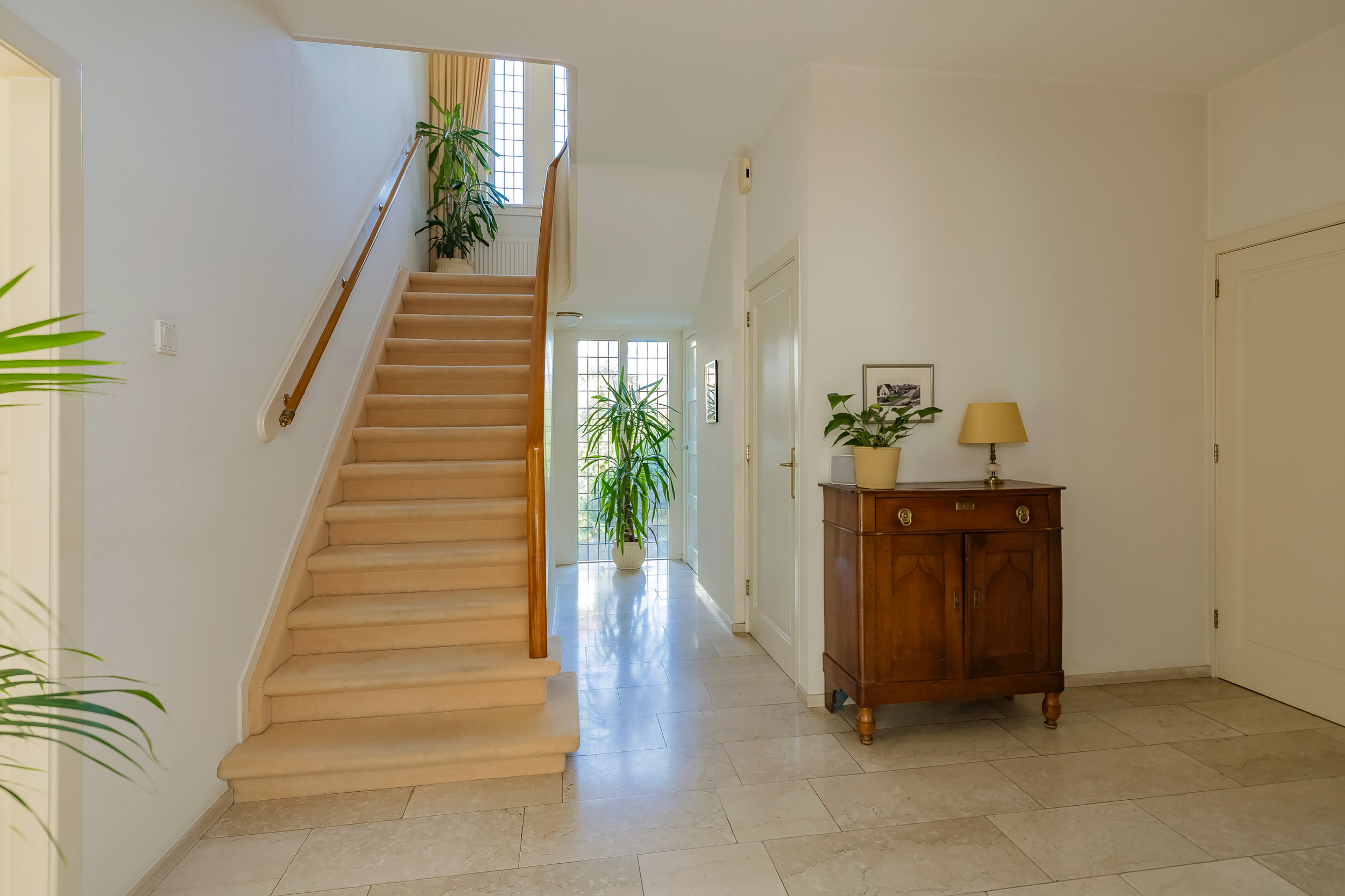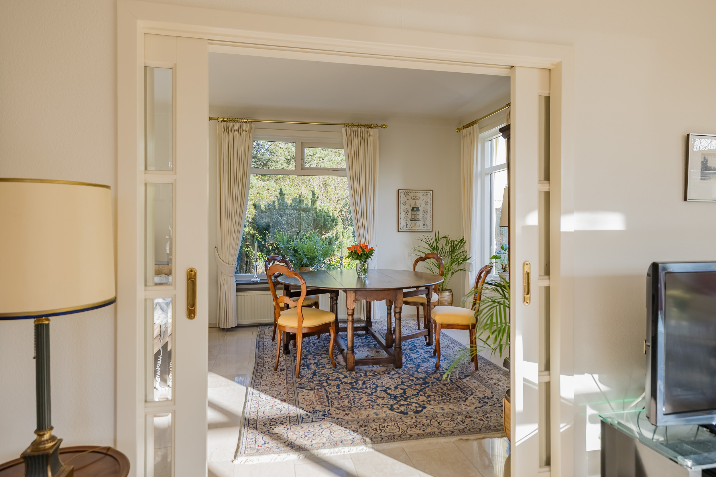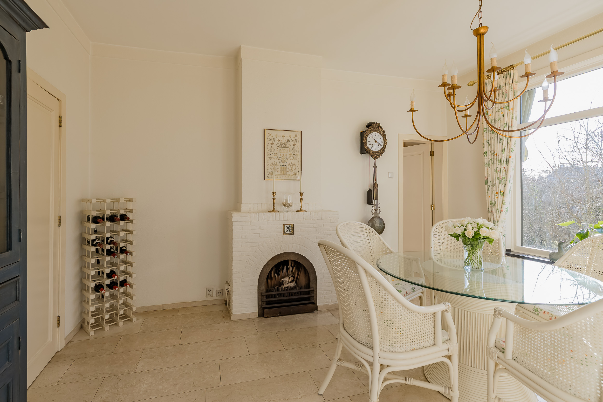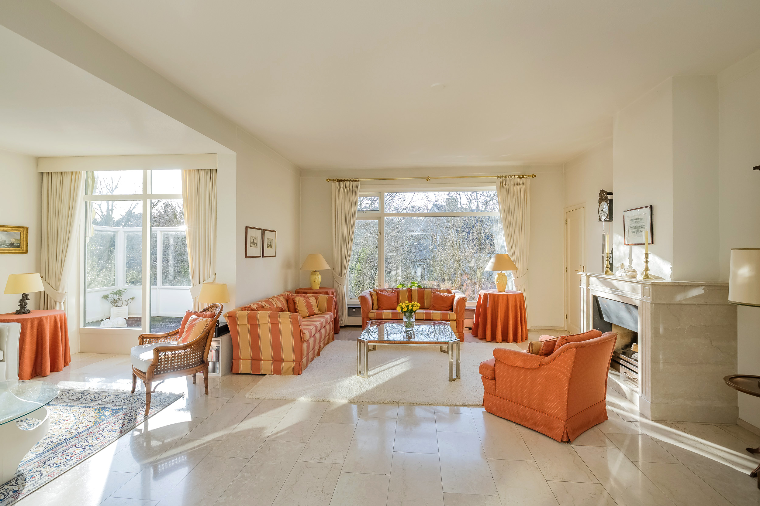The spacious living room is a delightful living space with a warm, inviting atmosphere. The fireplace and elegant marble floor give the room character, while the doors from the living room provide direct access to the garden. The sun circles the house from morning to evening, creating a beautiful play of light.