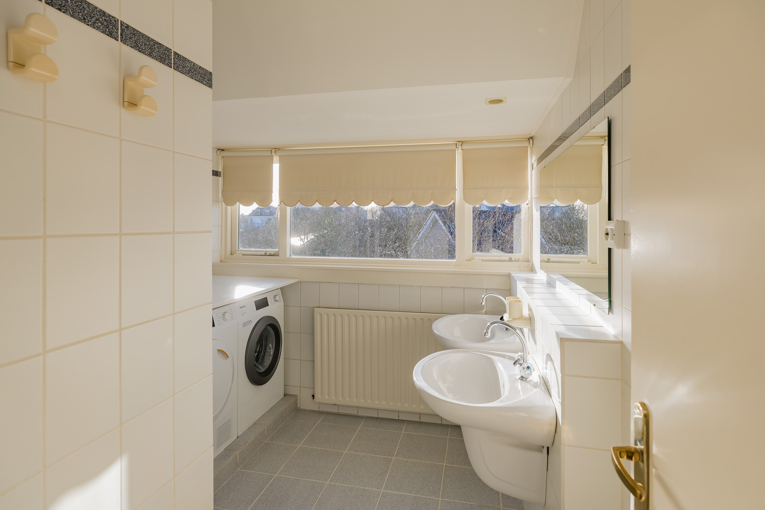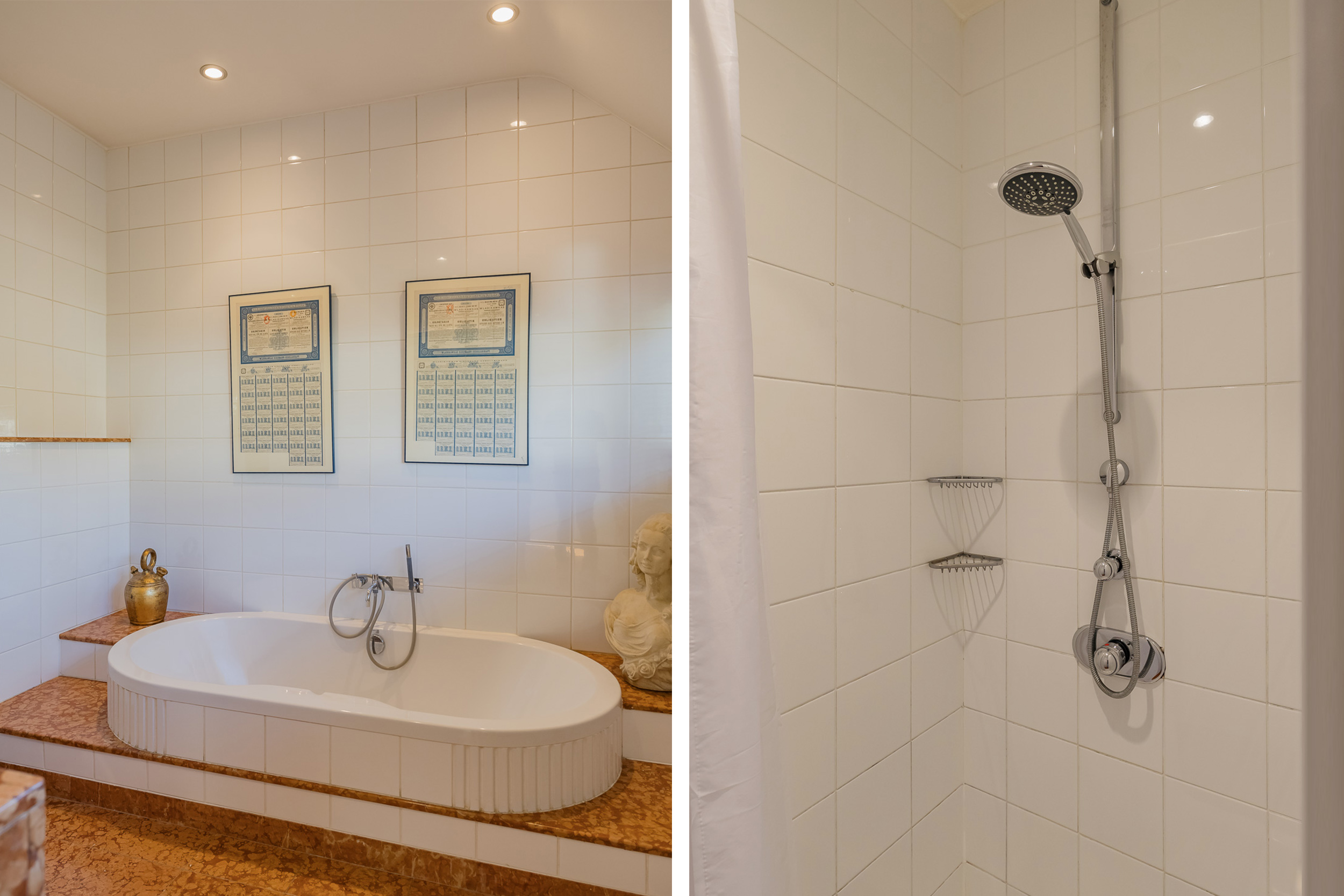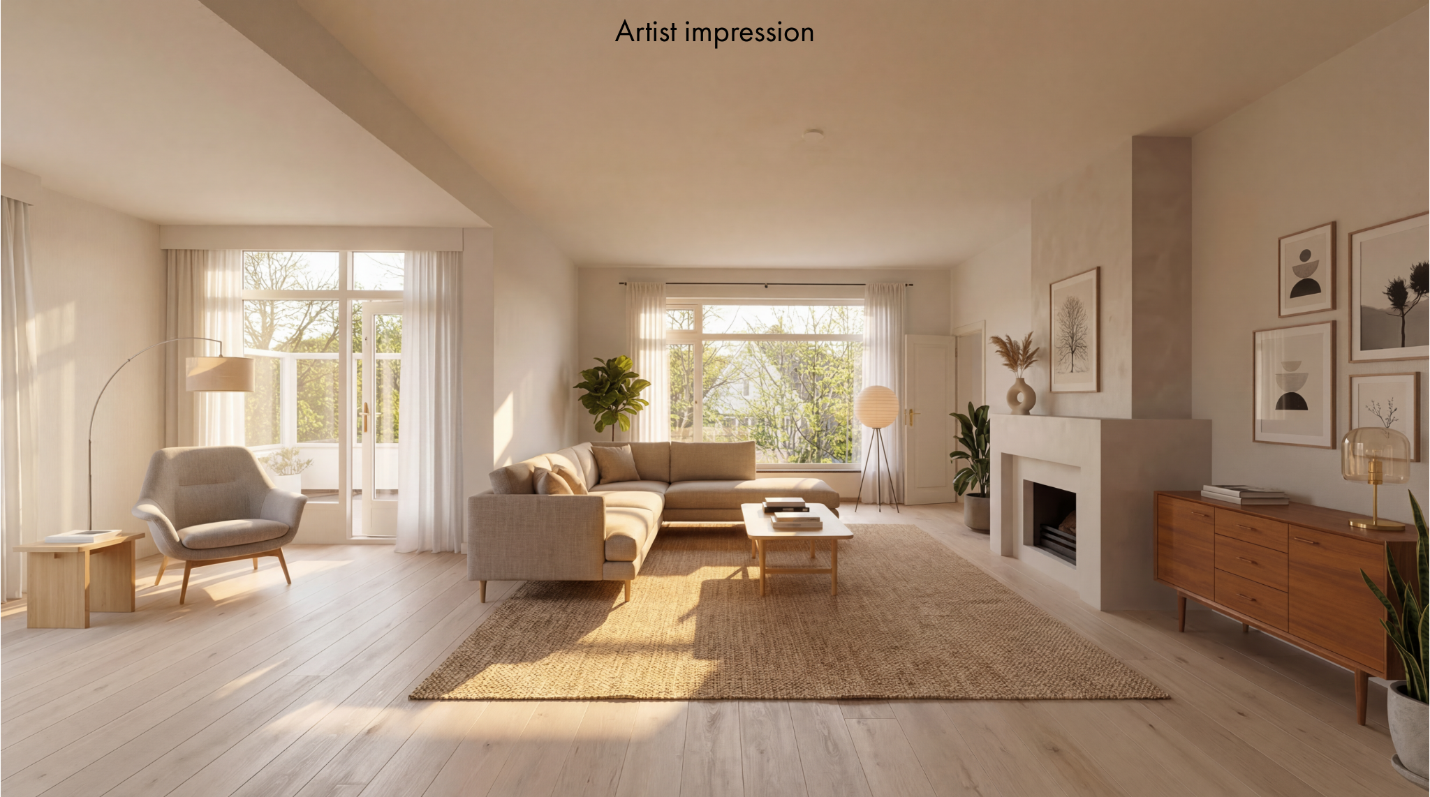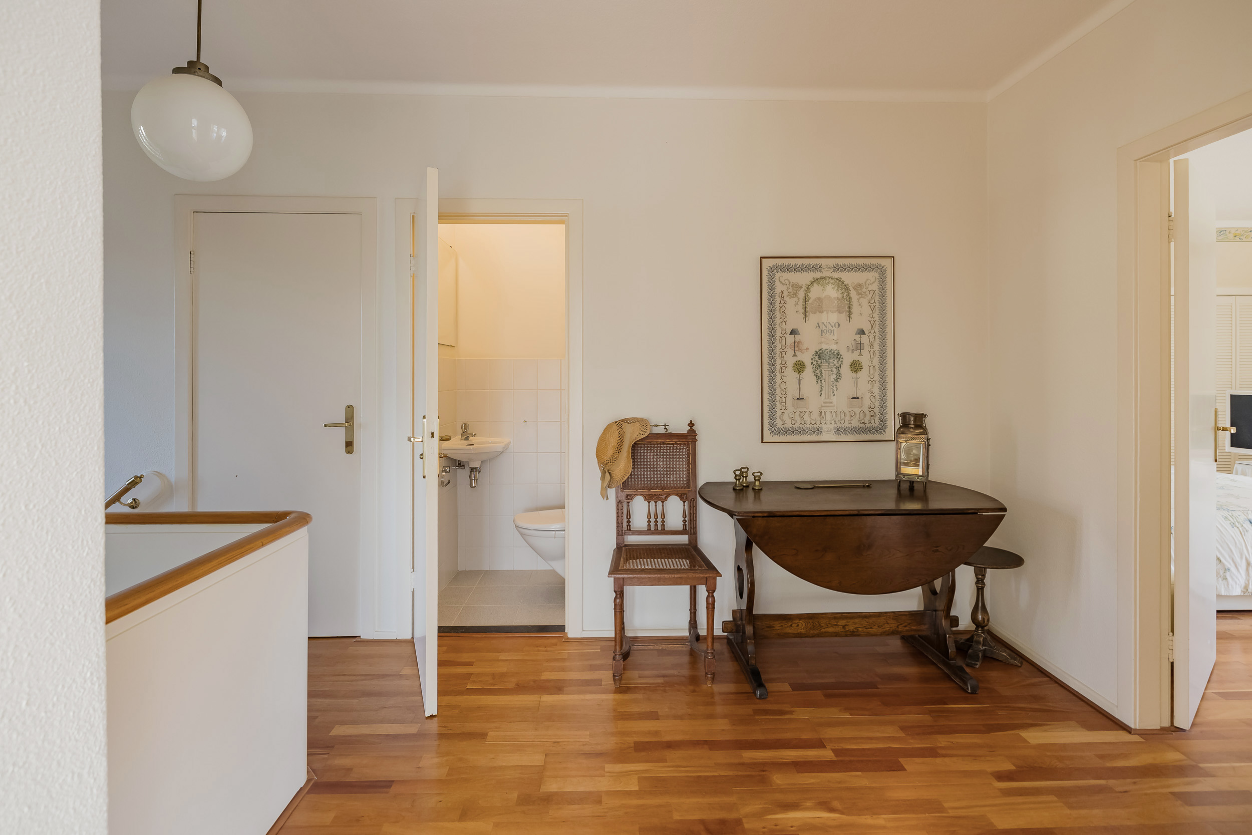 The spacious living room is a delightful living space with a warm, inviting atmosphere. The fireplace and elegant marble floor give the room character, while the doors from the living room provide direct access to the garden. The sun circles the house from morning to evening, creating a beautiful play of light.