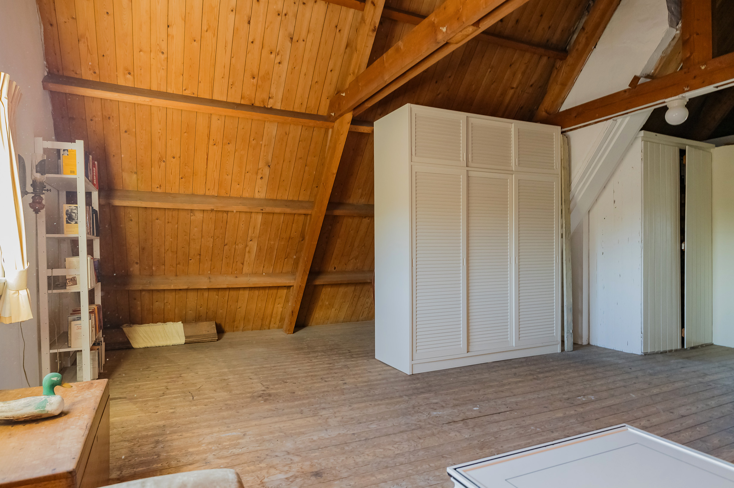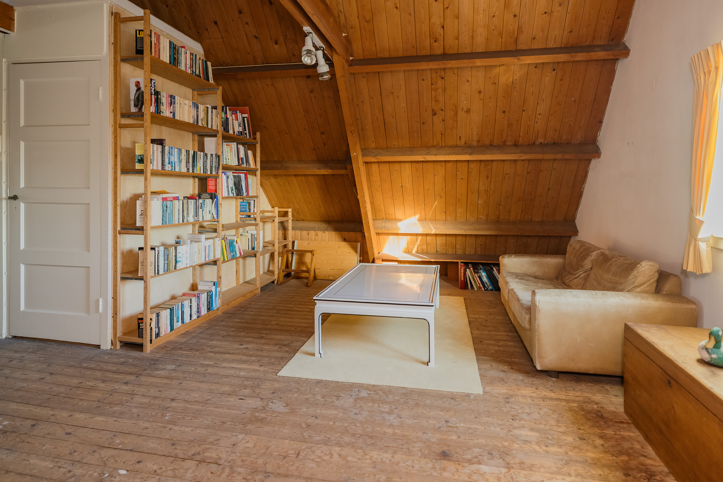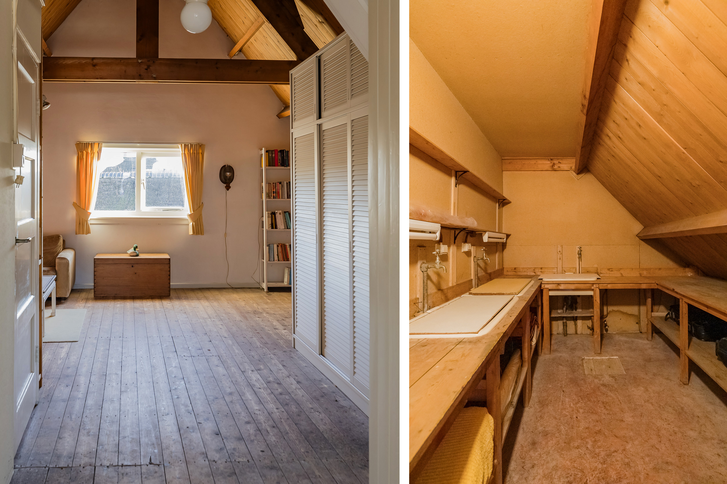 The staircase leads to a surprisingly spacious floor with a large landing/multifunctional room and a fifth bedroom with its own sink and deep closet. You will also find a darkroom here.