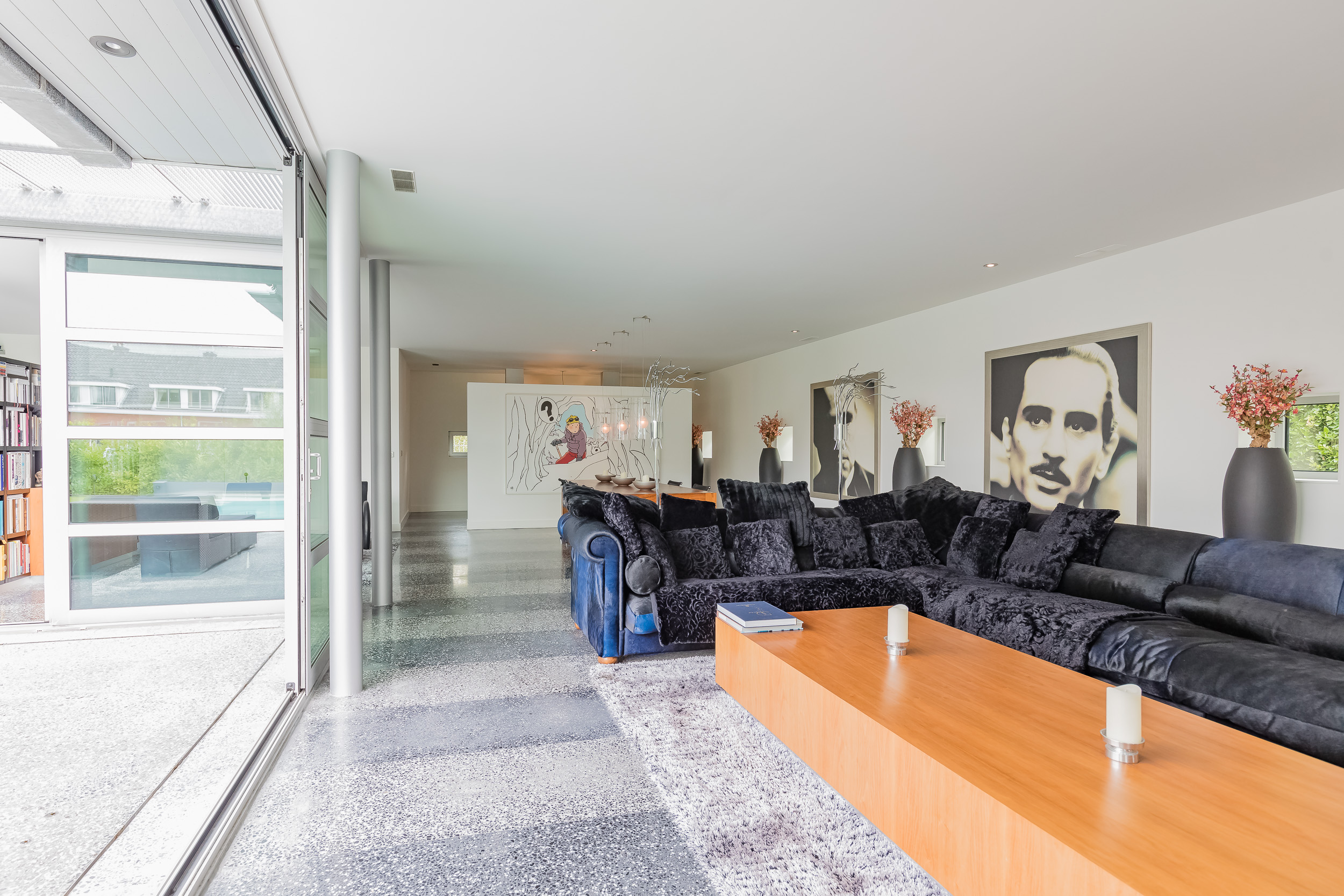 The indoor garage of 76 m2 is fully insulated and also here the terrazzo floor has floor heating. The glass inner wall is easily removed so that the entire first floor becomes one space. The living area thus comes to 356m2 (€ 7.008,43 m2)