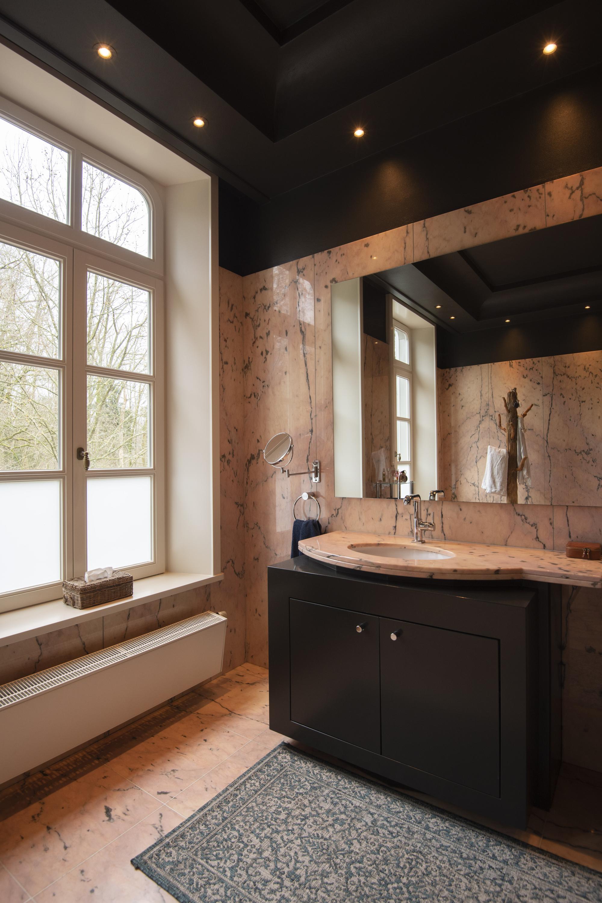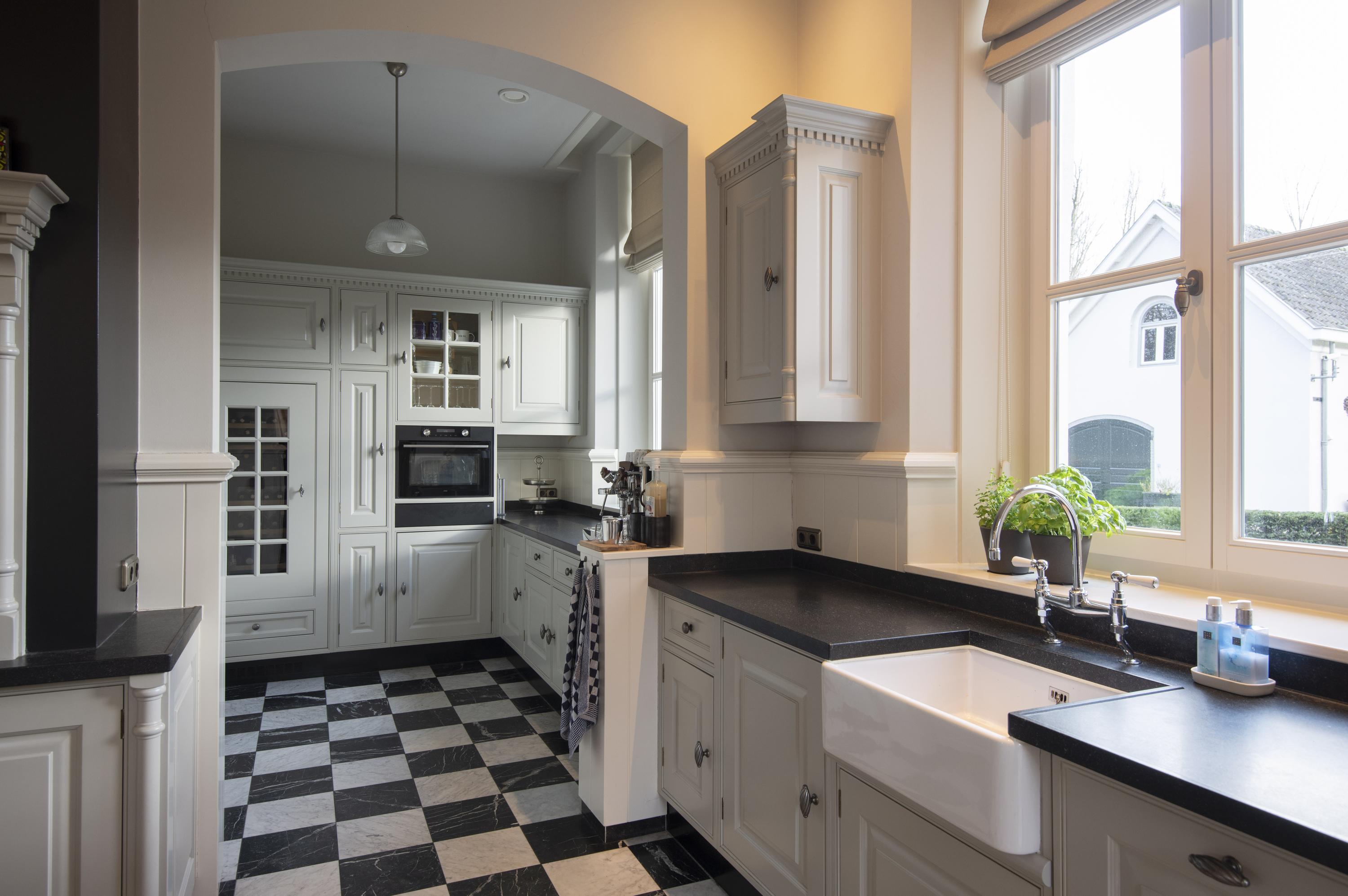 The completely nature-oriented living room consists of a sitting room and a dining room. There are two fireplaces and four pairs of French doors to the garden. The 3.60m high stucco ceilings combined with the amount of light through the high windows create a magnificent spatial experience. Double doors lead into the cozy eat-in kitchen. This fully equipped kitchen is furnished with a classic Tinello kitchen unit with a natural stone worktop, sink island and high-quality appliances. In the tower adjacent to the kitchen diner is a pantry. In the living kitchen are two pairs of double doors to the garden. The entire first floor has underfloor heating.