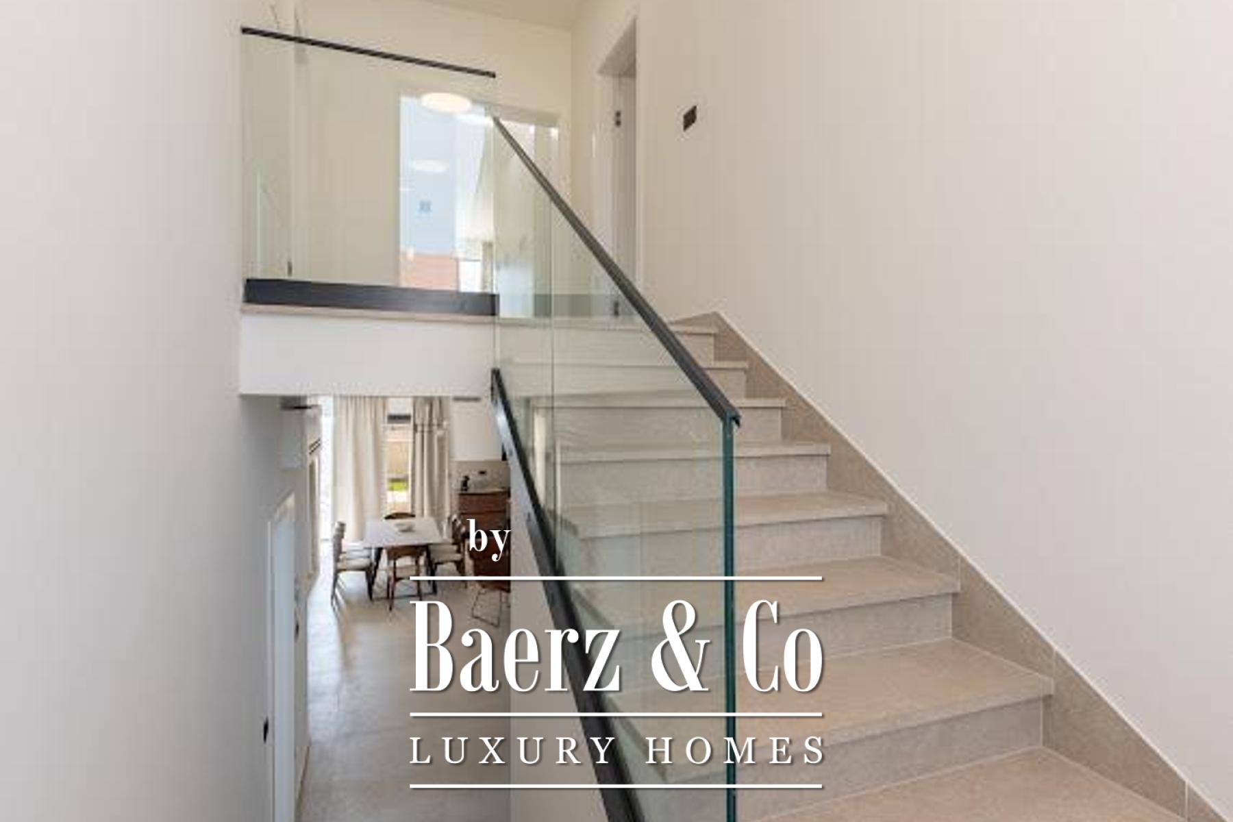 The ground floor’s open-concept kitchen, dining, and living spaces flow seamlessly, complemented by a bedroom with en-suite bath, a guest toilet, laundry, and storage. Ascending the internal stairs, the upper floor reveals an entrance hall, three additional bedrooms each with bathrooms, and a spacious terrace that invites outdoor living.