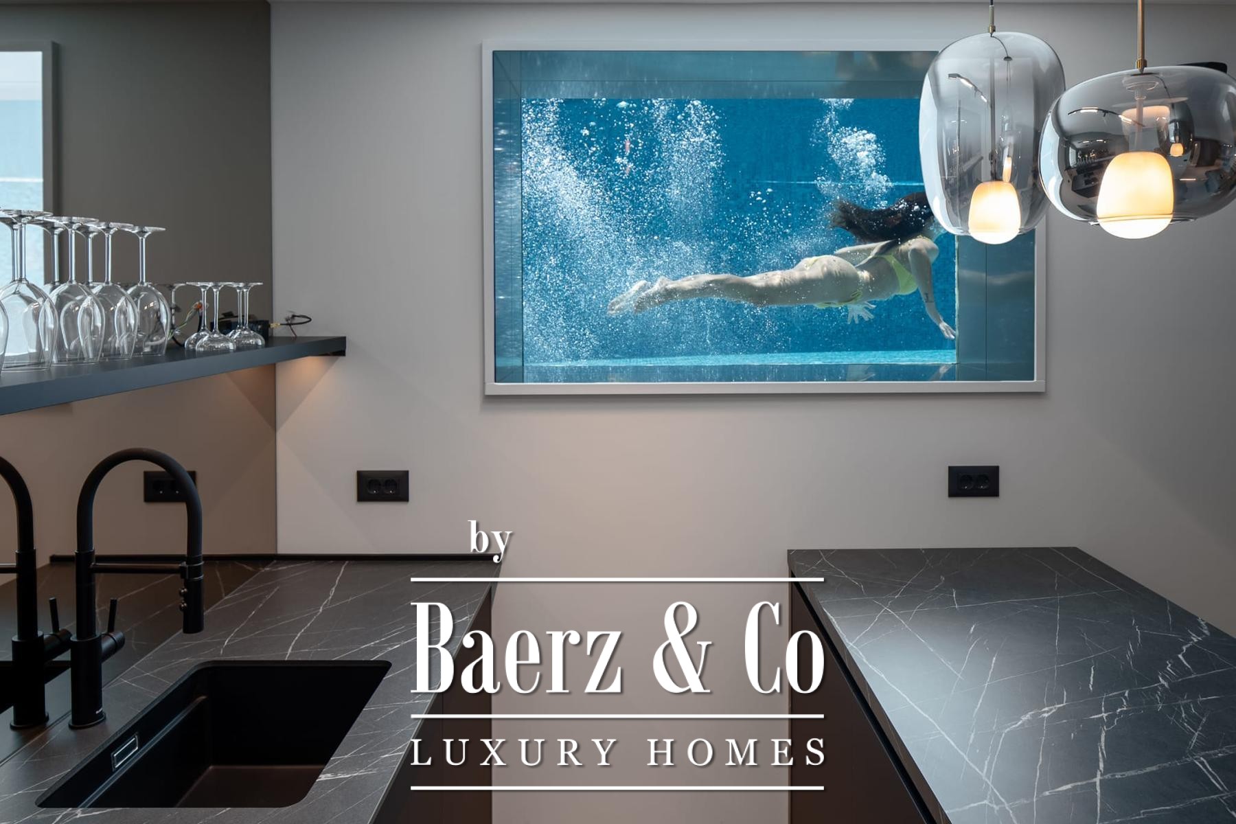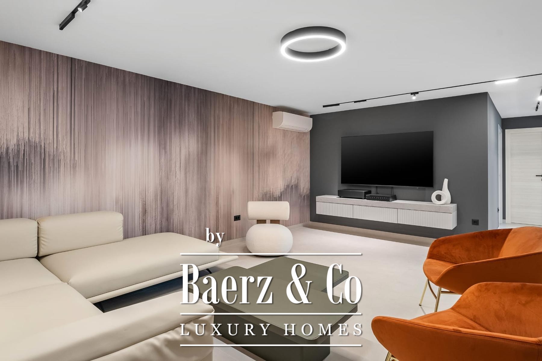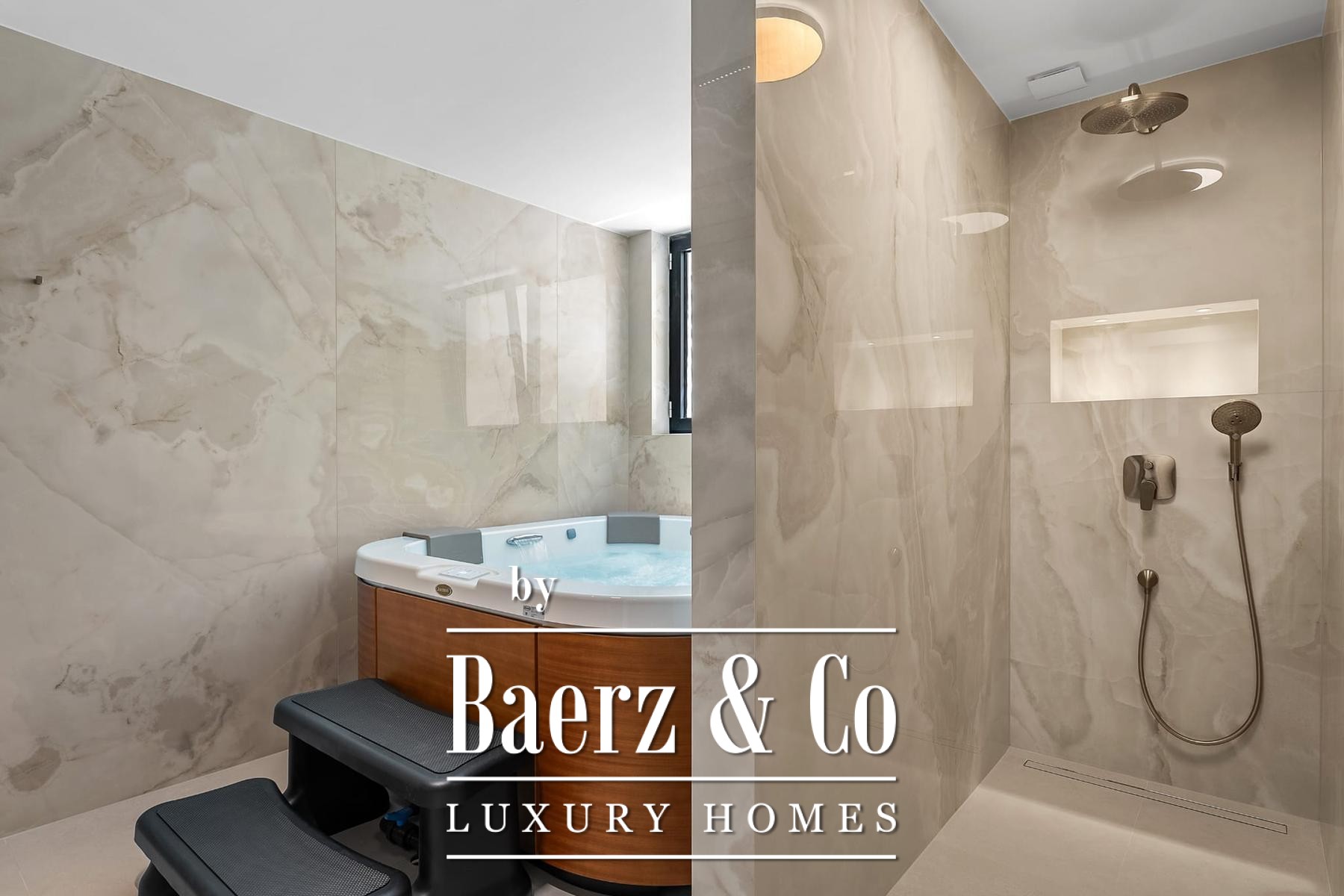 The ground floor flows seamlessly from its open-plan living, dining, and kitchen space onto two partially covered terraces, one of which hosts an outdoor summer kitchen, while a large sundeck introduces the 36 m² infinity pool with massage waterfall. On the lower level, a fun room, sauna, and mini kitchen create a setting for both relaxation and entertaining, complemented by technical rooms and a double garage. The residence reflects high energy efficiency, with solar hot water, integrated LED stone staircase, and advanced filtration systems.