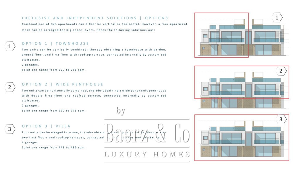 The architecture is distinguished, with each residence featuring living spaces between 104 and 200 m², generous panoramic terraces, private gardens, and bespoke high-end finishes. The quality and elegance of these properties are present in every line and material.
