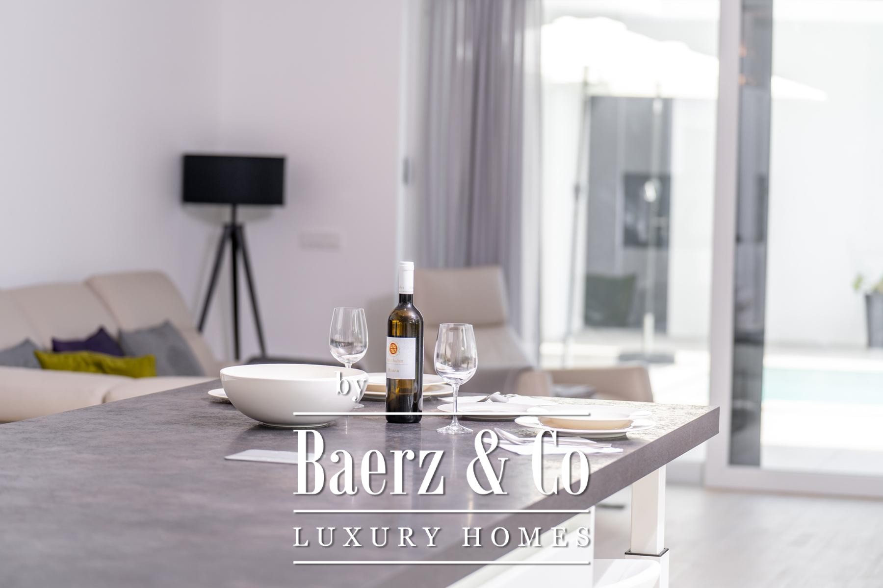 The villa, a modern ground-floor residence with a flat roof and 400 m² of interior space, is engineered to mitigate wind and rainfall. Exterior walls combine 38 cm of clay block masonry, 12 cm thermal insulation, and Baumit finishing, ensuring optimal energy performance. With two bedrooms, two bathrooms, and a ceiling height of 303 cm, the living experience is quietly expansive and filled with natural light. Large glass walls are shaded in summer by broad roof overhangs, while in winter, the sun’s lower arc gently warms the core spaces.