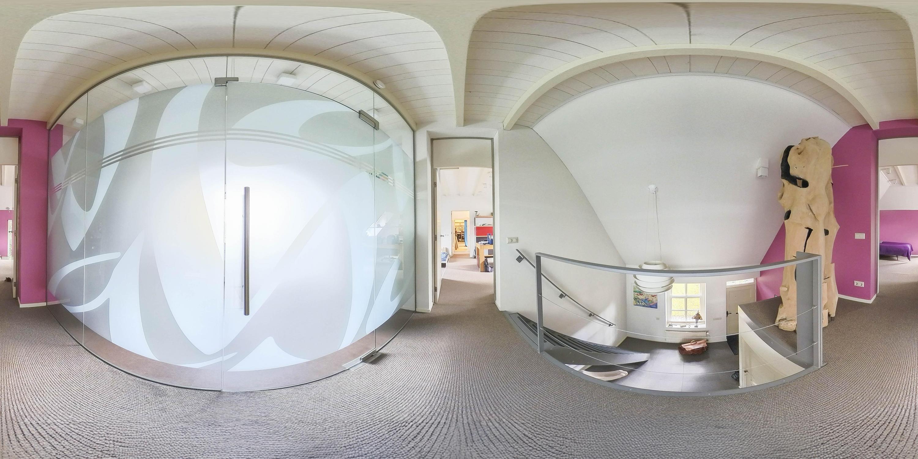 Upon entering the entrance hall, you will immediately notice the tiled floor with underfloor heating in combination with the sleek plastered walls and plastered ceiling. The beautiful view of the first floor through the loft and staircase to the upper floor is particularly striking. In the hall, you will also find the meter cupboard with a completely renovated interior, equipped with an extensive group layout and three-phase power. The hall also contains a fully tiled toilet with wall-mounted toilet, washbasin, urinal, and mechanical ventilation.