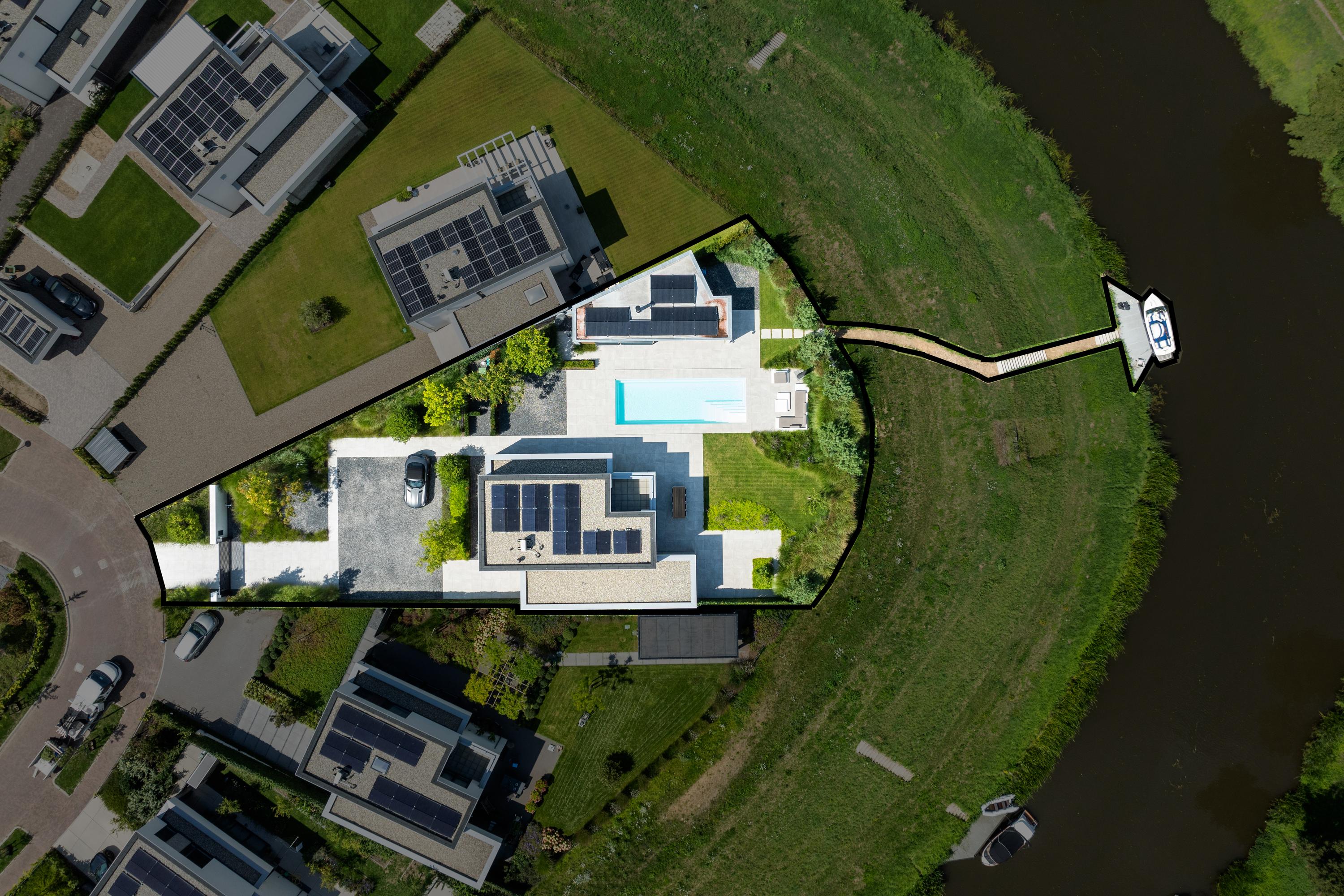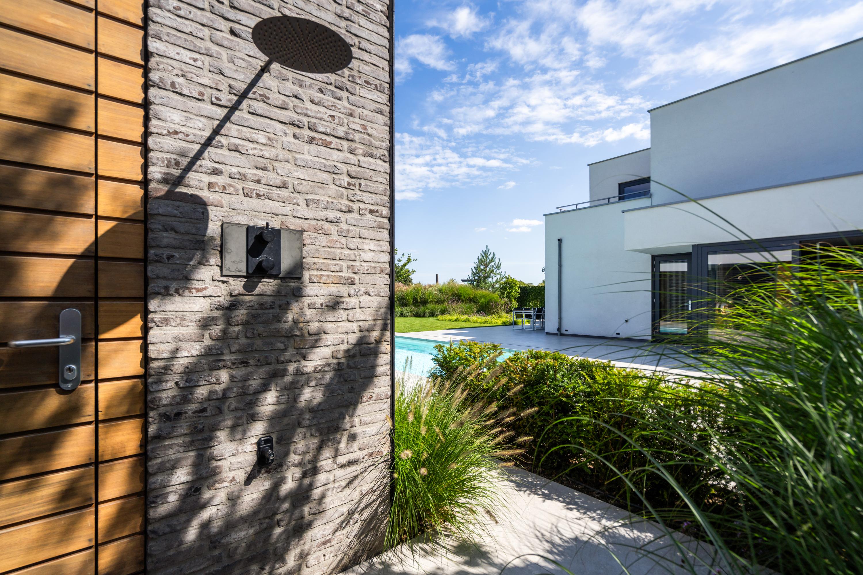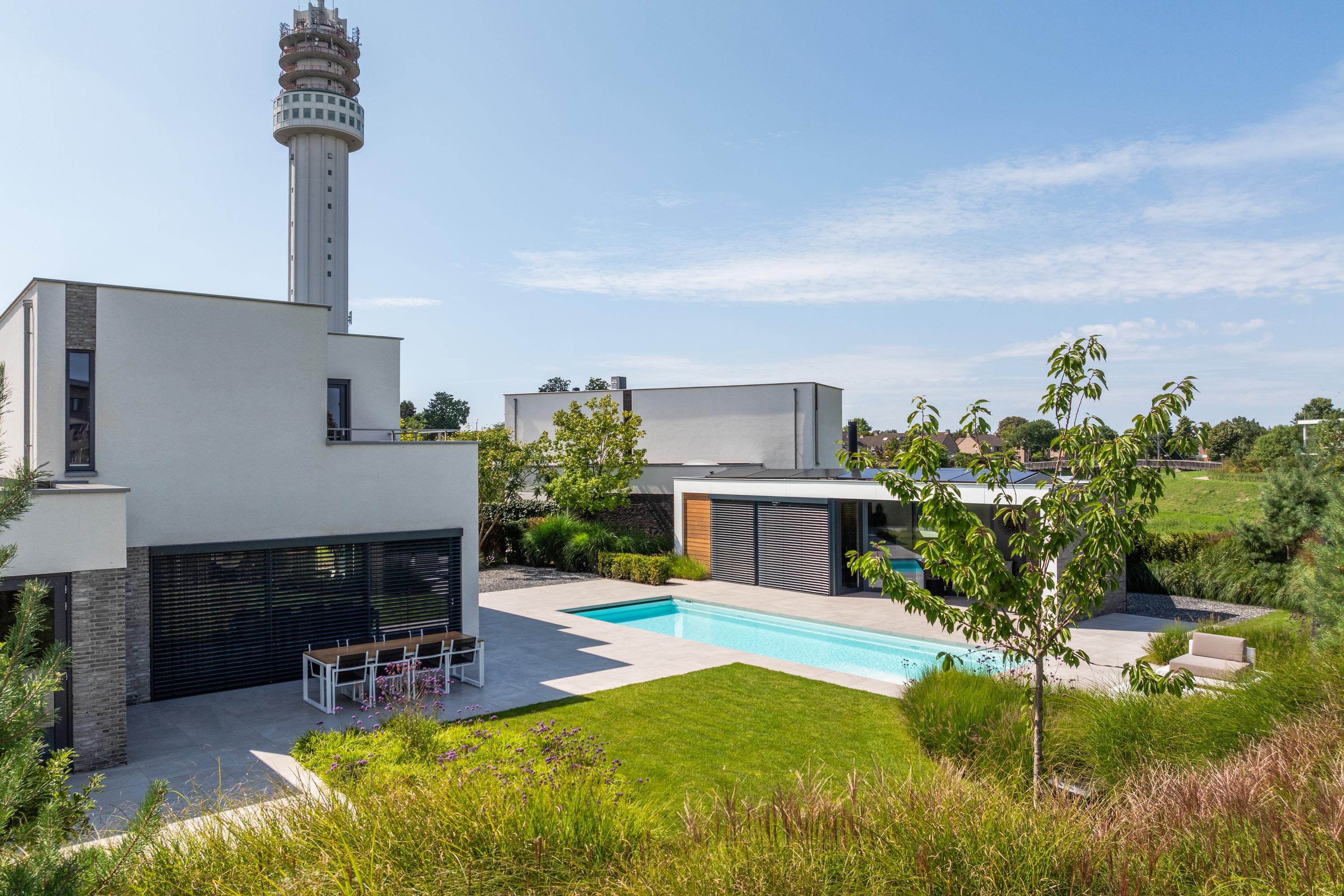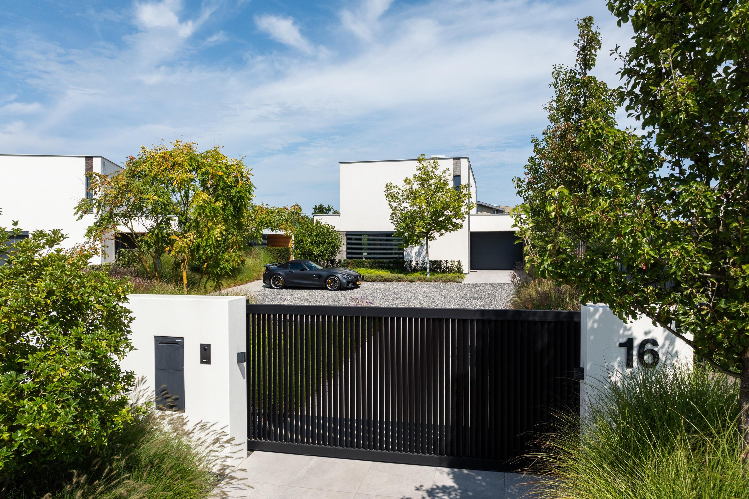 At the front, the villa is embraced by a generous garden that immediately sets the tone for the exclusive character of the property. The carefully designed combination of modern paving and green borders creates a harmonious and refined whole. The private driveway, finished with high?quality tiles and subtle greenery, leads you stylishly to the entrance.